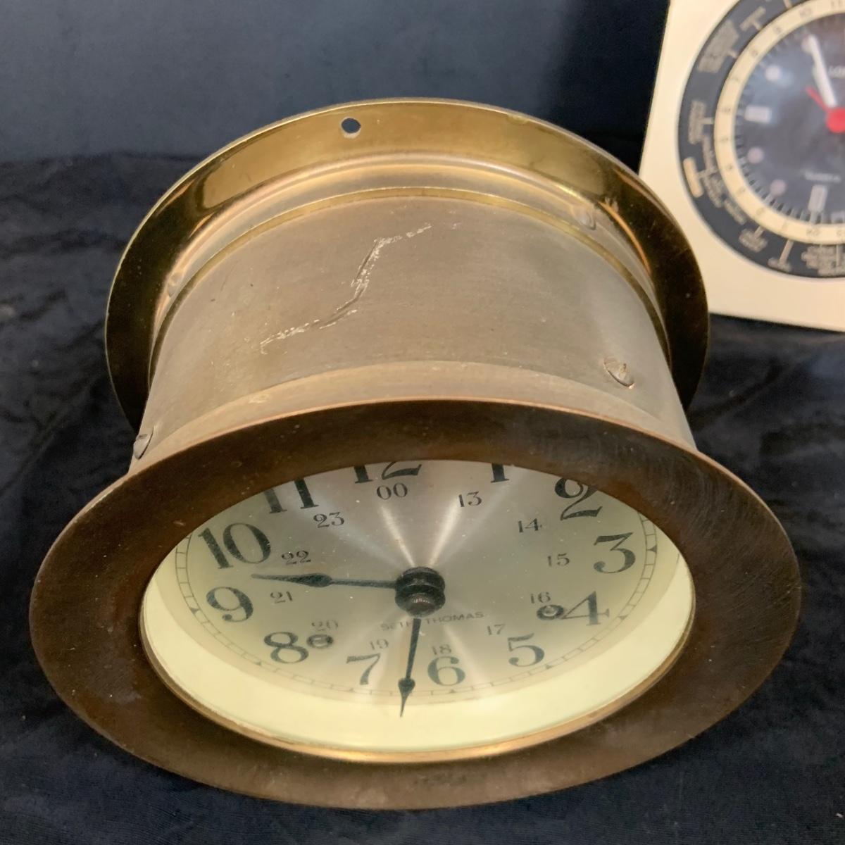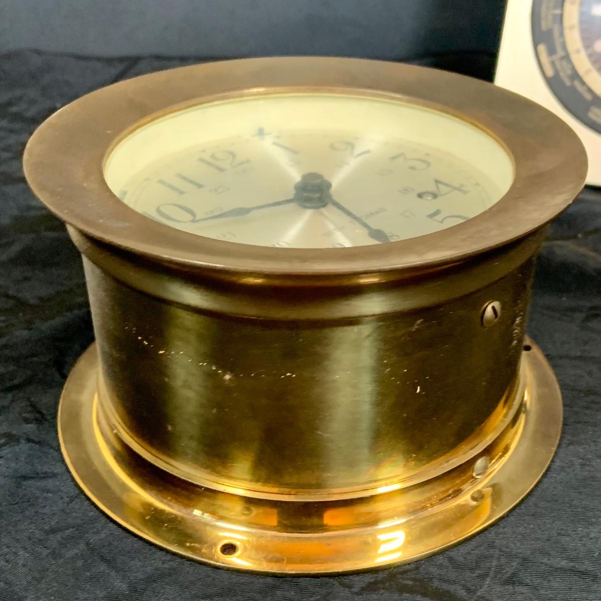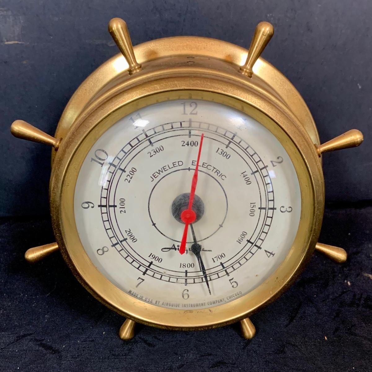 LOT 43: Collection Nautical Instruments Including a Seth Thomas Brass Ships Clock, Brass Ship’s Wheel Barometer and Lorus Quartz World Time Clock