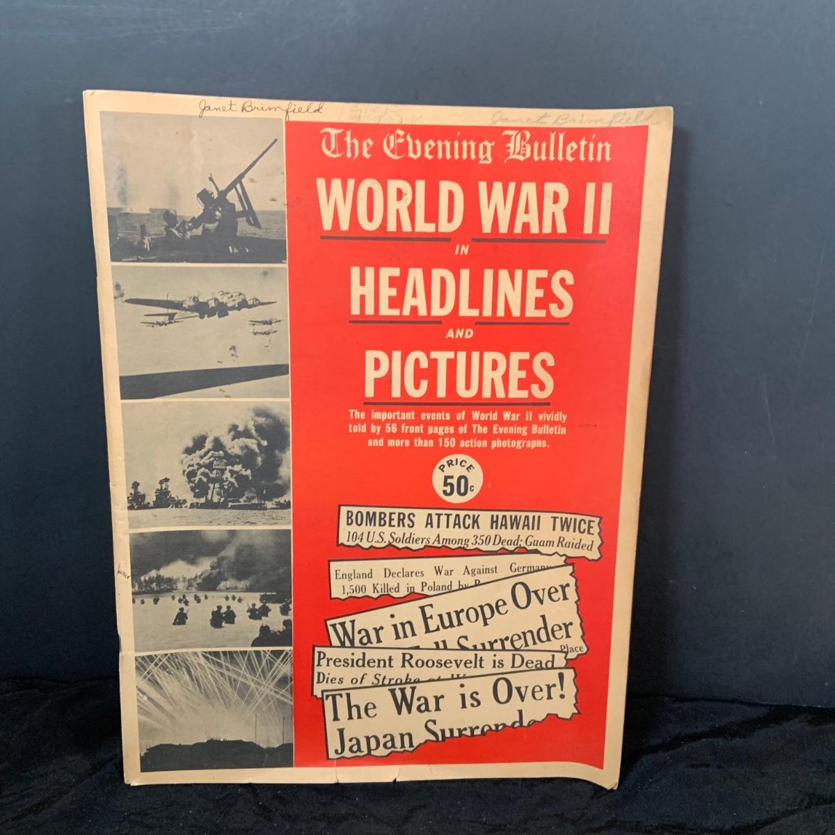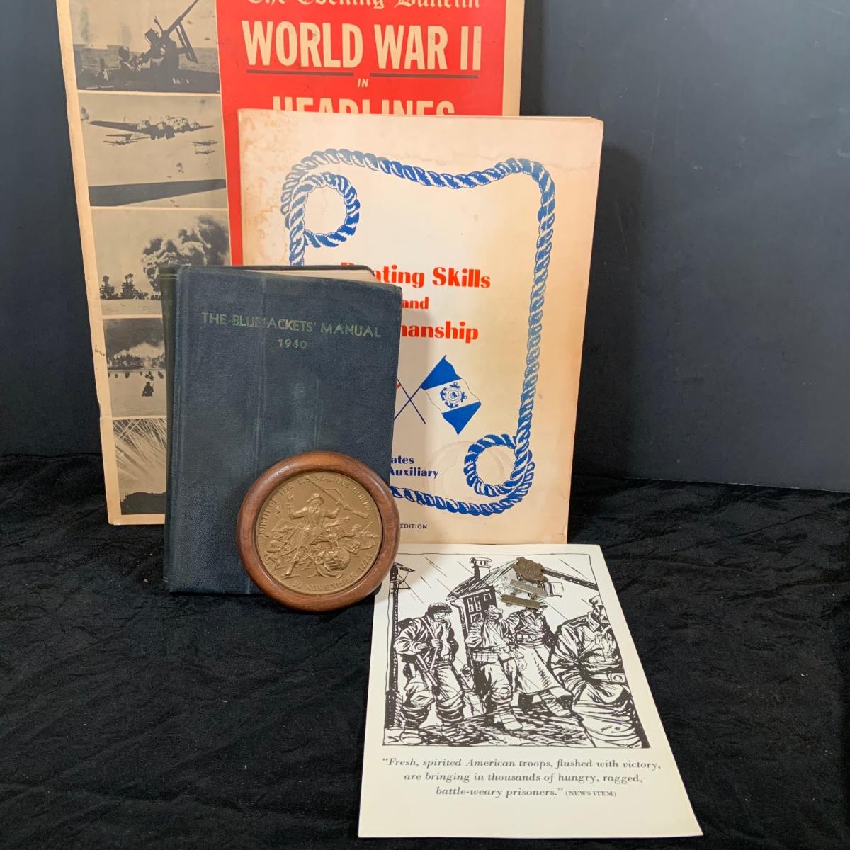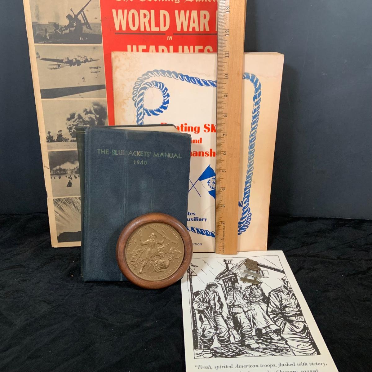 LOT 52 Military Collection Including WWIi Headlines Book,Coast Gaurd Boating Skills Book, 1940 Navy BlueJacket Manual, Metal and More