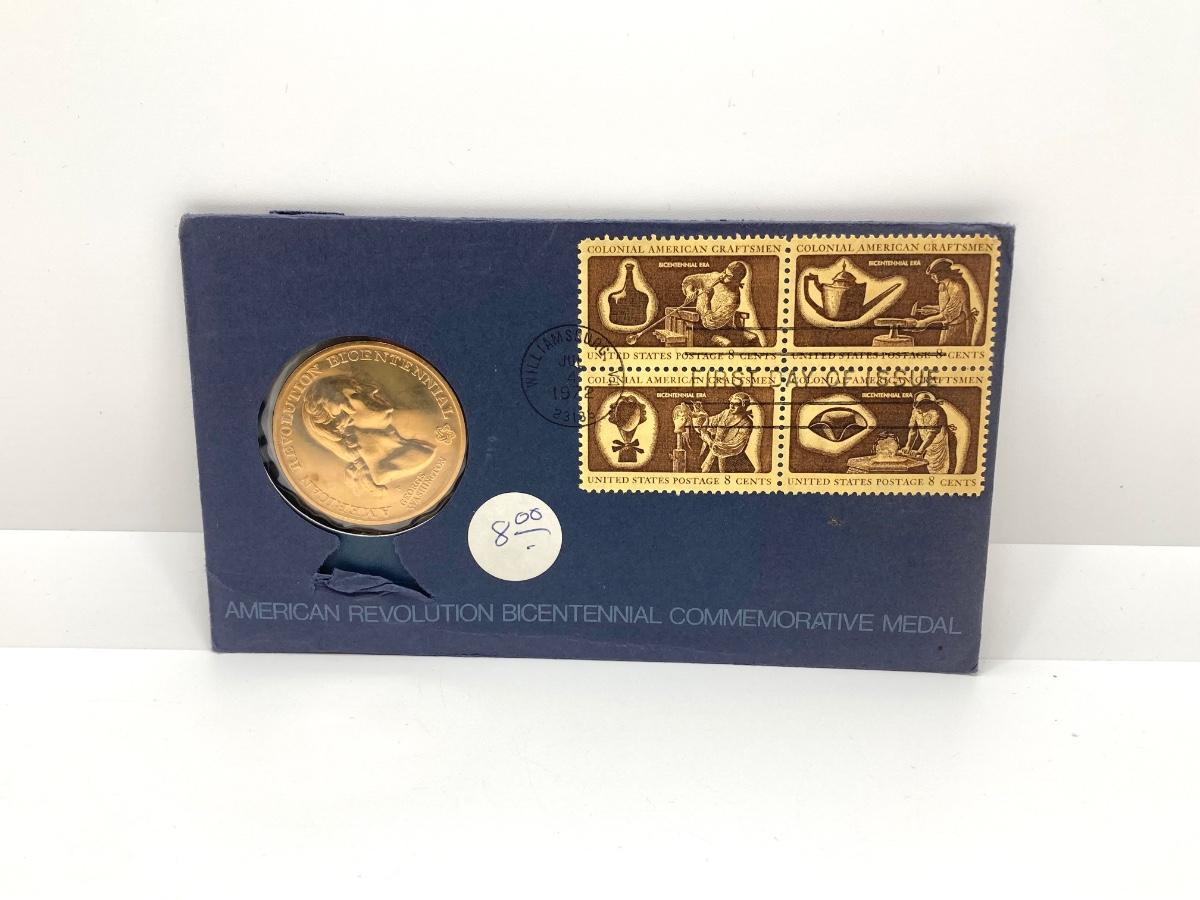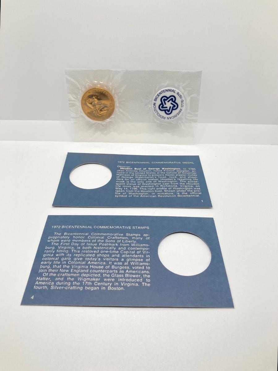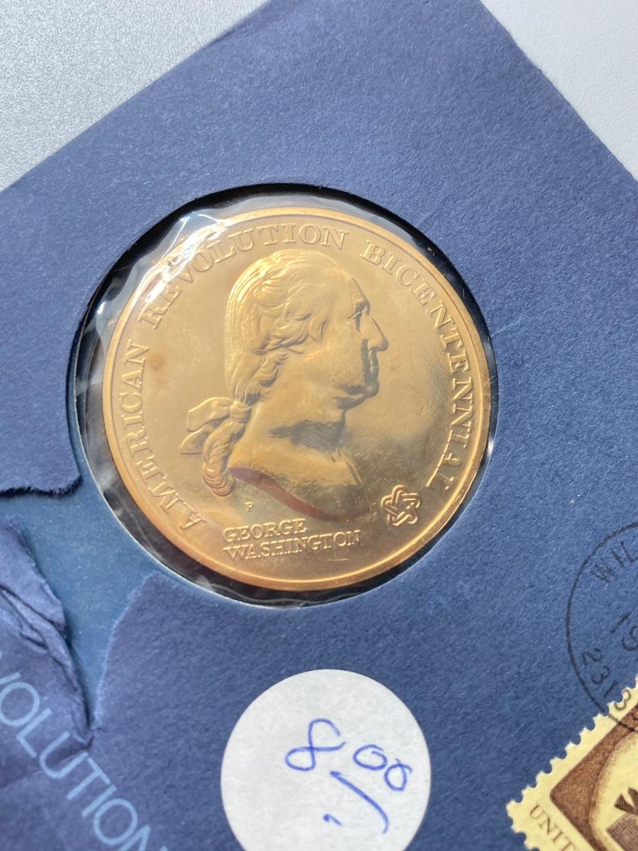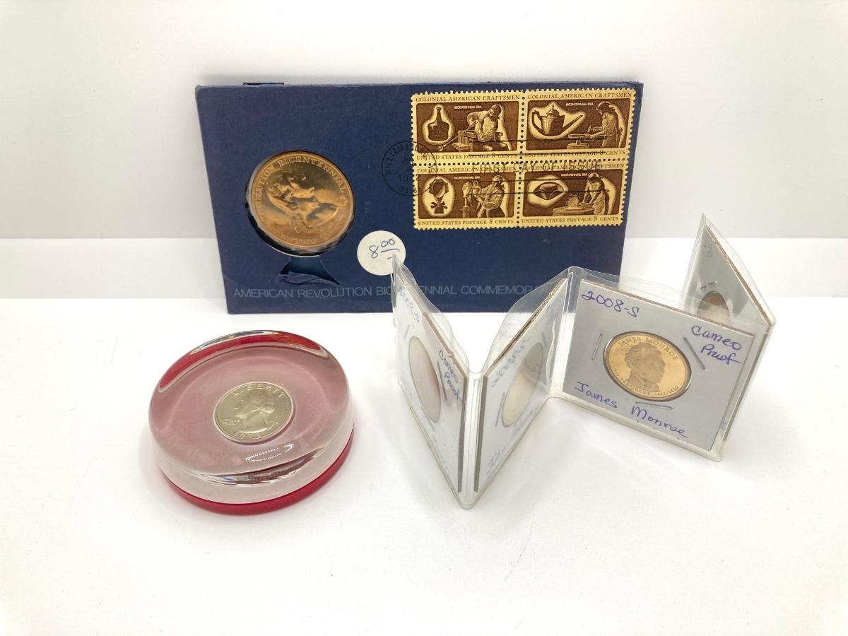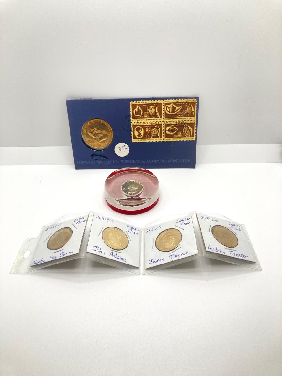 LOT 60: American Revolution Bicentennial Commemorative Medal, Four 2008-S Proof Presidential $1 Dollar Coins and 1979 Quarter Paper Weight
