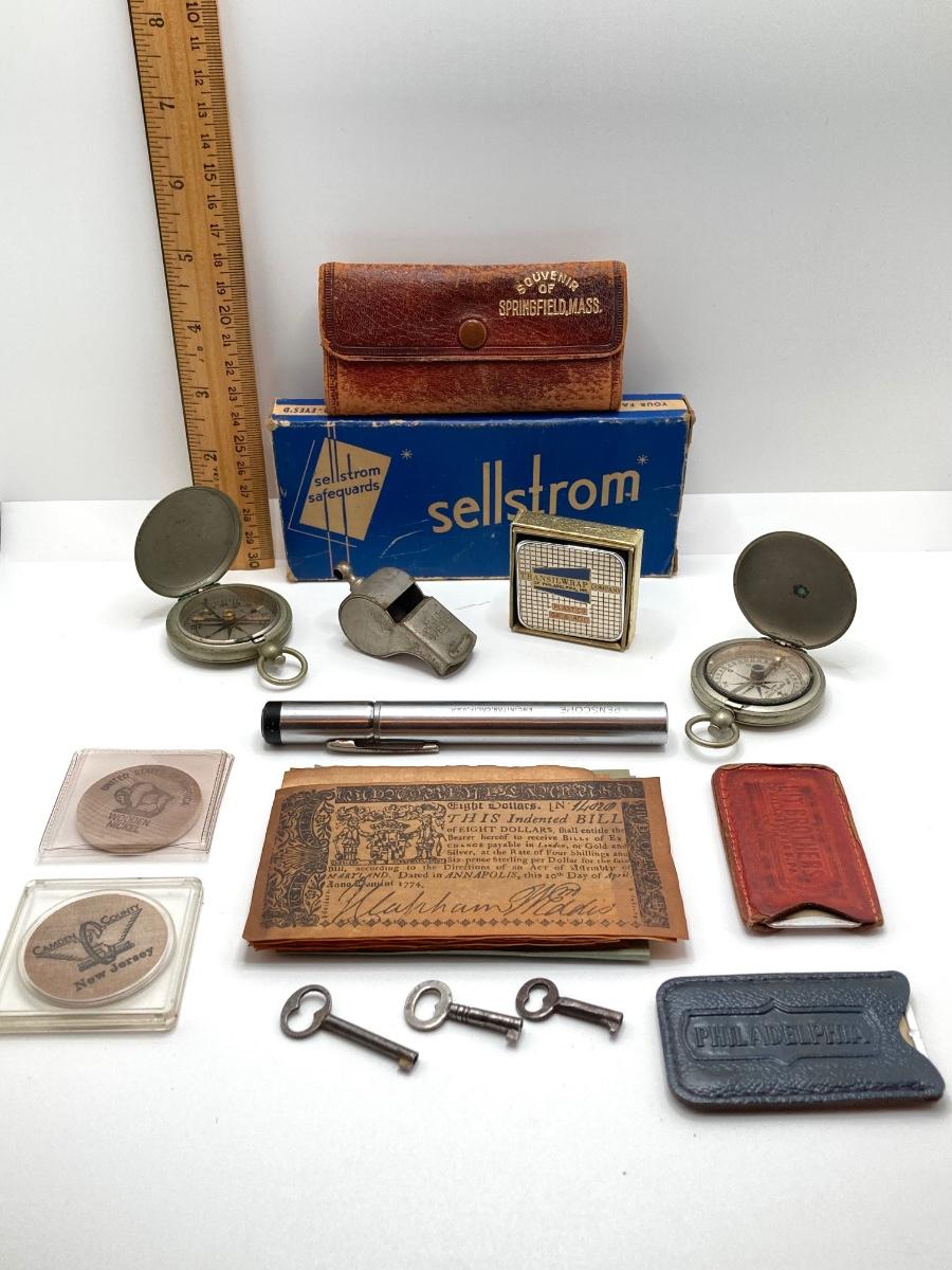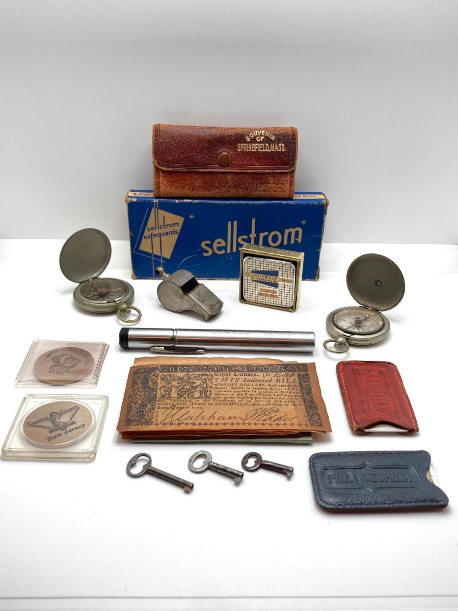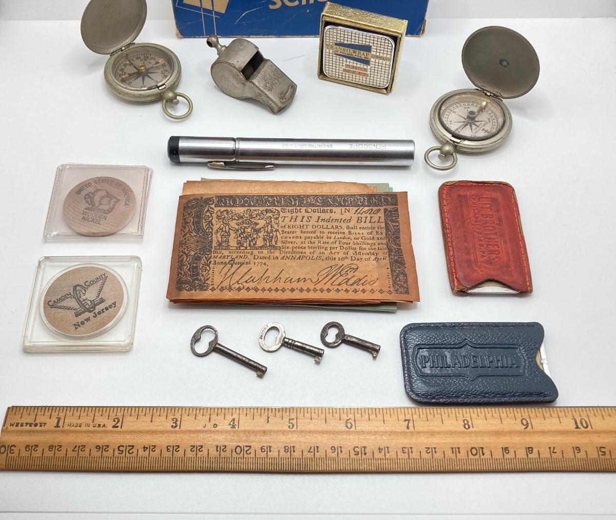 LOT 67: Vintage / Antique Collection - Compasses, Keys, Safety Goggles, Penscope, Charge Plates and More