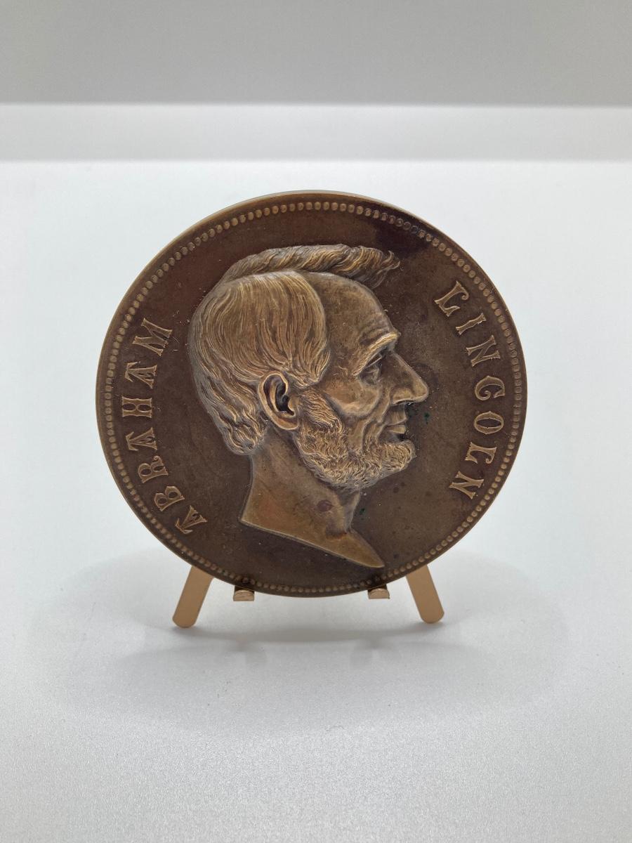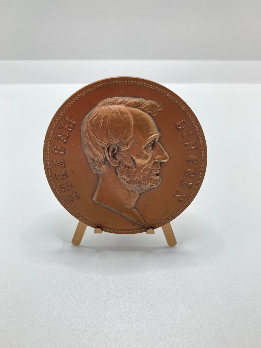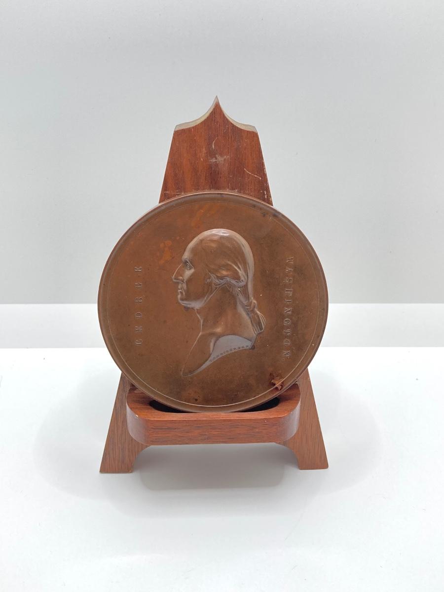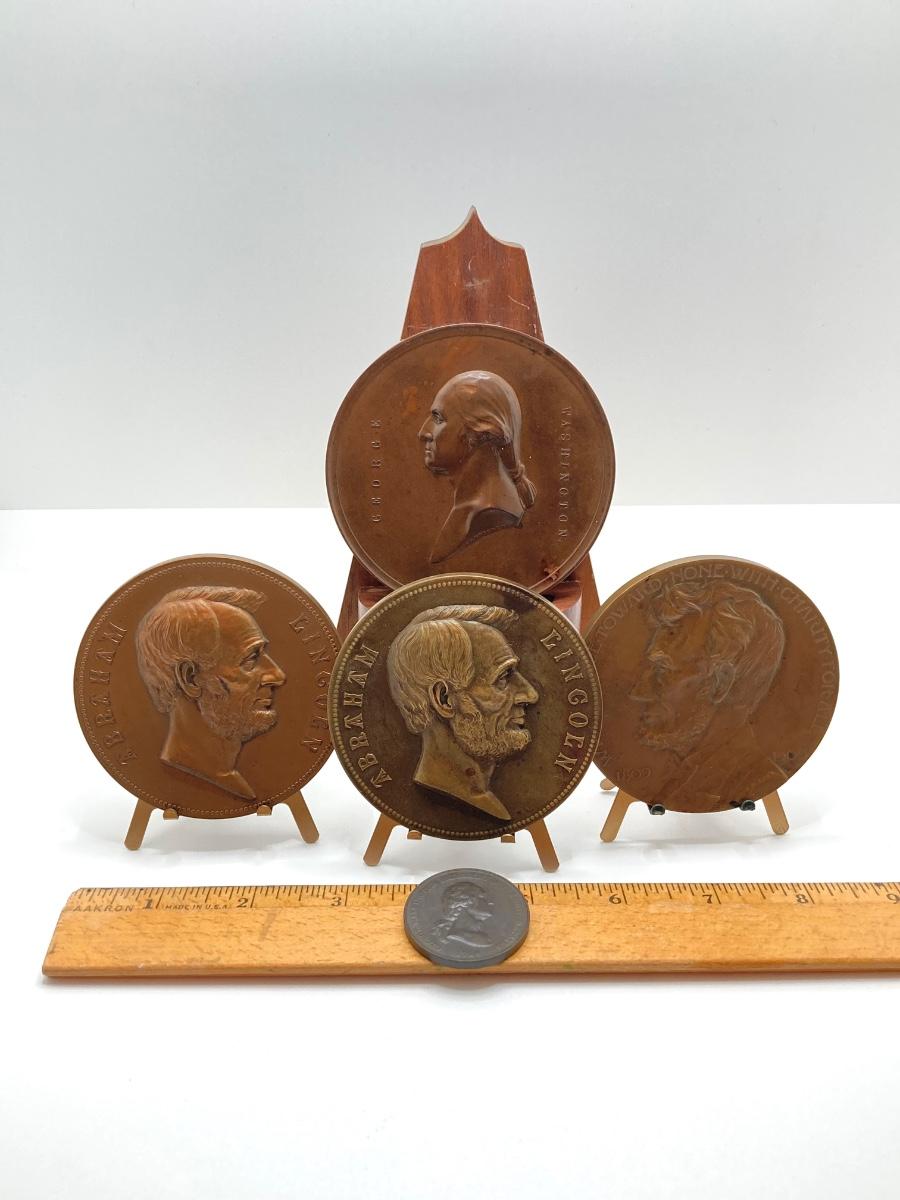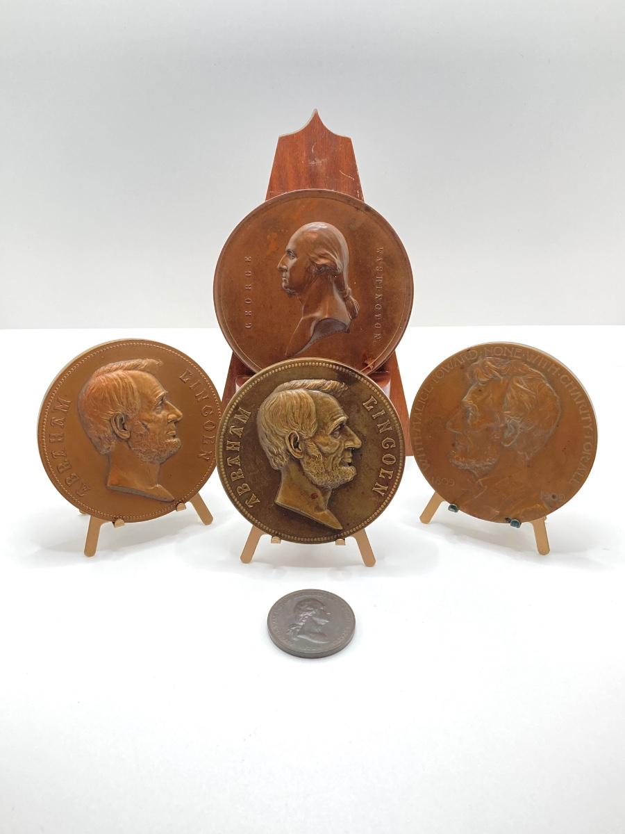 LOT 111: Five Bronze Presidential Medals / Tokens - George Washington with Wooden Stand and Three Abraham Lincoln and More
