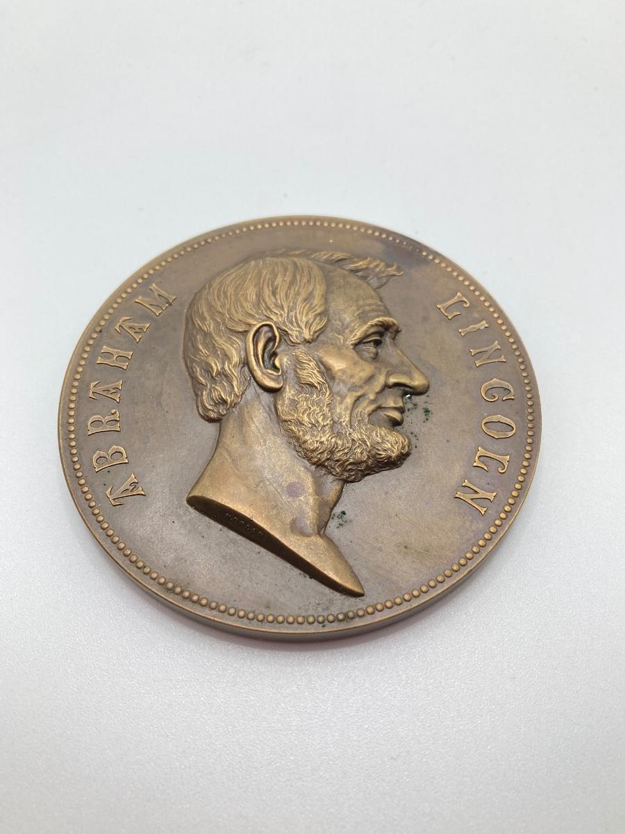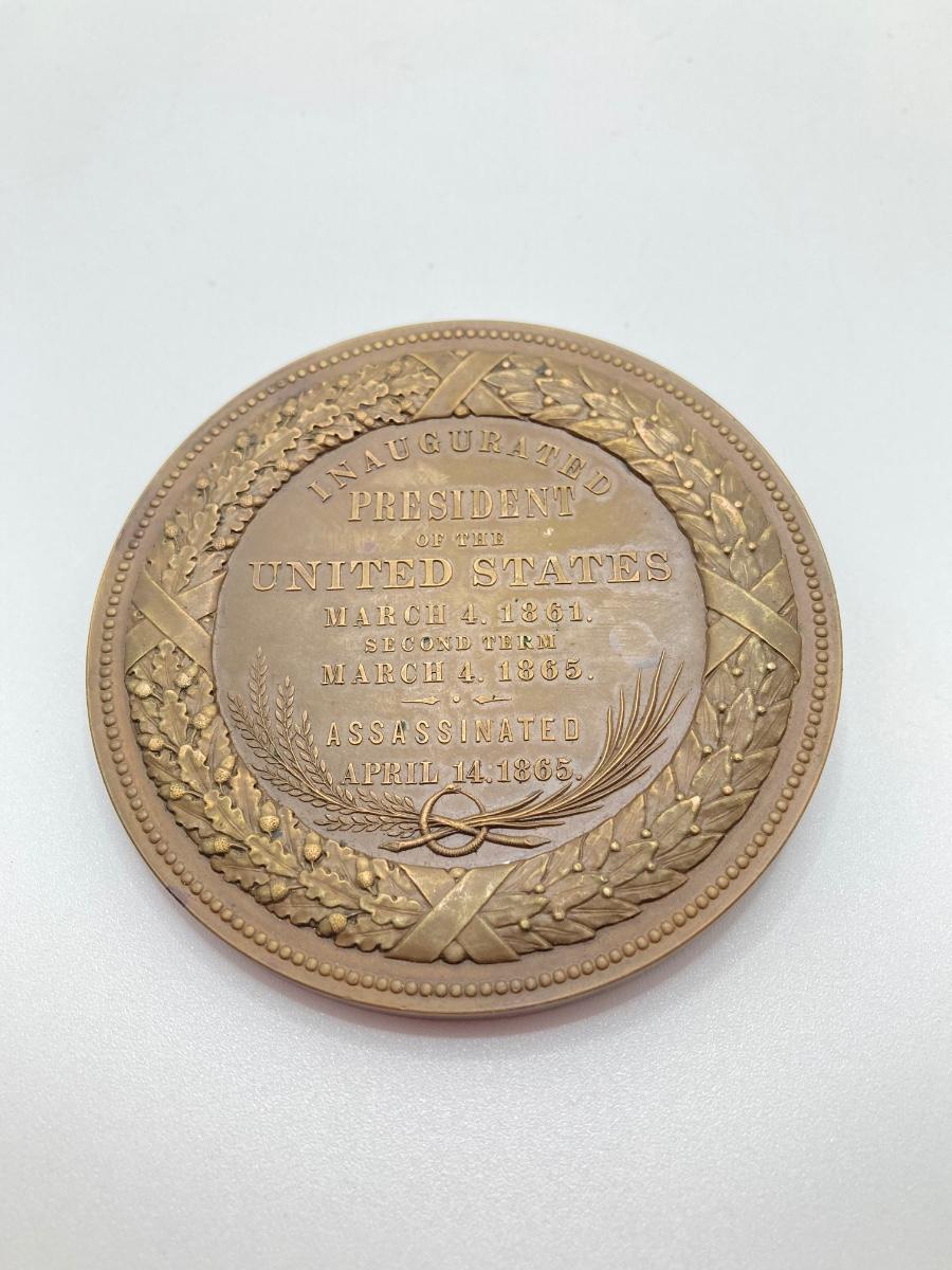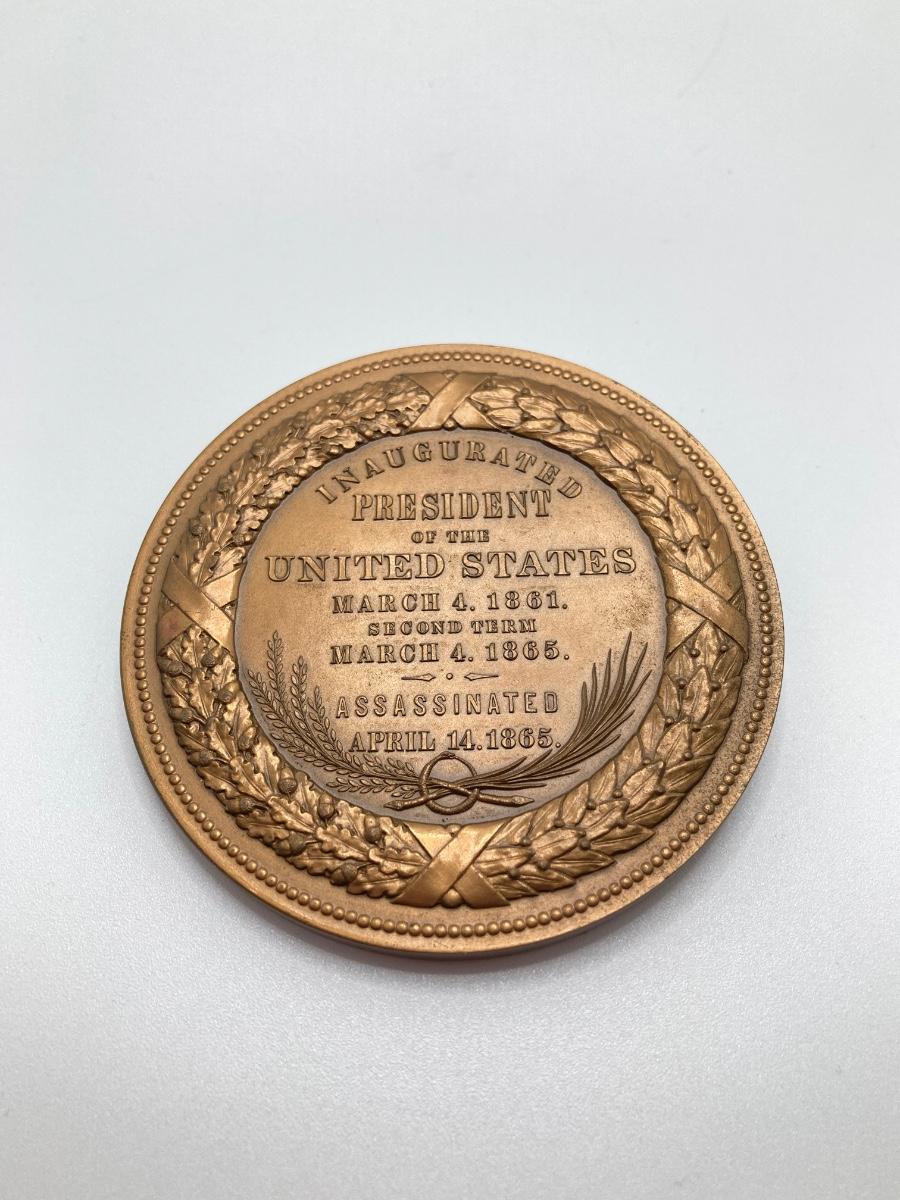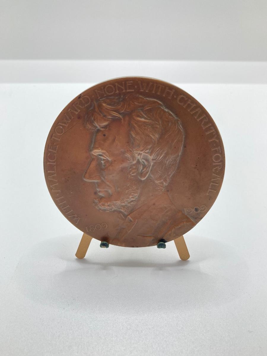 LOT 111: Five Bronze Presidential Medals / Tokens - George Washington with Wooden Stand and Three Abraham Lincoln and More