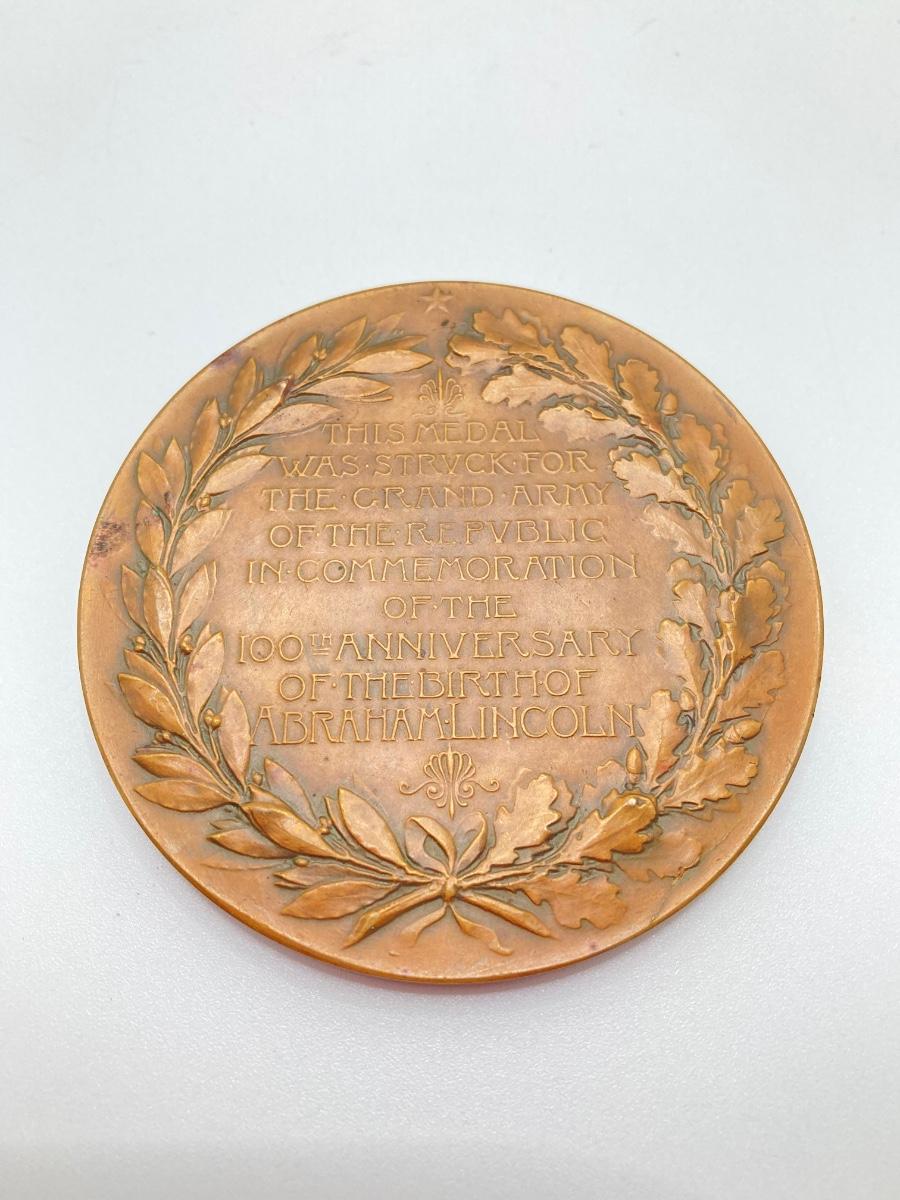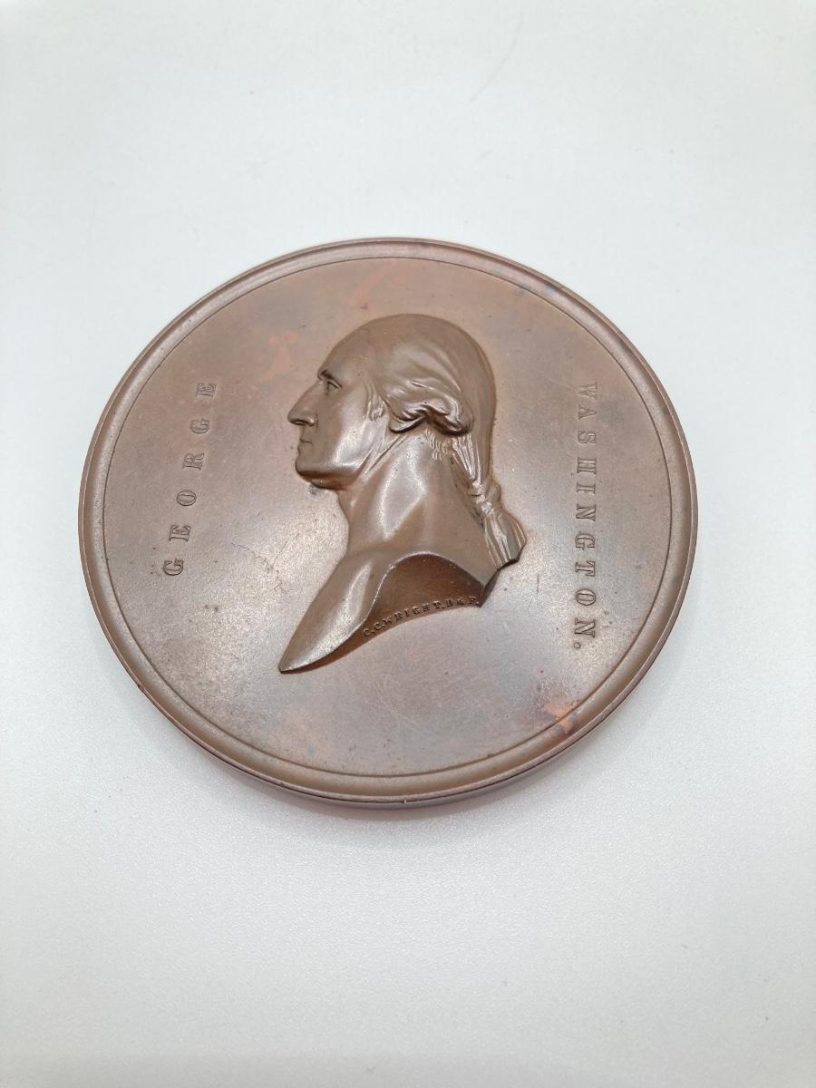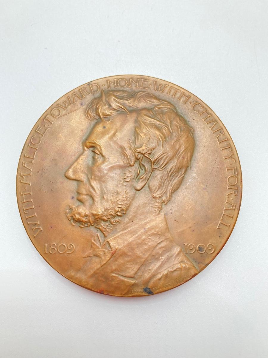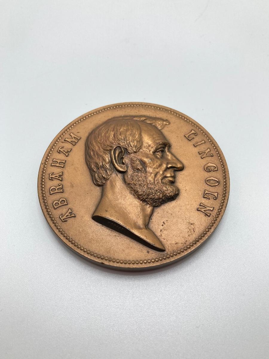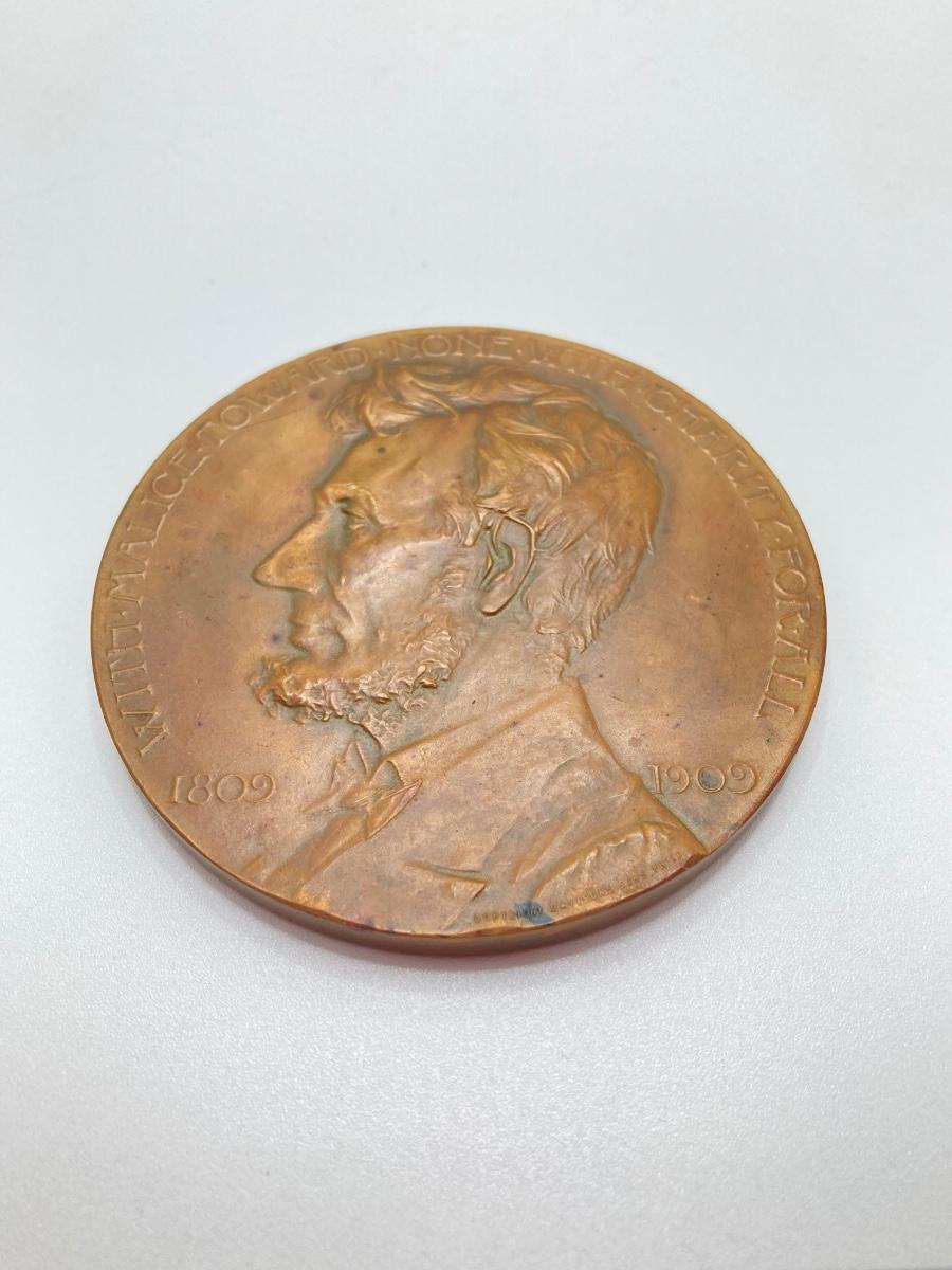 LOT 111: Five Bronze Presidential Medals / Tokens - George Washington with Wooden Stand and Three Abraham Lincoln and More