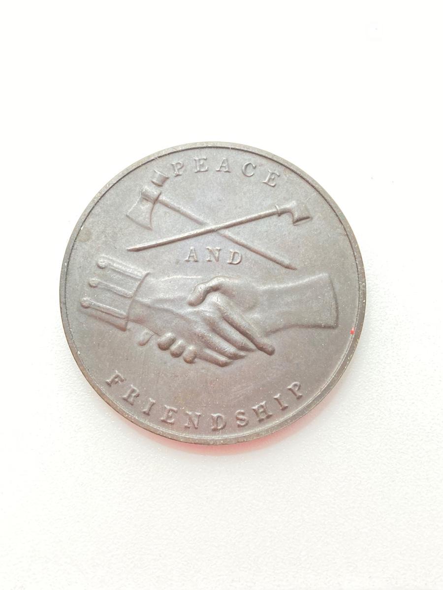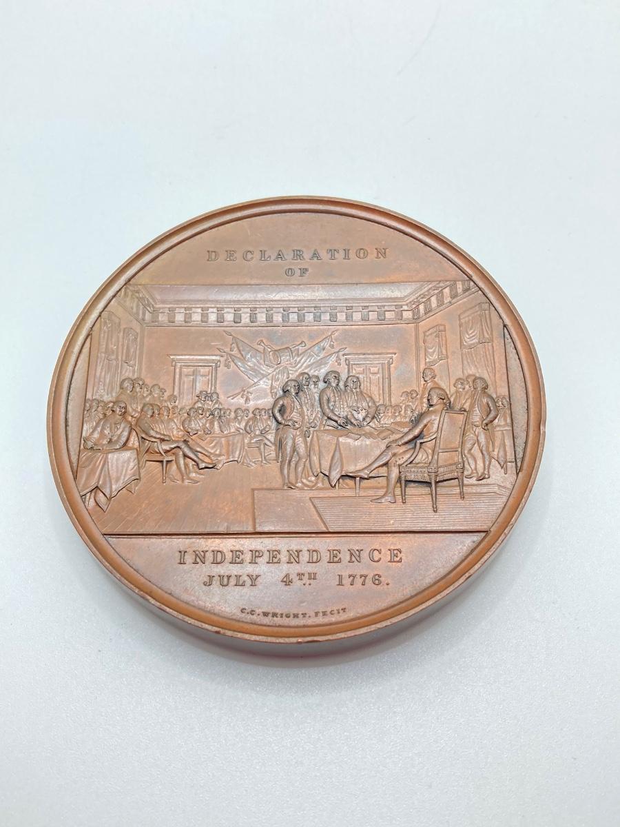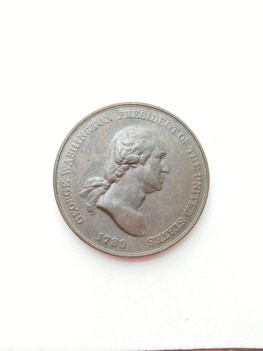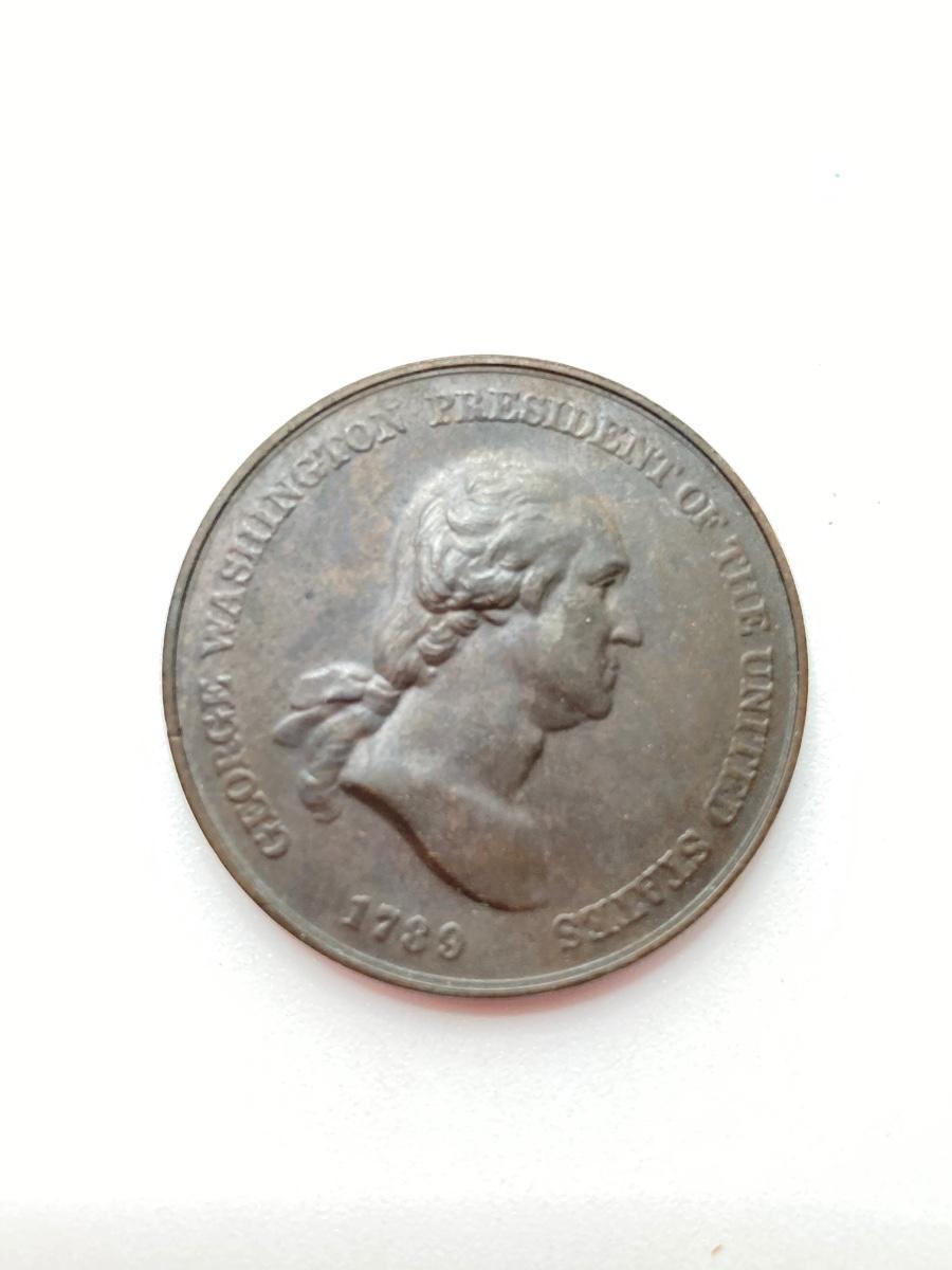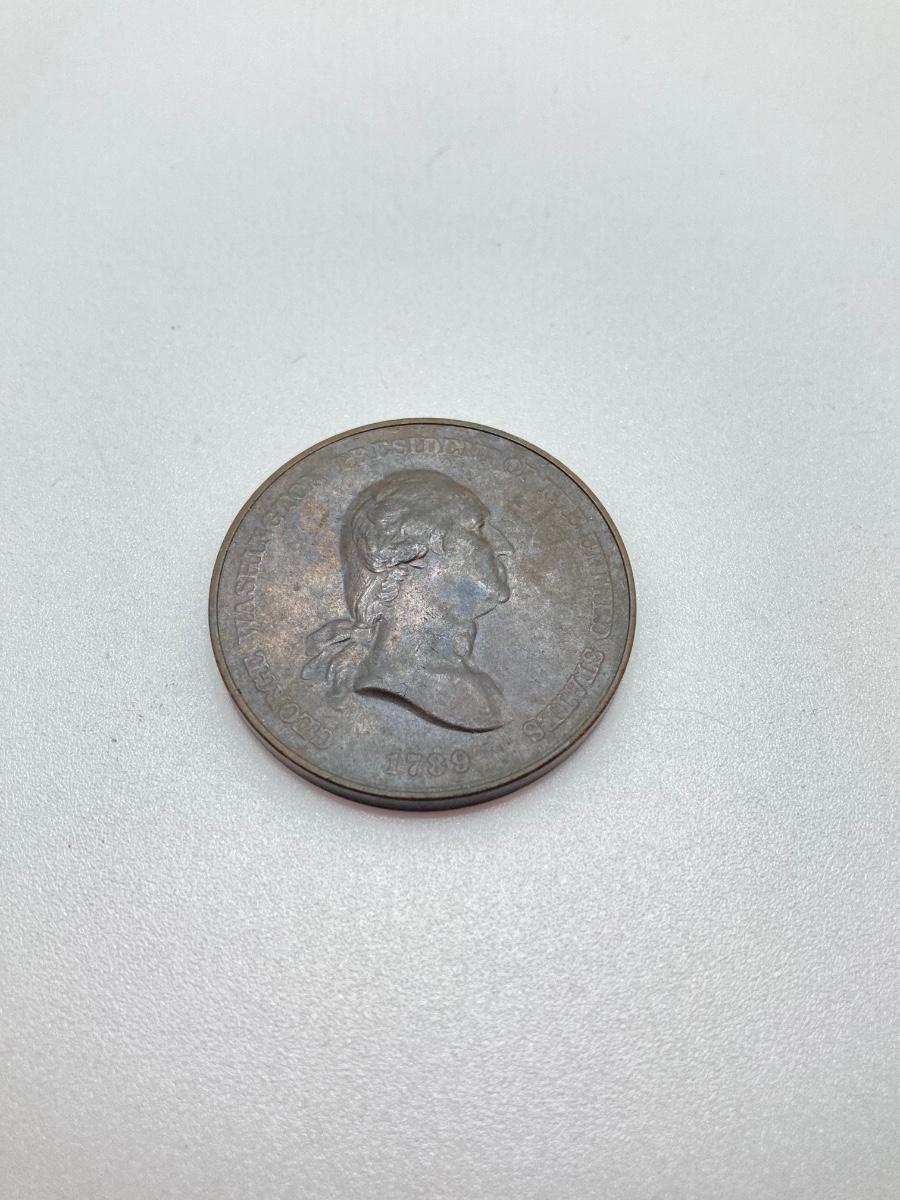 LOT 111: Five Bronze Presidential Medals / Tokens - George Washington with Wooden Stand and Three Abraham Lincoln and More