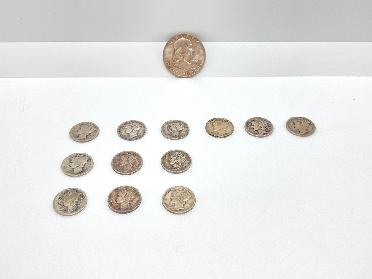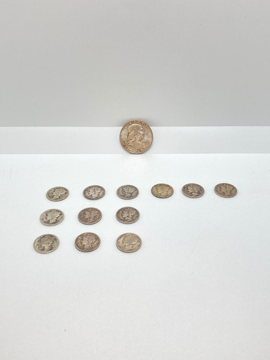 LOT 250: Silver U.S. Coins - (1) 1951 Benjamin Franklin Half Dollar Coin and (12) Mercury Dimes Dated 1916 to 1943