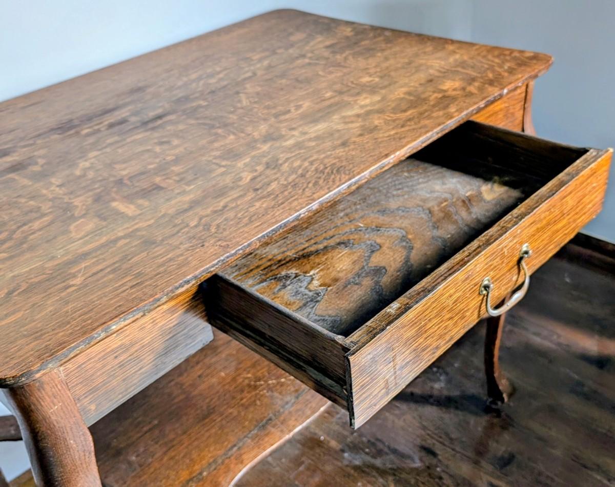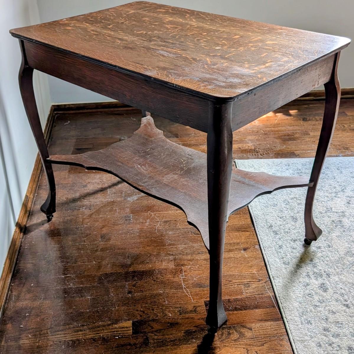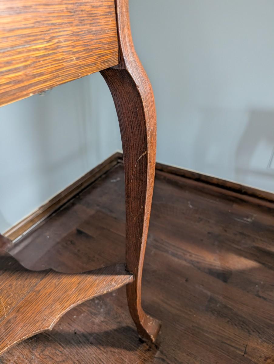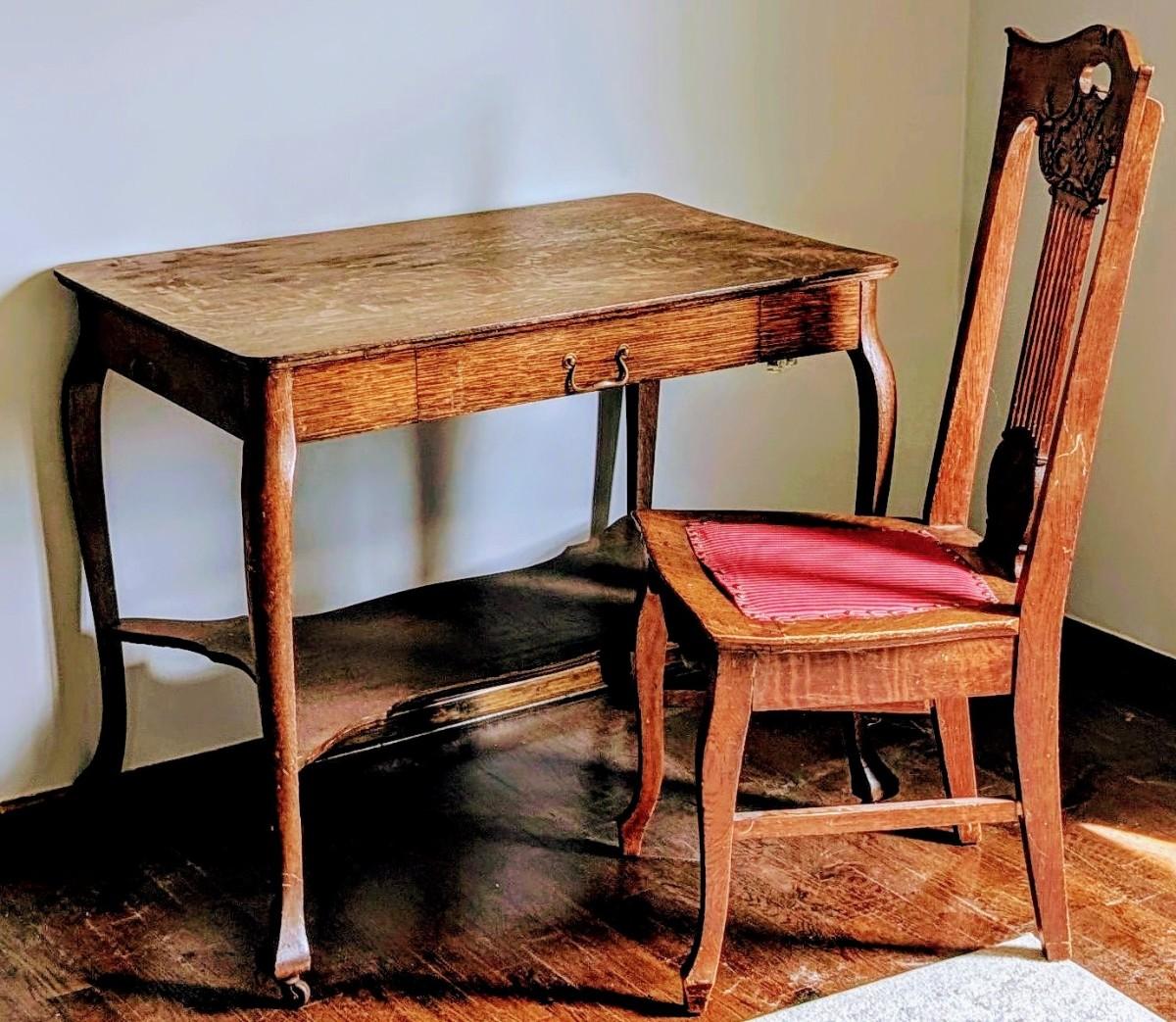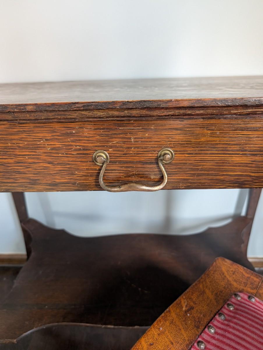 LOT 3Y: Antique/Vintage Tiger Wood Library Desk & Hand Carved Spindle Back Upholstered Chair