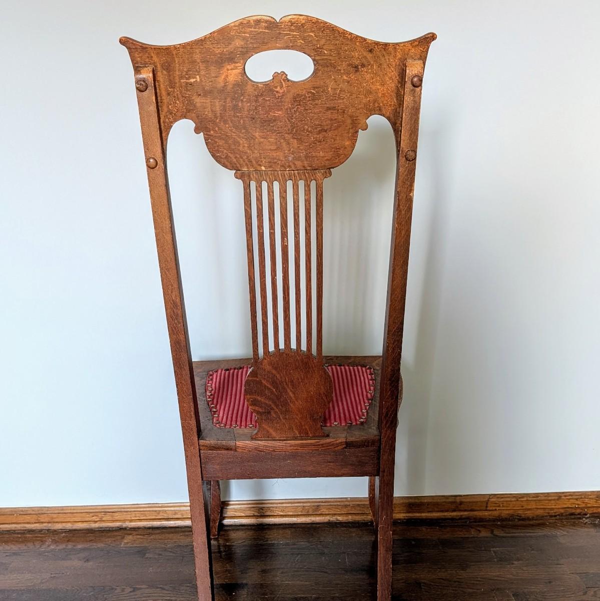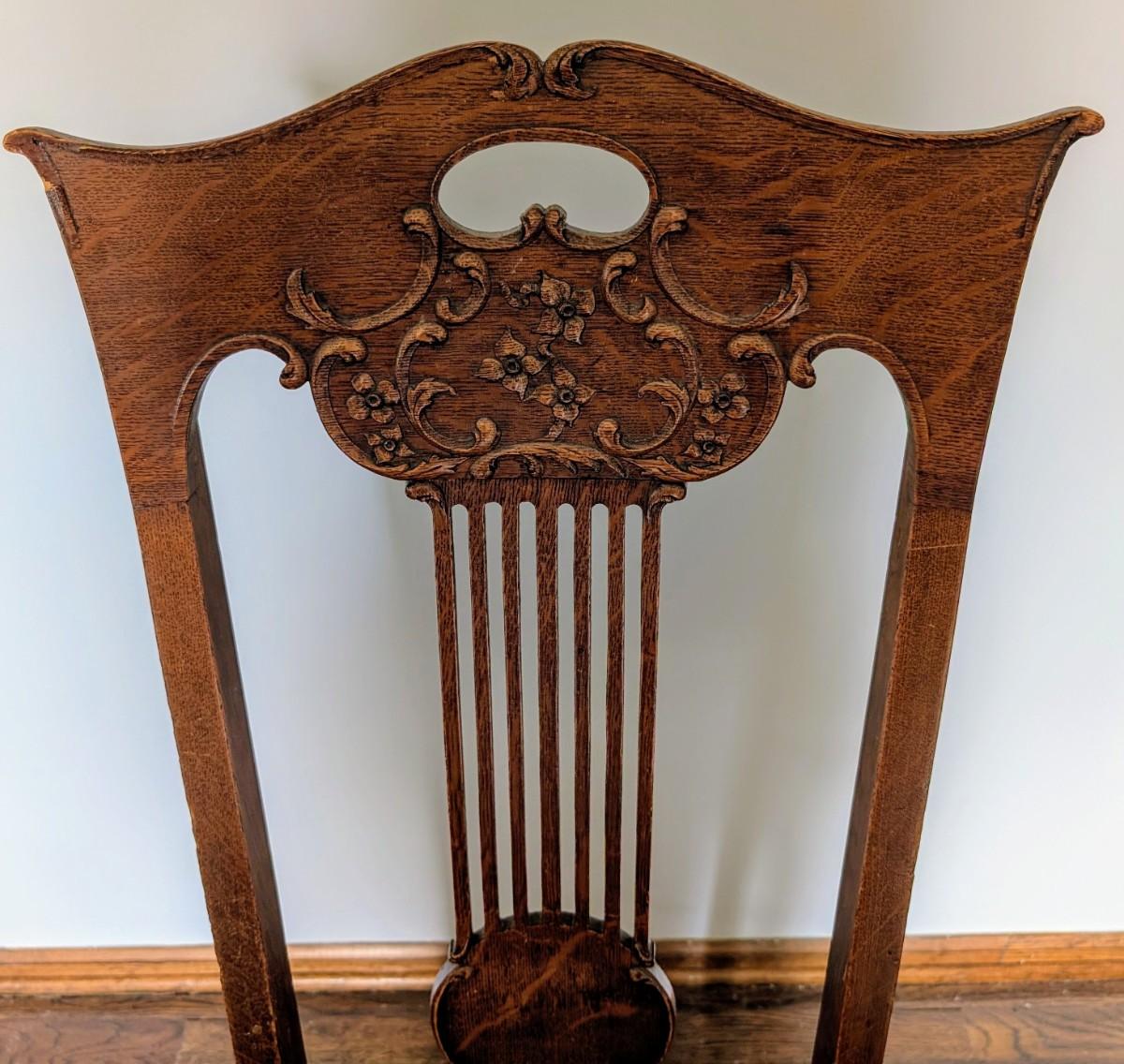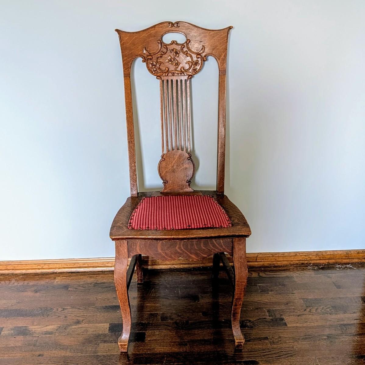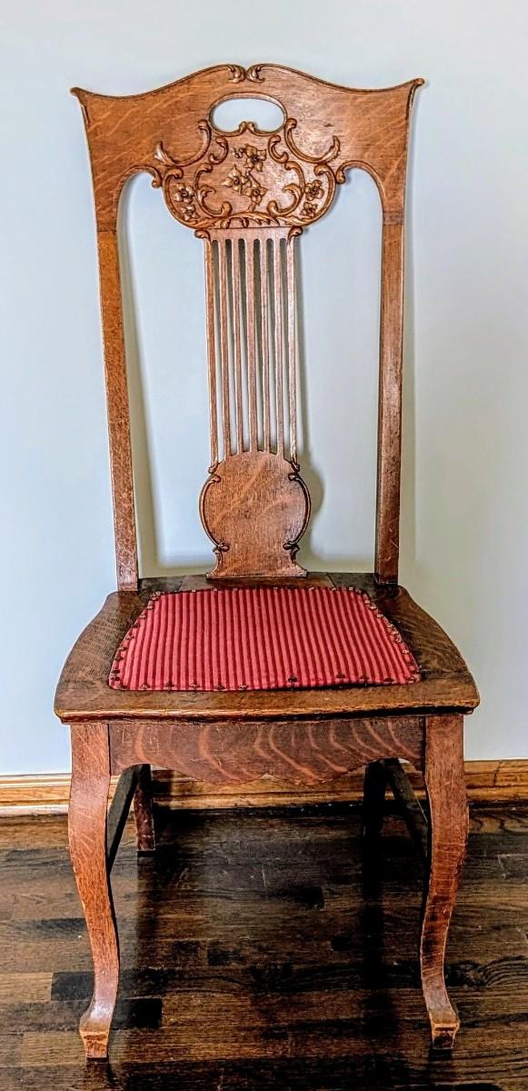 LOT 3Y: Antique/Vintage Tiger Wood Library Desk & Hand Carved Spindle Back Upholstered Chair