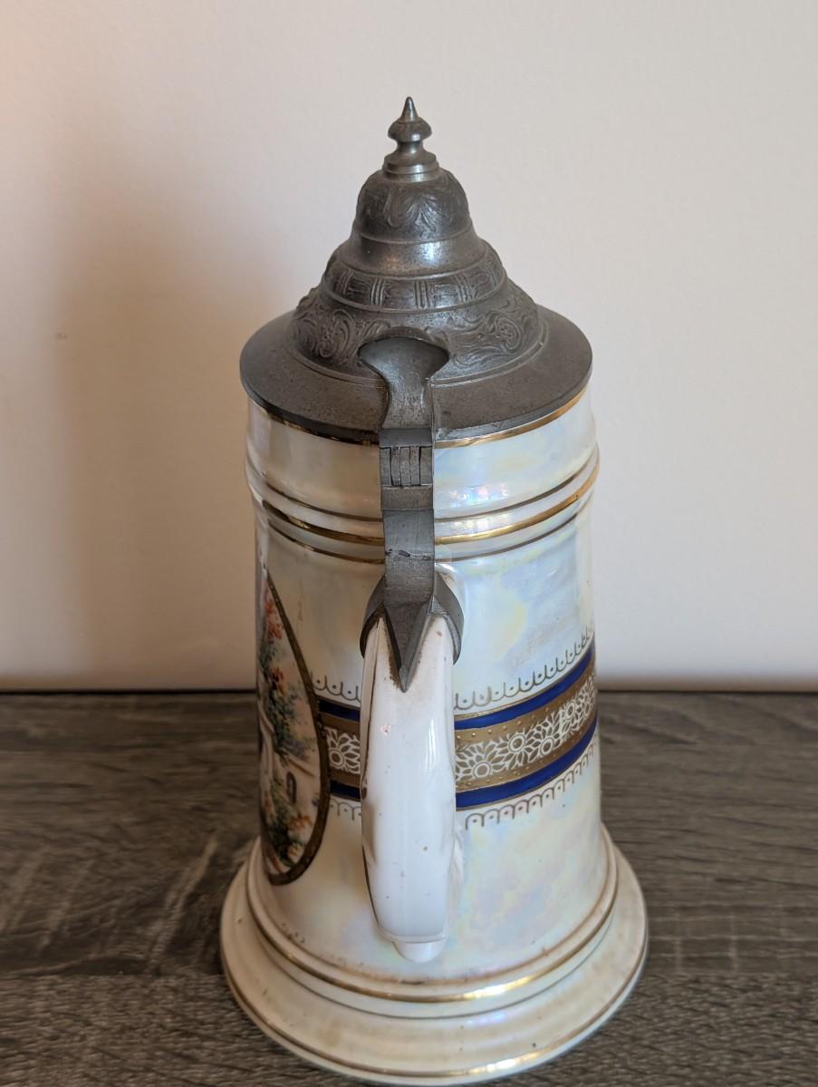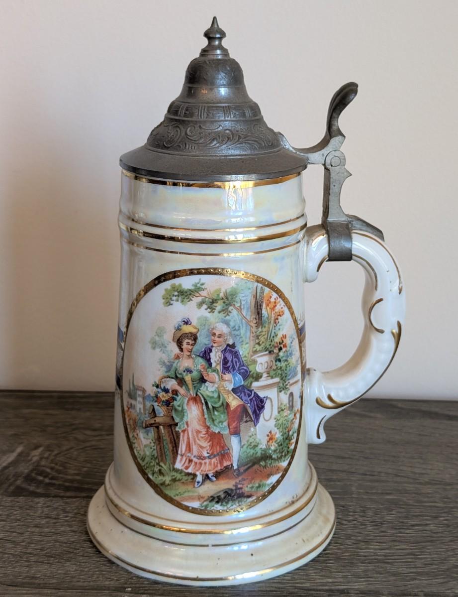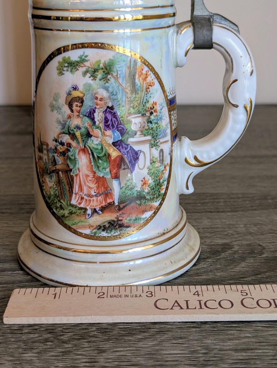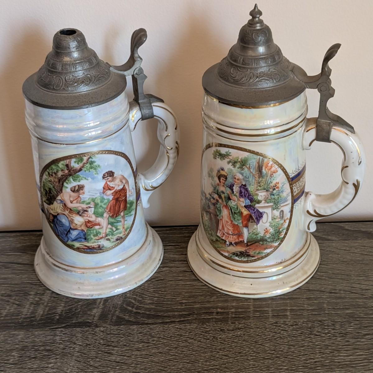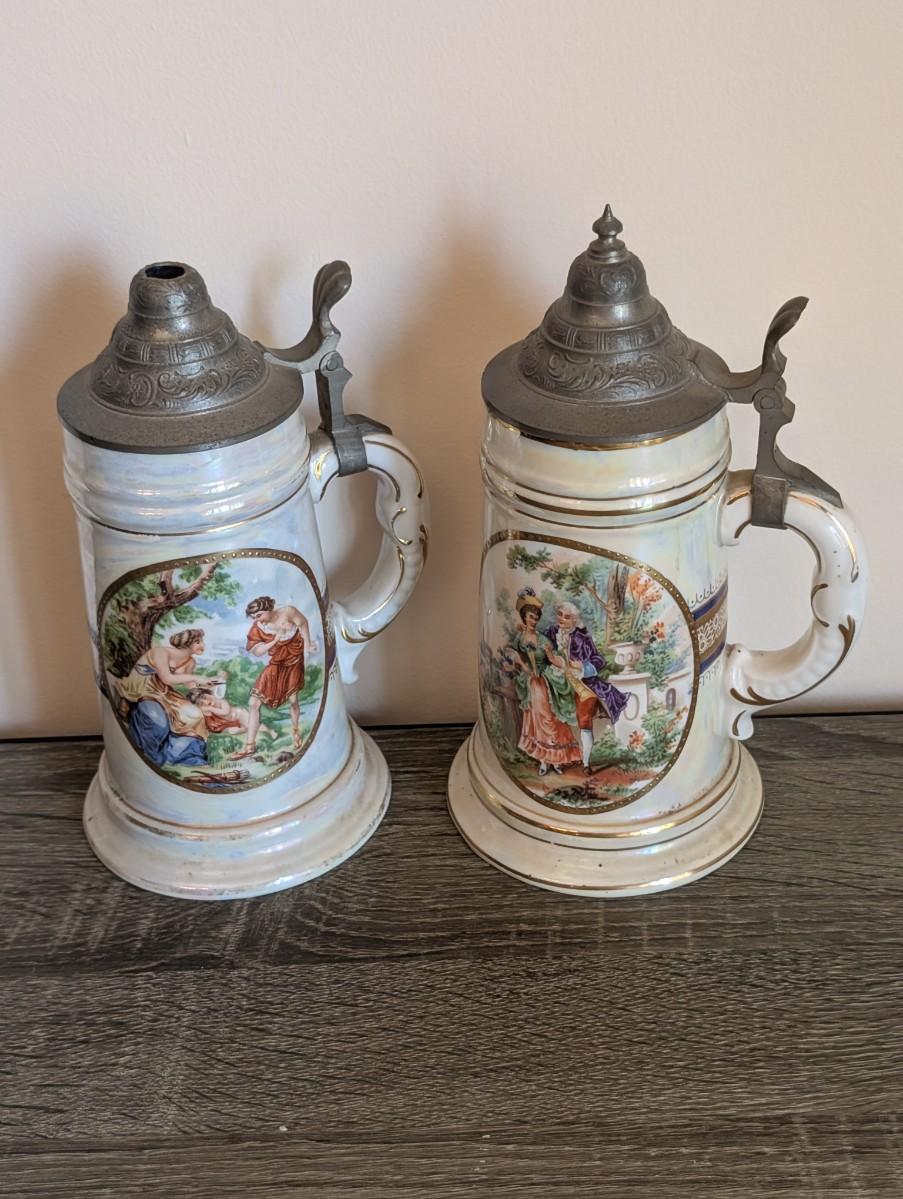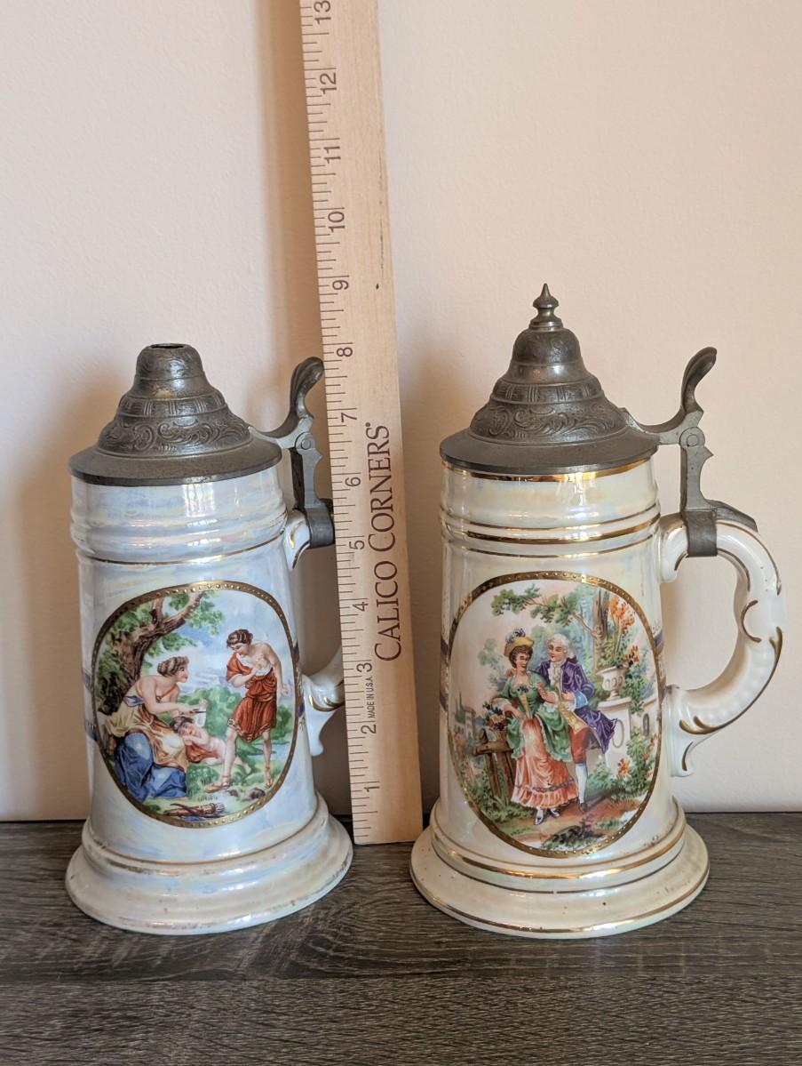 LOT 15K: Vintage German Porcelain Pewter Lidded Lithographed Beer Steins