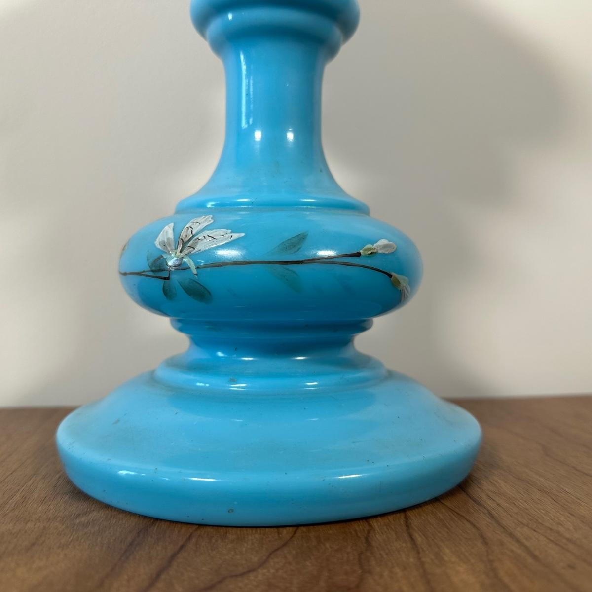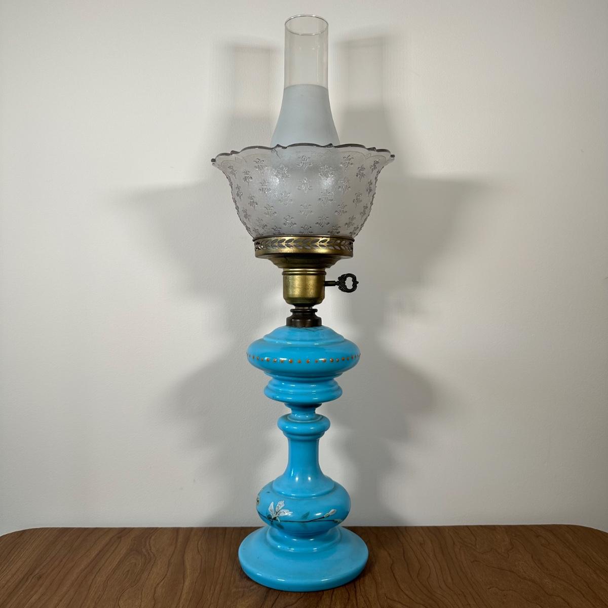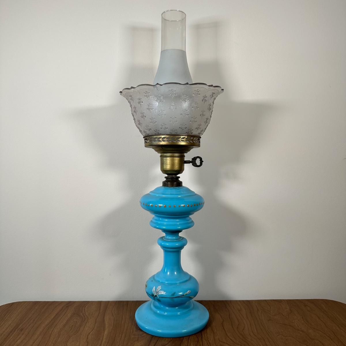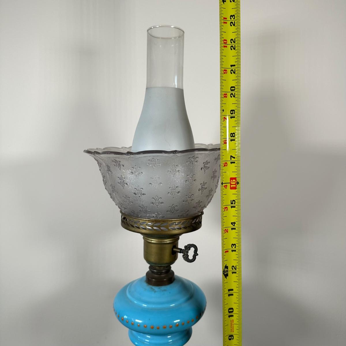 LOT 31M: Antique 19th Century Blue Glass Hand Painted Victorian Oil Lamp