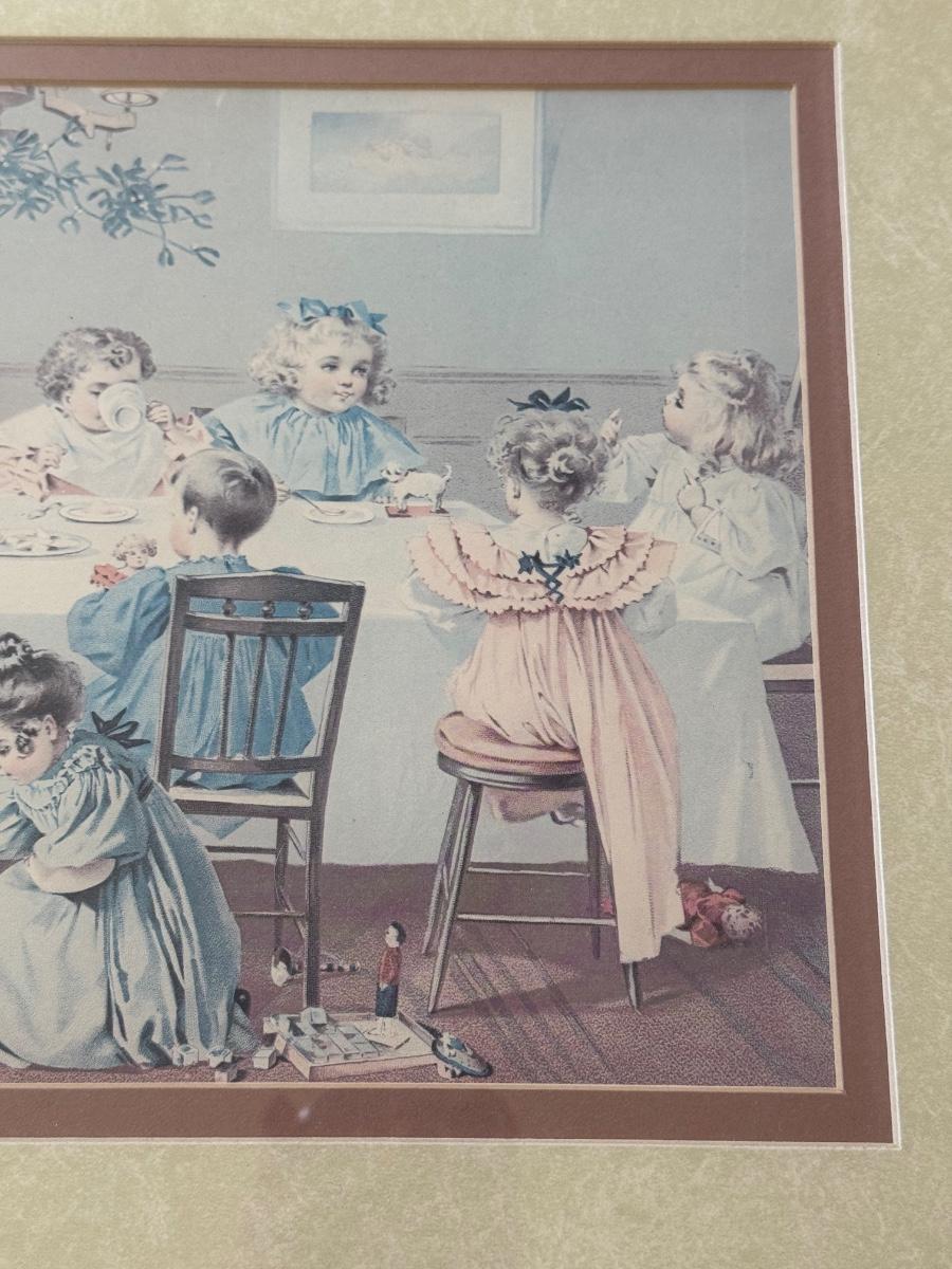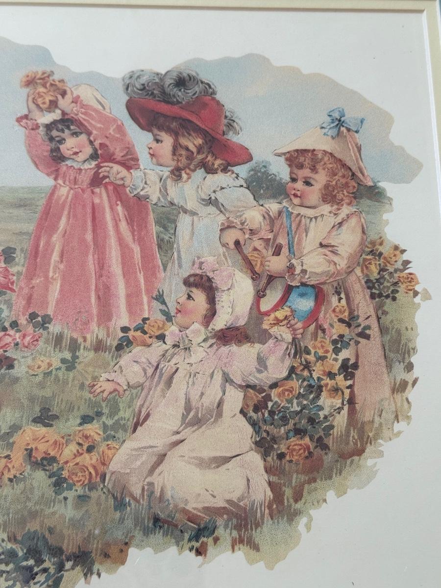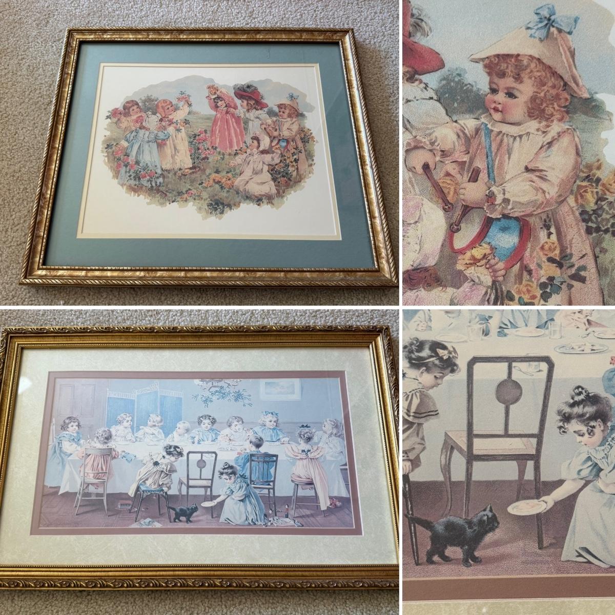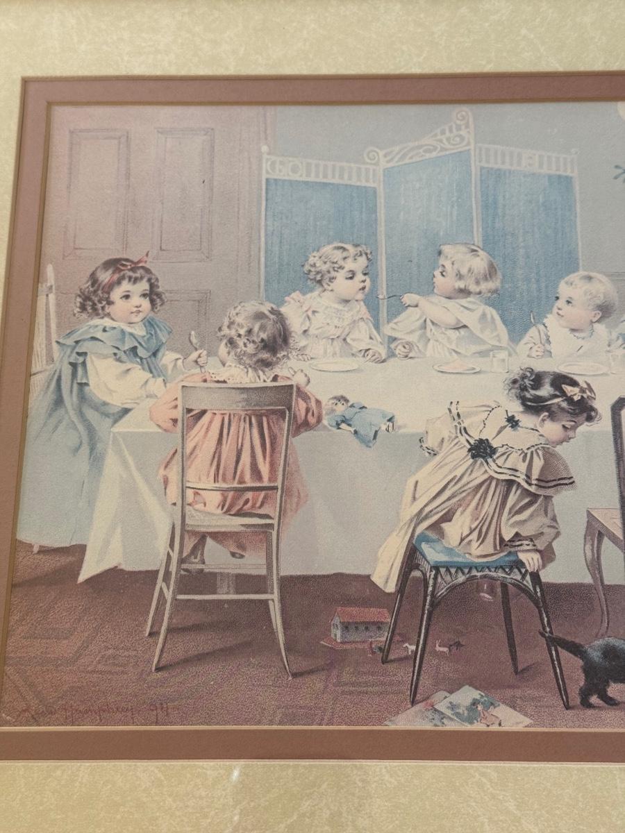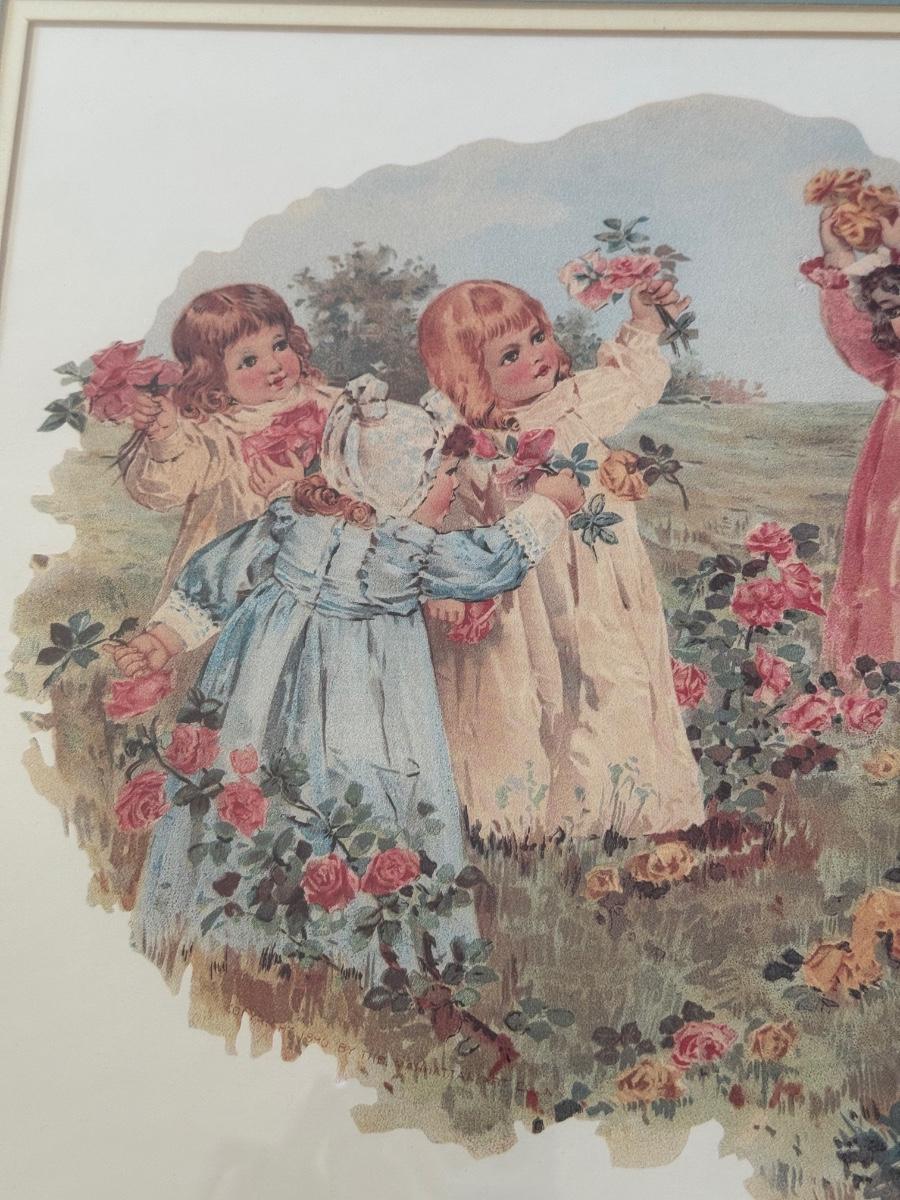 LOT 55L: Framed Maud Humphrey (American, 1868-1940) Victorian Era Children Art Prints: "War of the Roses" & :Miss Muffet's Birthday Party" (printed signature visible)