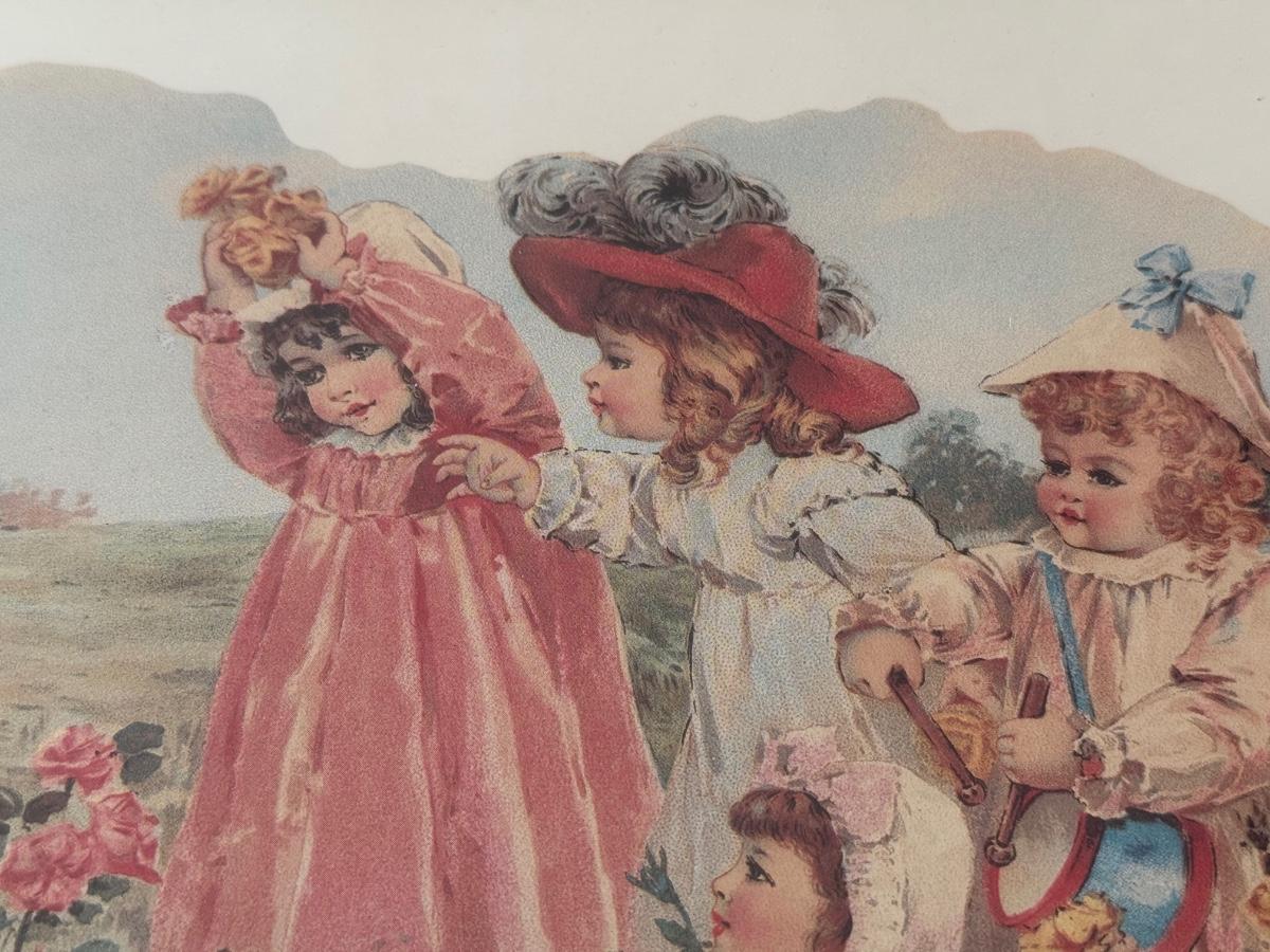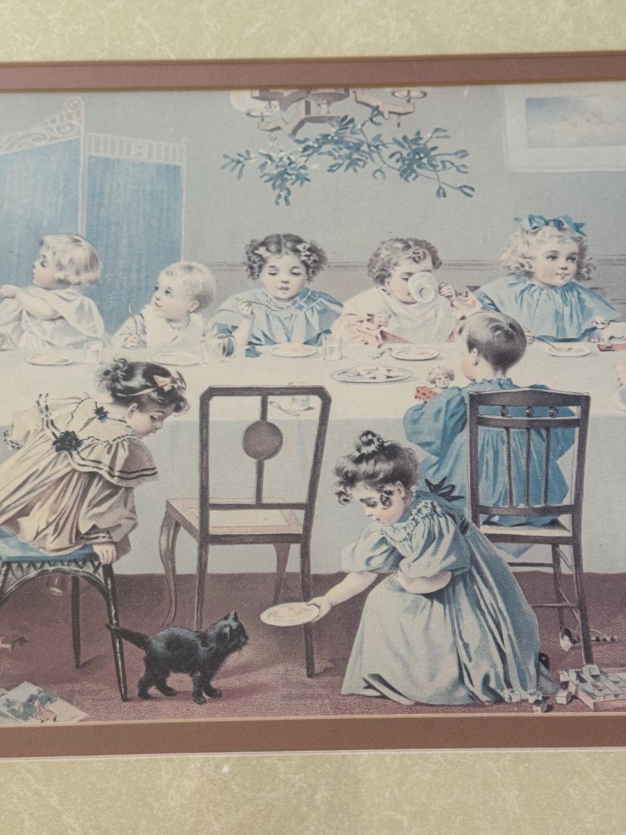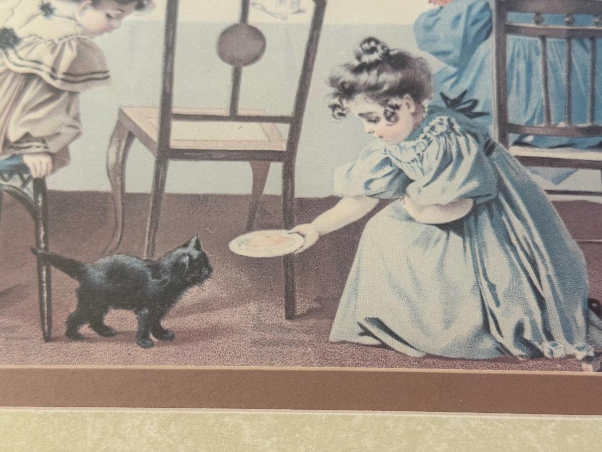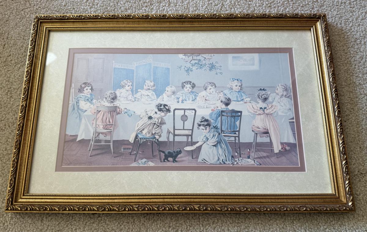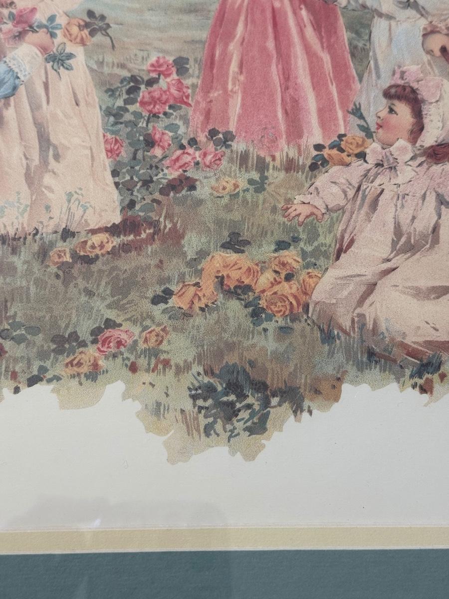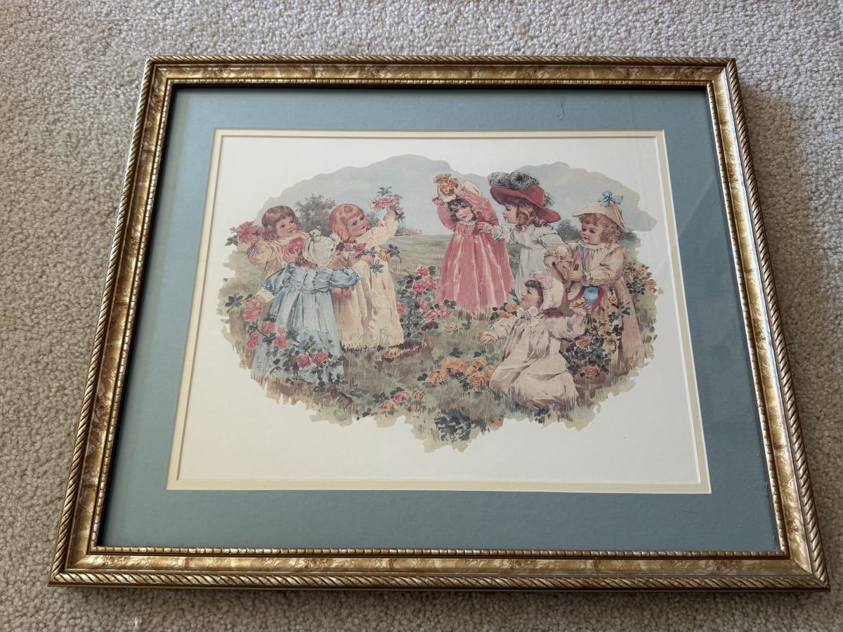 LOT 55L: Framed Maud Humphrey (American, 1868-1940) Victorian Era Children Art Prints: "War of the Roses" & :Miss Muffet's Birthday Party" (printed signature visible)