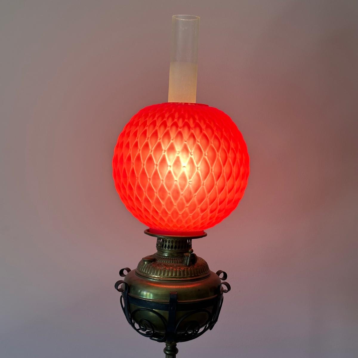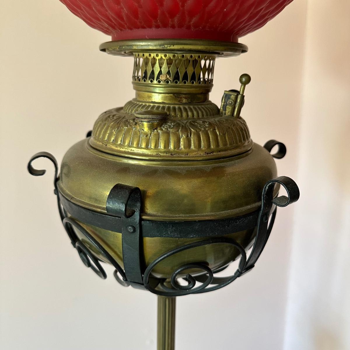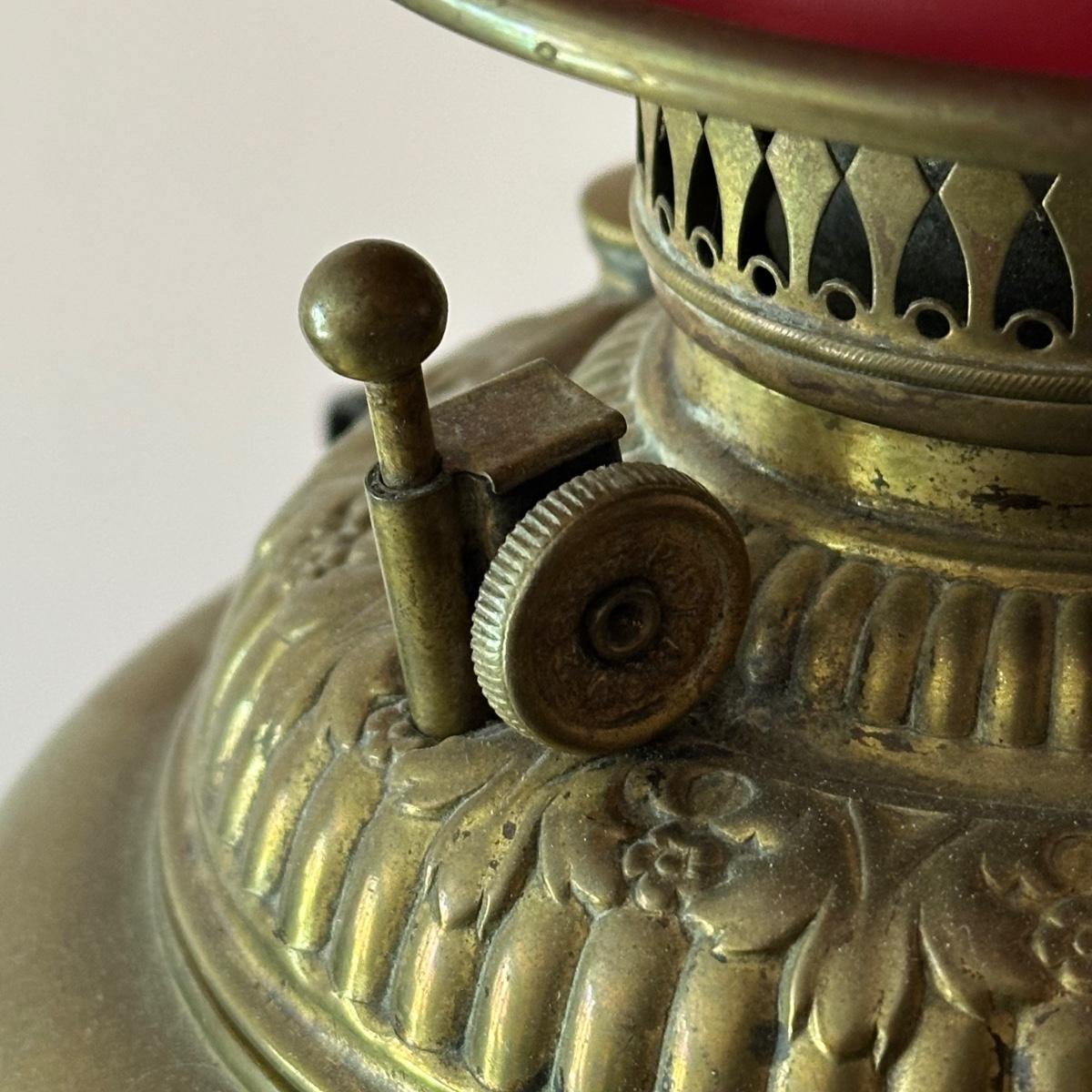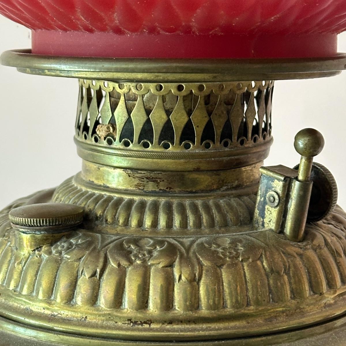LOT 65L: Antique Victorian Cast Iron/Brass Oil Lamp with Red Glass Shade