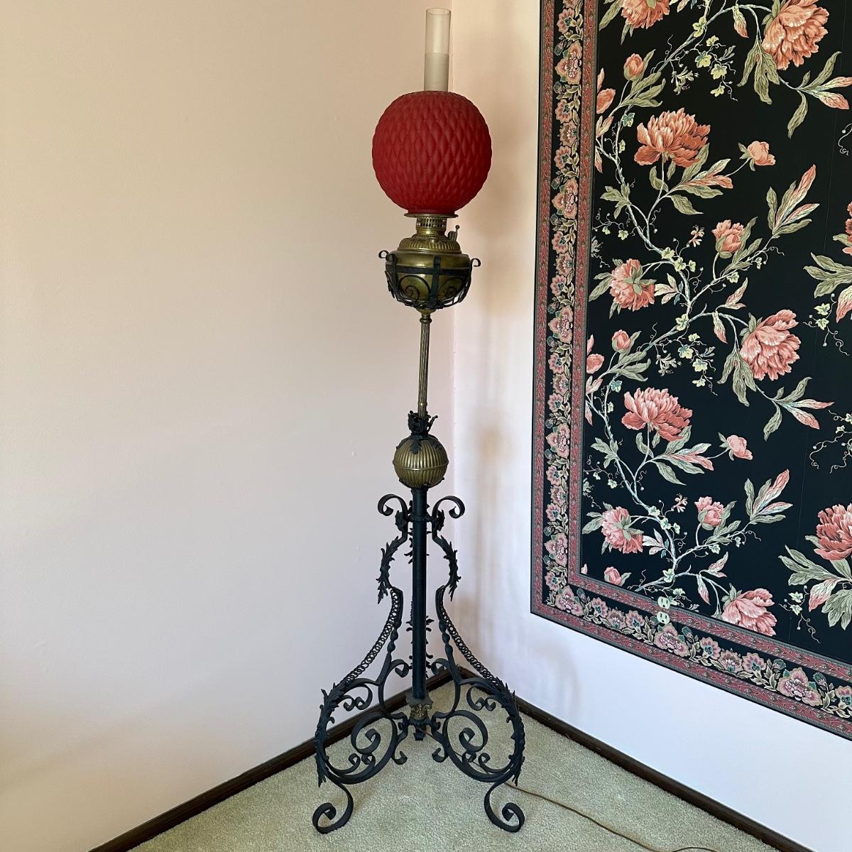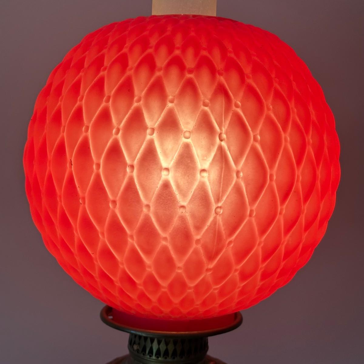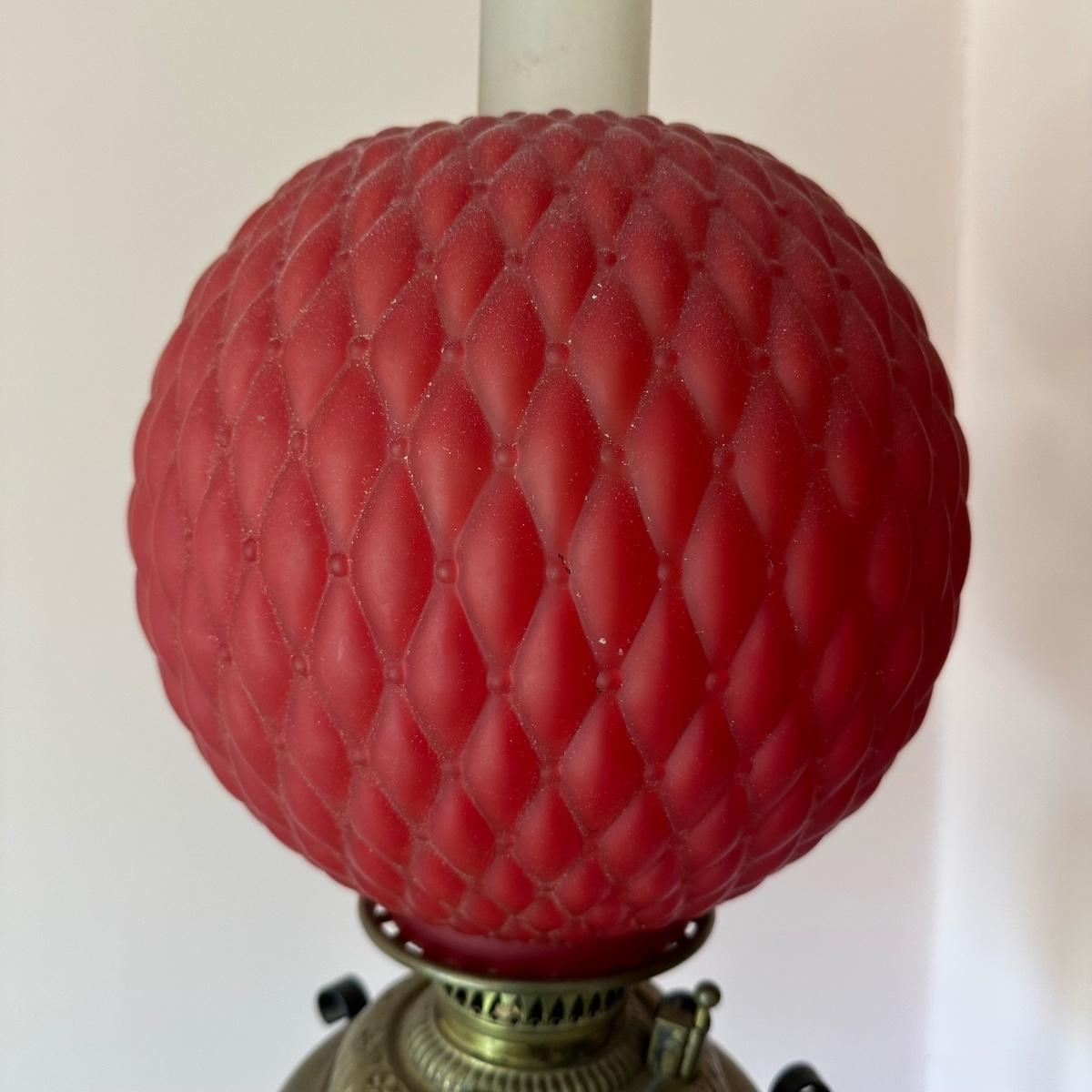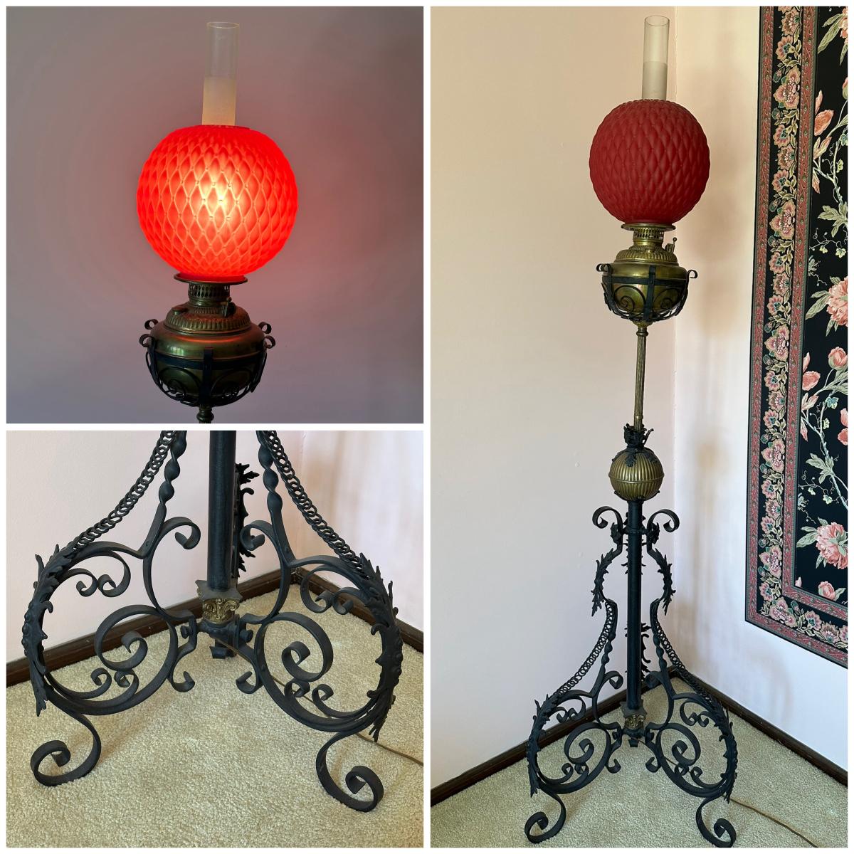 LOT 65L: Antique Victorian Cast Iron/Brass Oil Lamp with Red Glass Shade