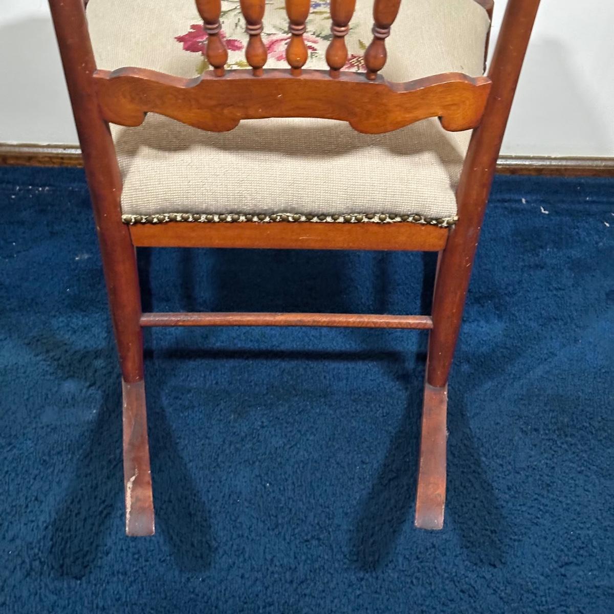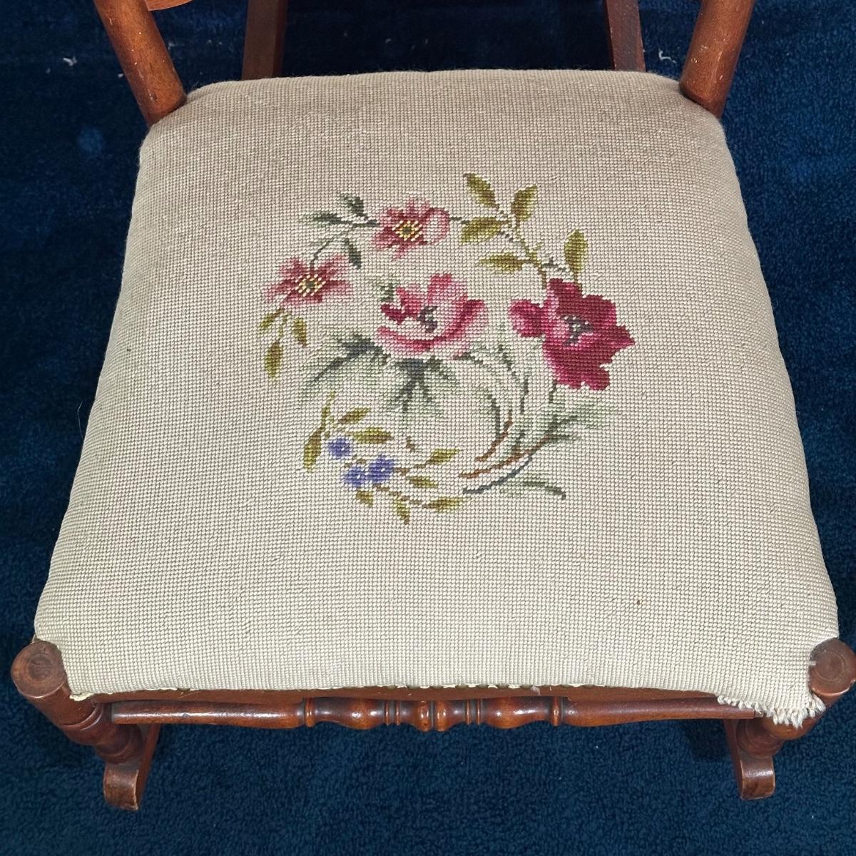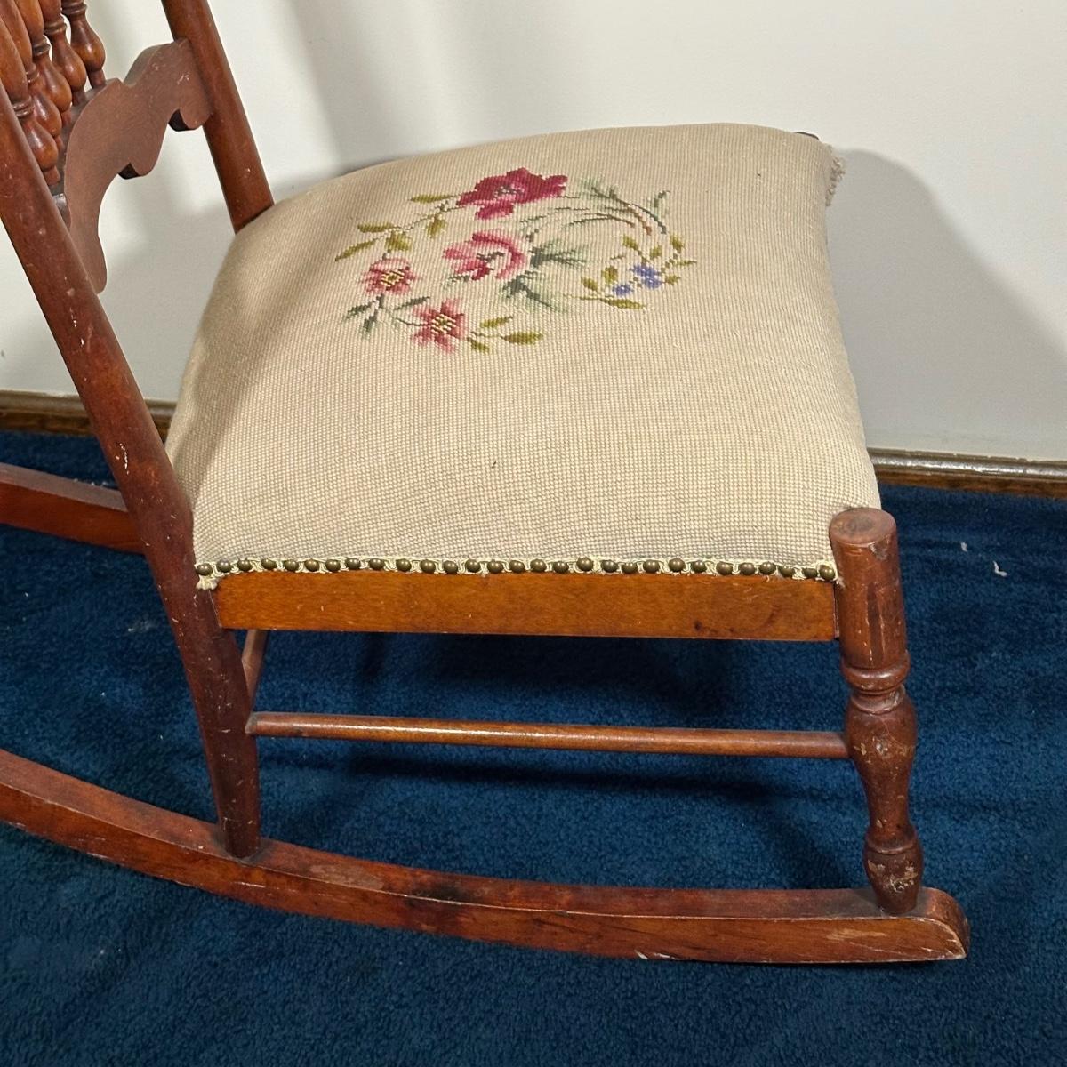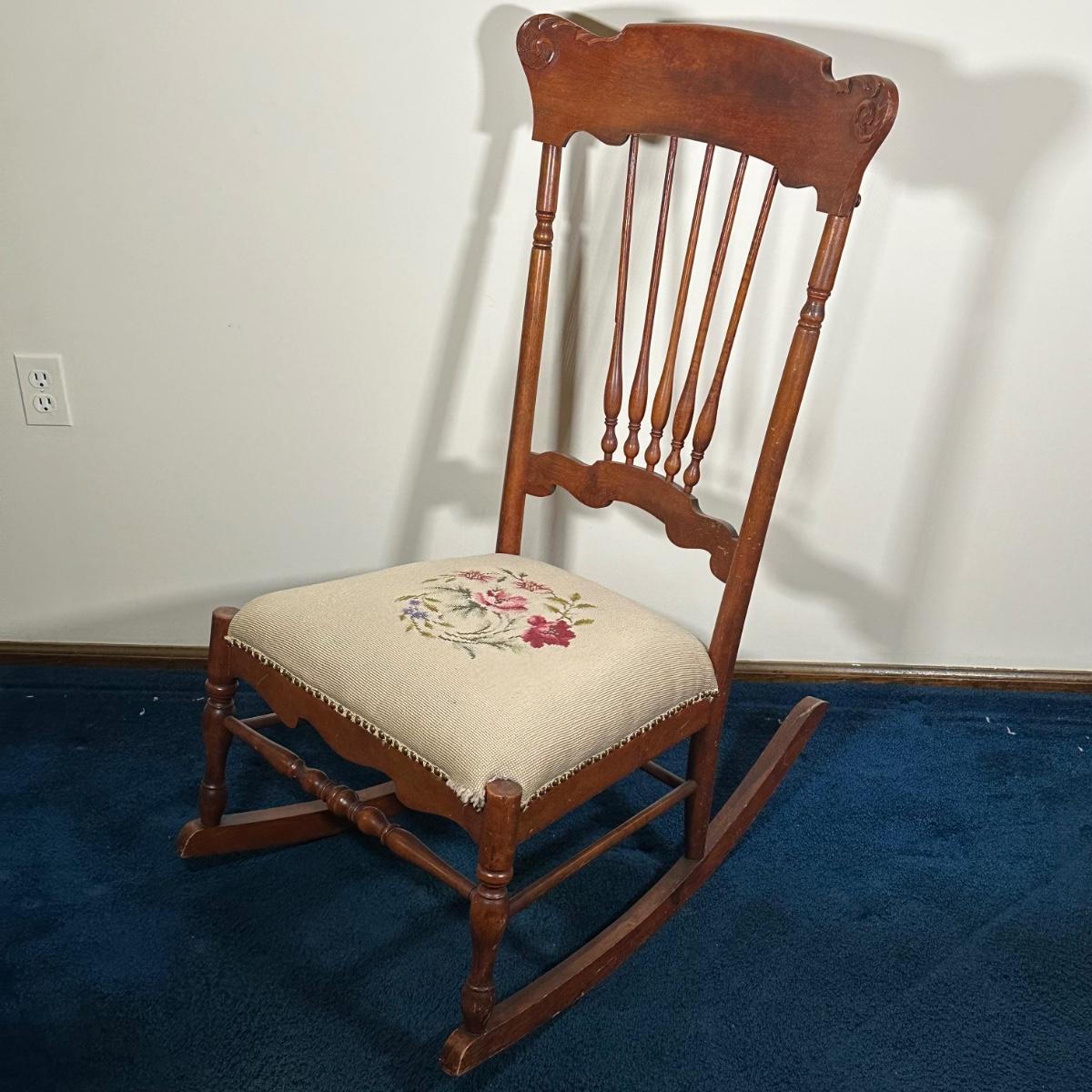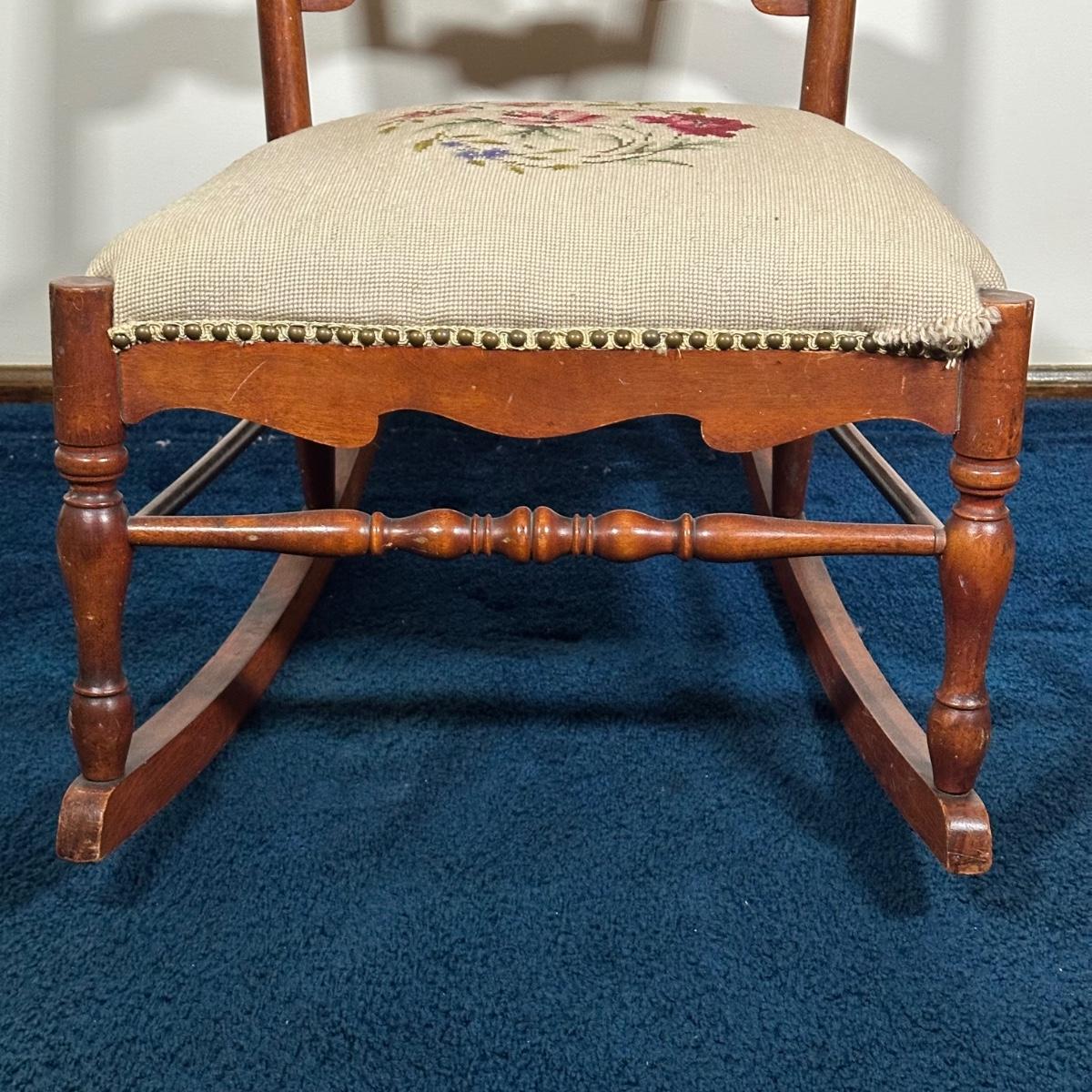 LOT 79A: Antique Wooden Needle Point Hand Embroidered Seat Cushion Rocking Chair
