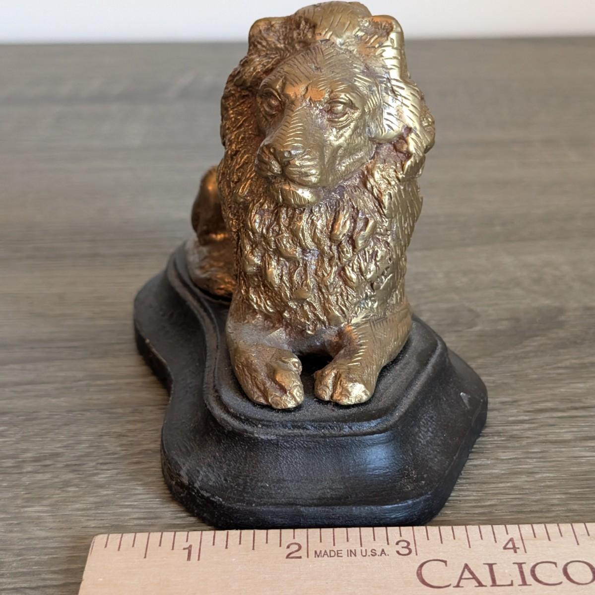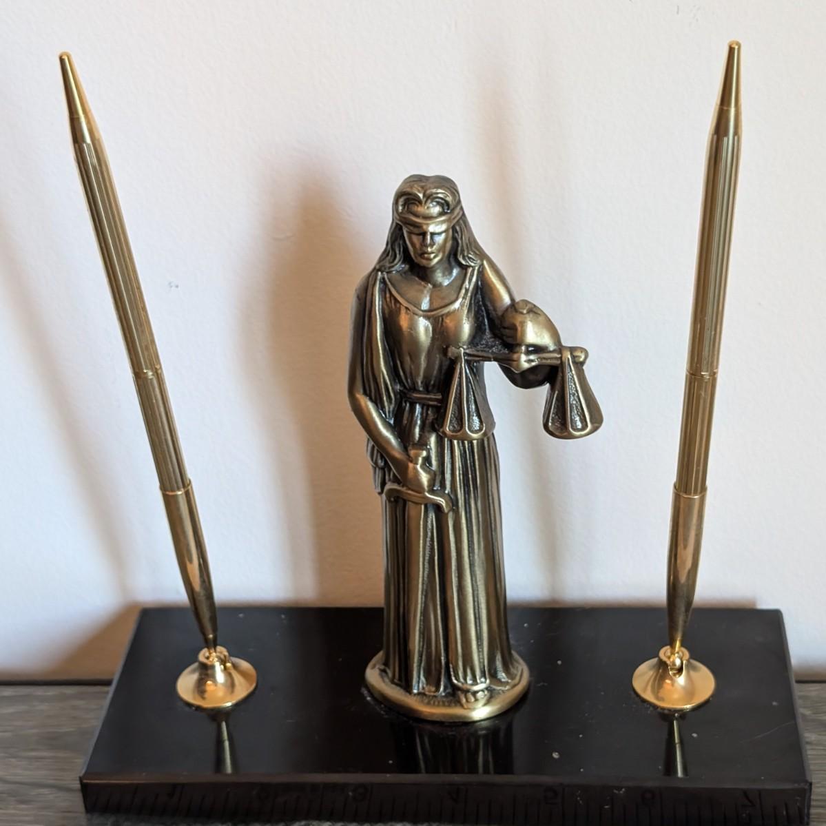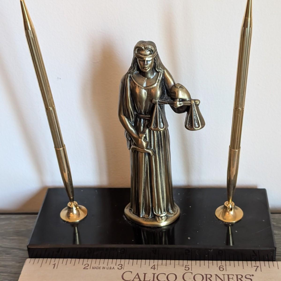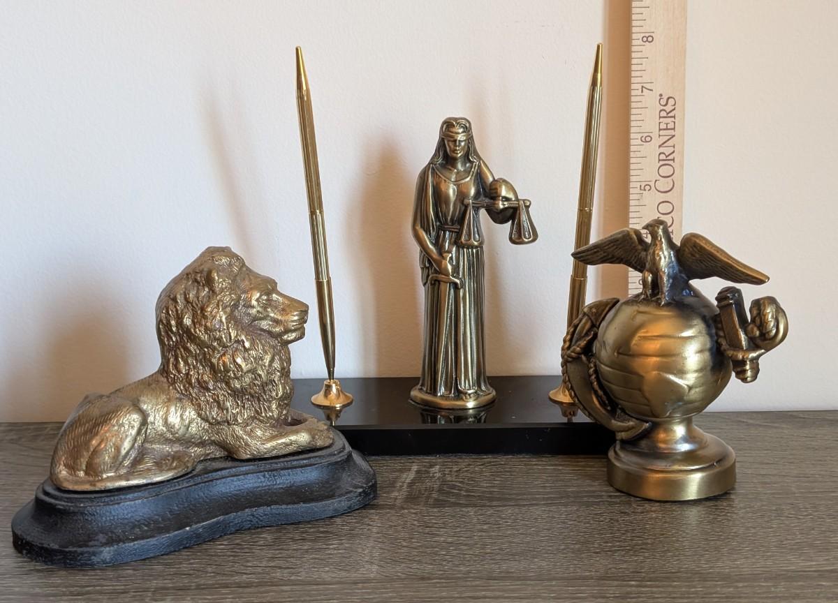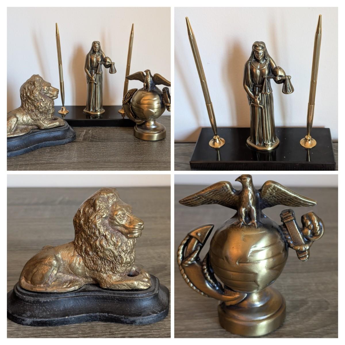 LOT 81K: Vintage Bronze/Brass Metal Desk Items, Lion Paperweight, Lady Justice Pen Holder & Love Of Money, Inc. USMC Bottle Opener