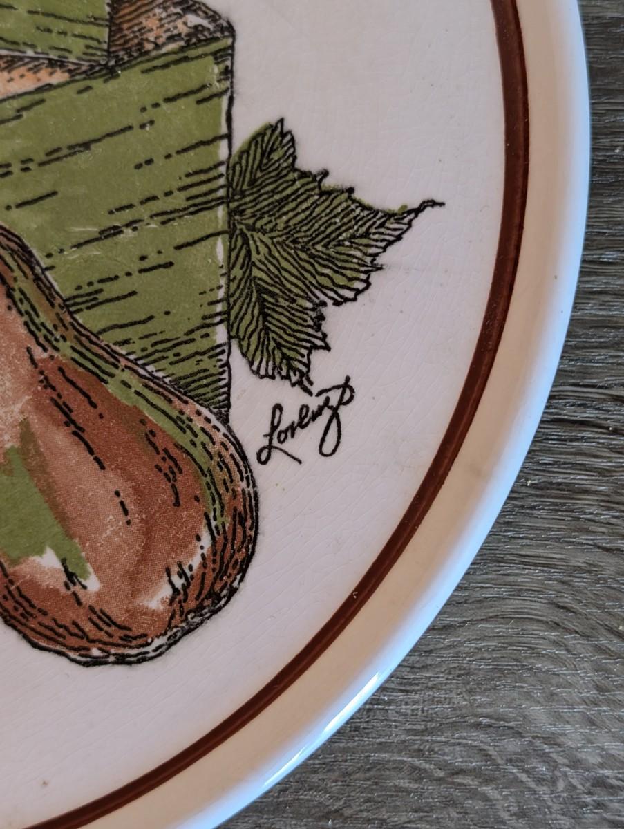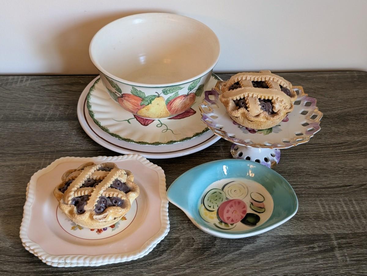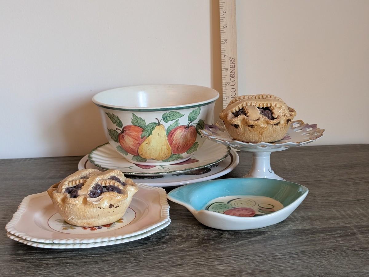 LOT 85K: Vintage Mixed Pieces, Some Signed/Stamped, Stoneware Plates, Bowls, MC Hand Painted Serving Dish, Johnson Brothers Plates, Lefton Candy dish & 2 Faux Mini Blueberry Pies
