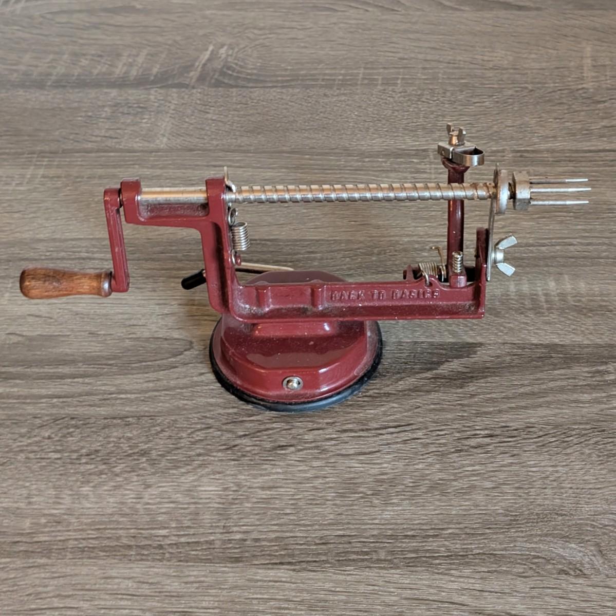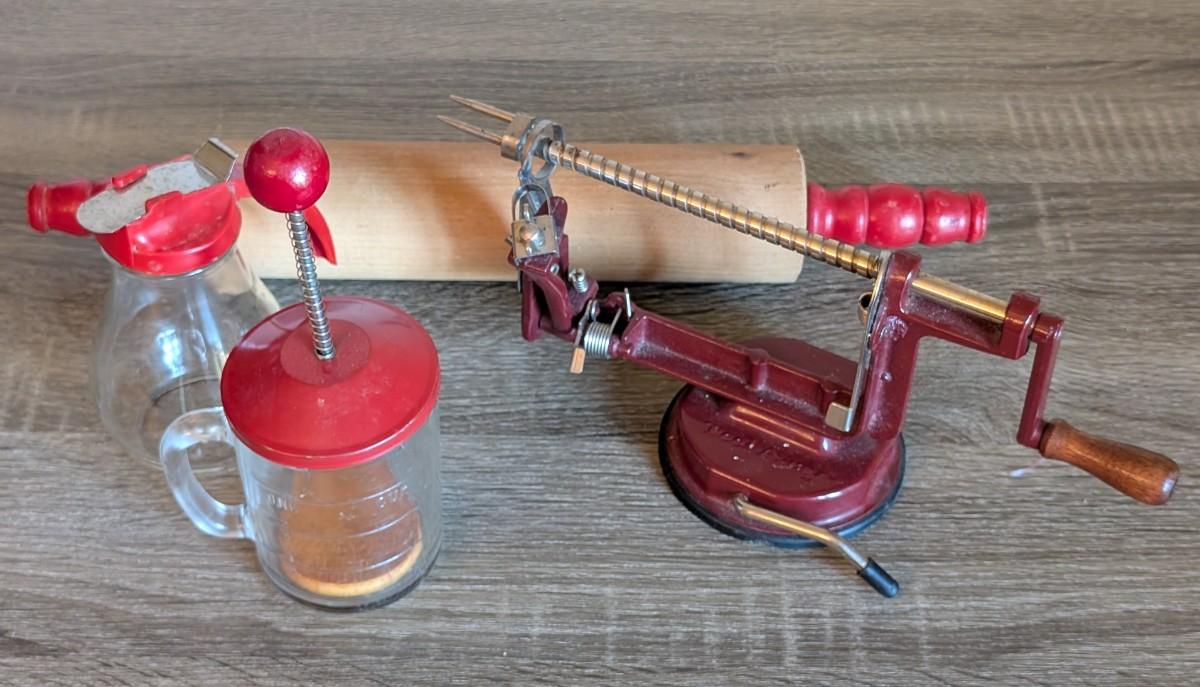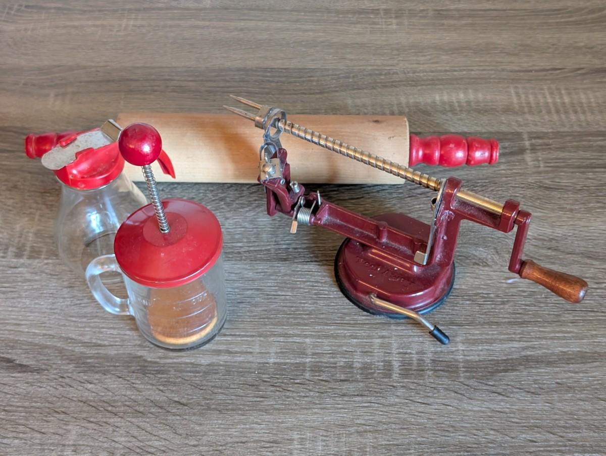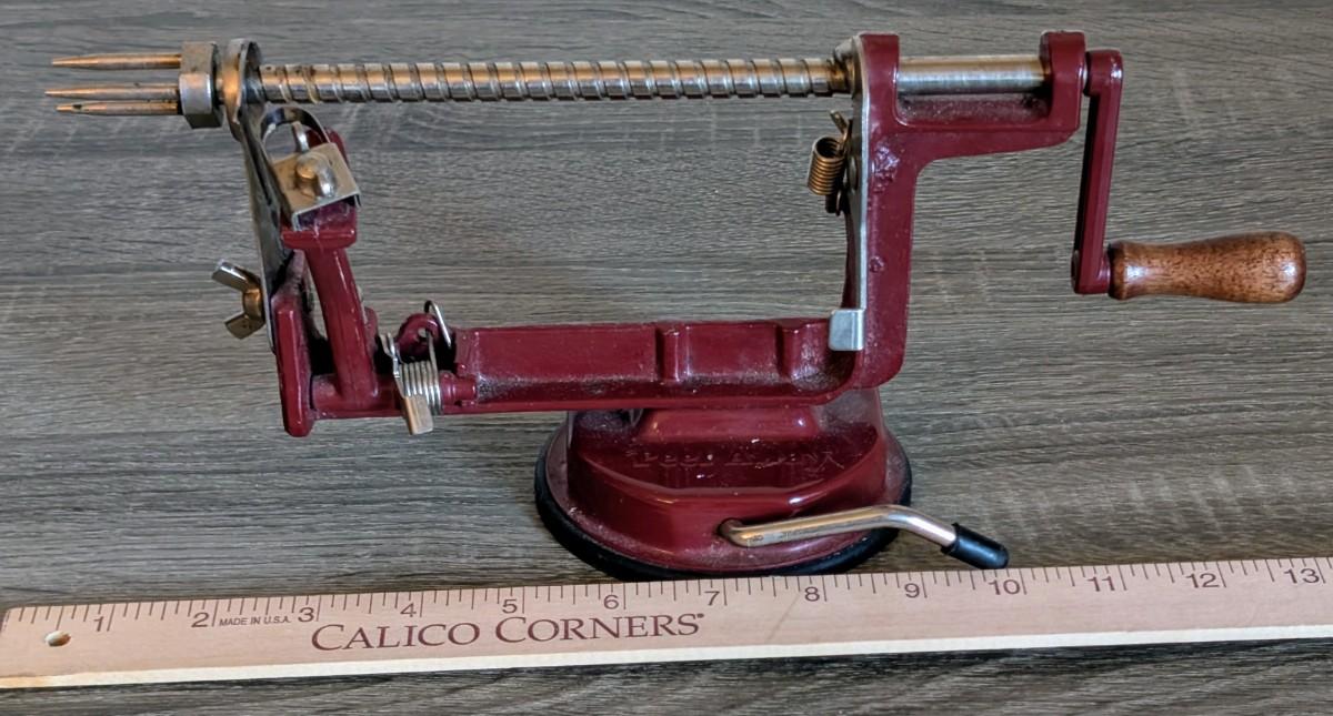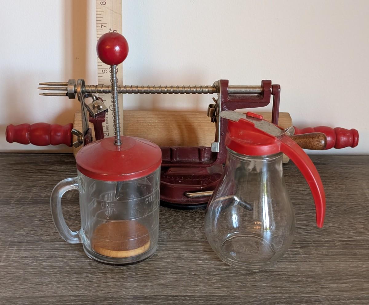 LOT 92K: How About Those Apples? Collectible Indiana Cast Iron Apple Peeler, Vintage Glass/Metal Food Chopper, Syrup Dispenser & Rolling Pin