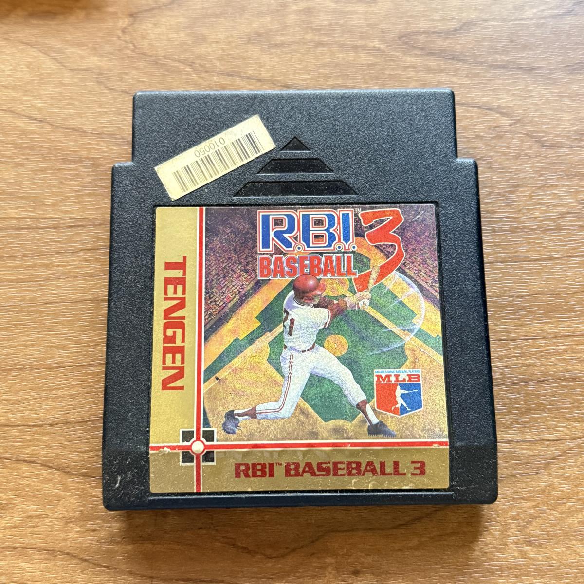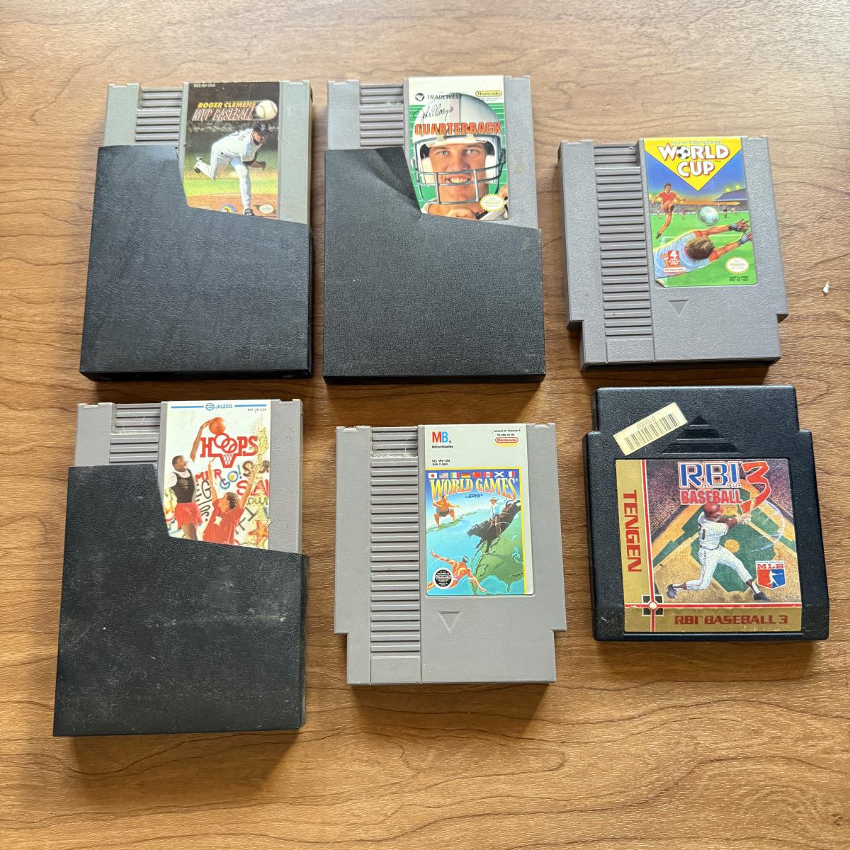 LOT 105F: 1980s-90s Tengen RBI Baseball 3 & NES Game Cartridges: Nintendo World Cup, Milton Bradley World Games by Epyx, Jaleco Hoops, John Elway's Quarterback, Roger Clemens' MVP Baseball