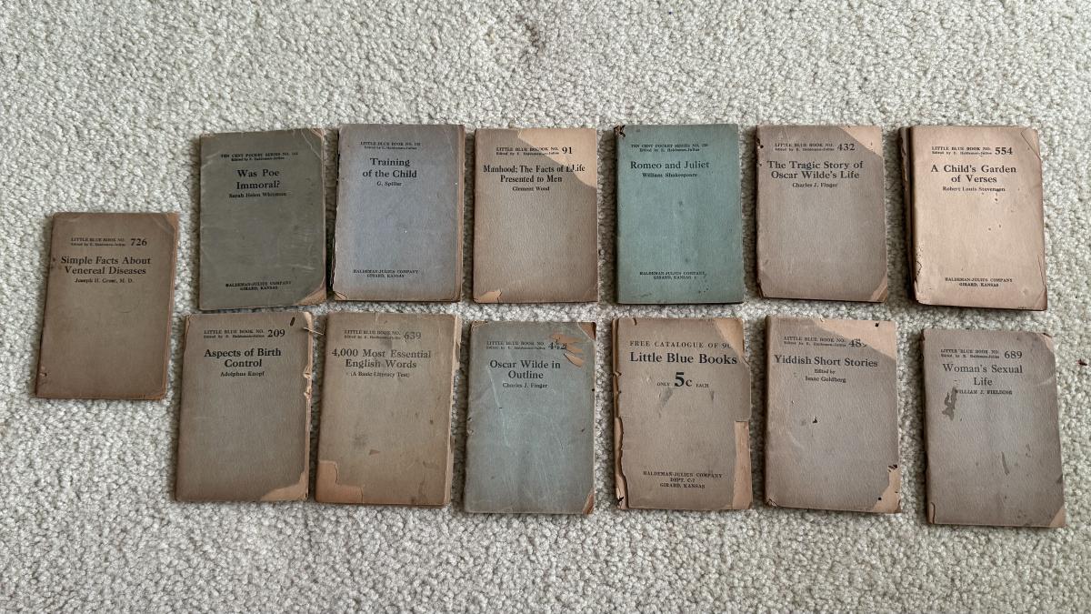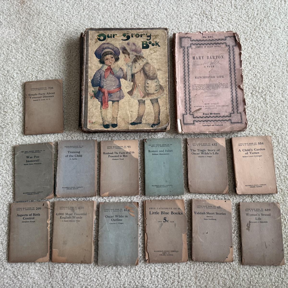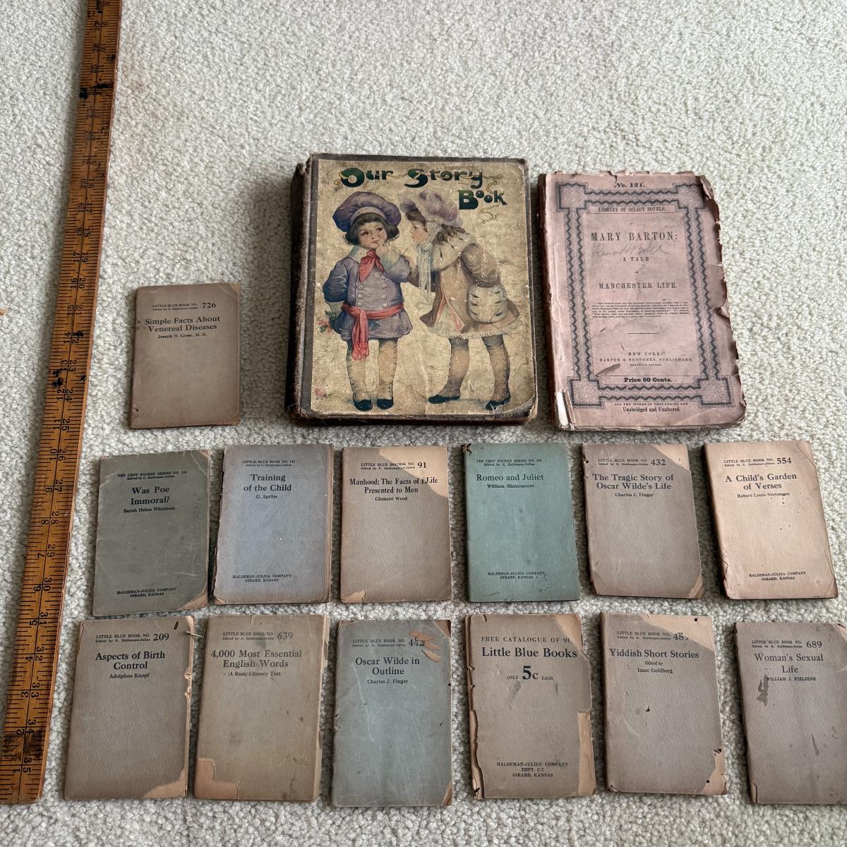 LOT 119F: 1916 Antique Children’s Book “Our Story Book,” 1920s Antique Little Blue Book Mini Paper Back Books (13) & 1940s A Tale of Manchester Life by Mary Barton Paperback Book