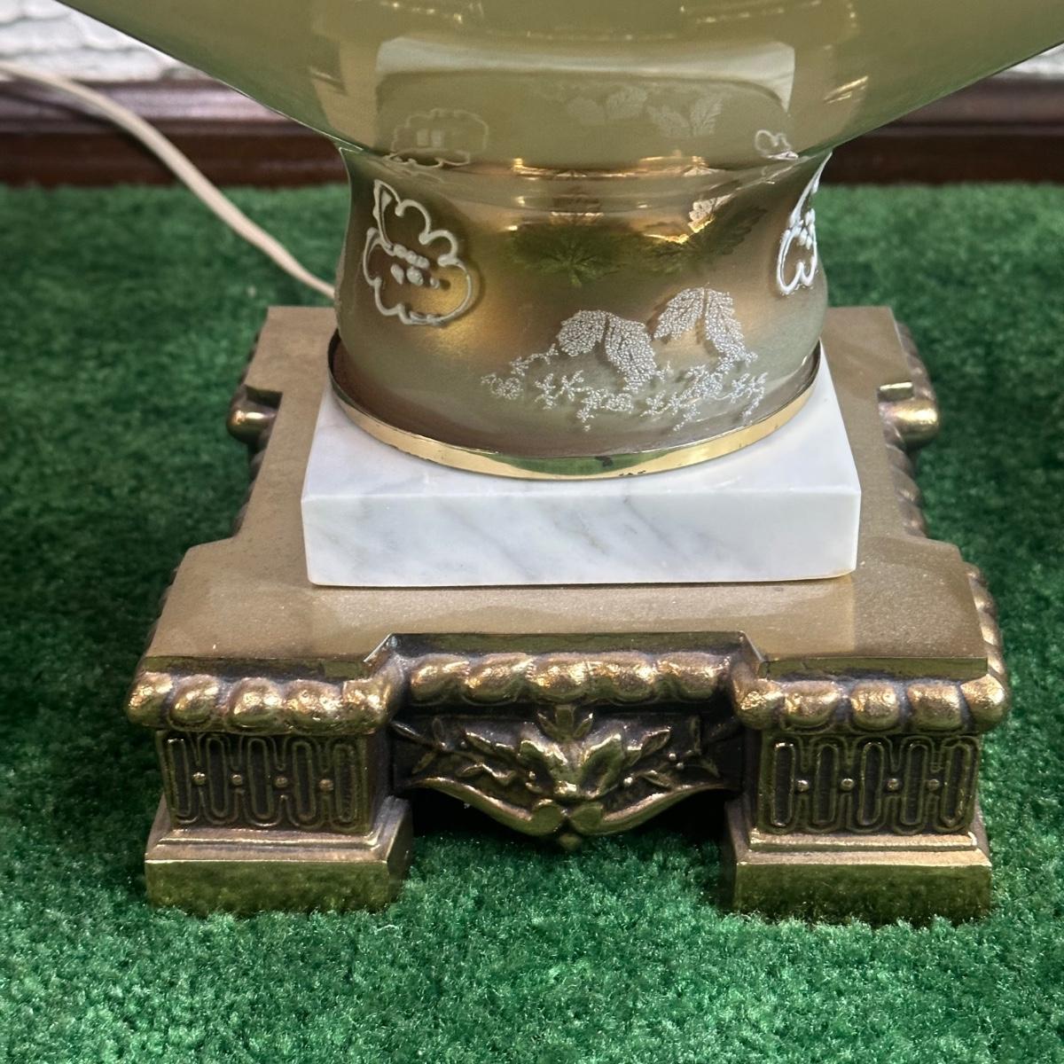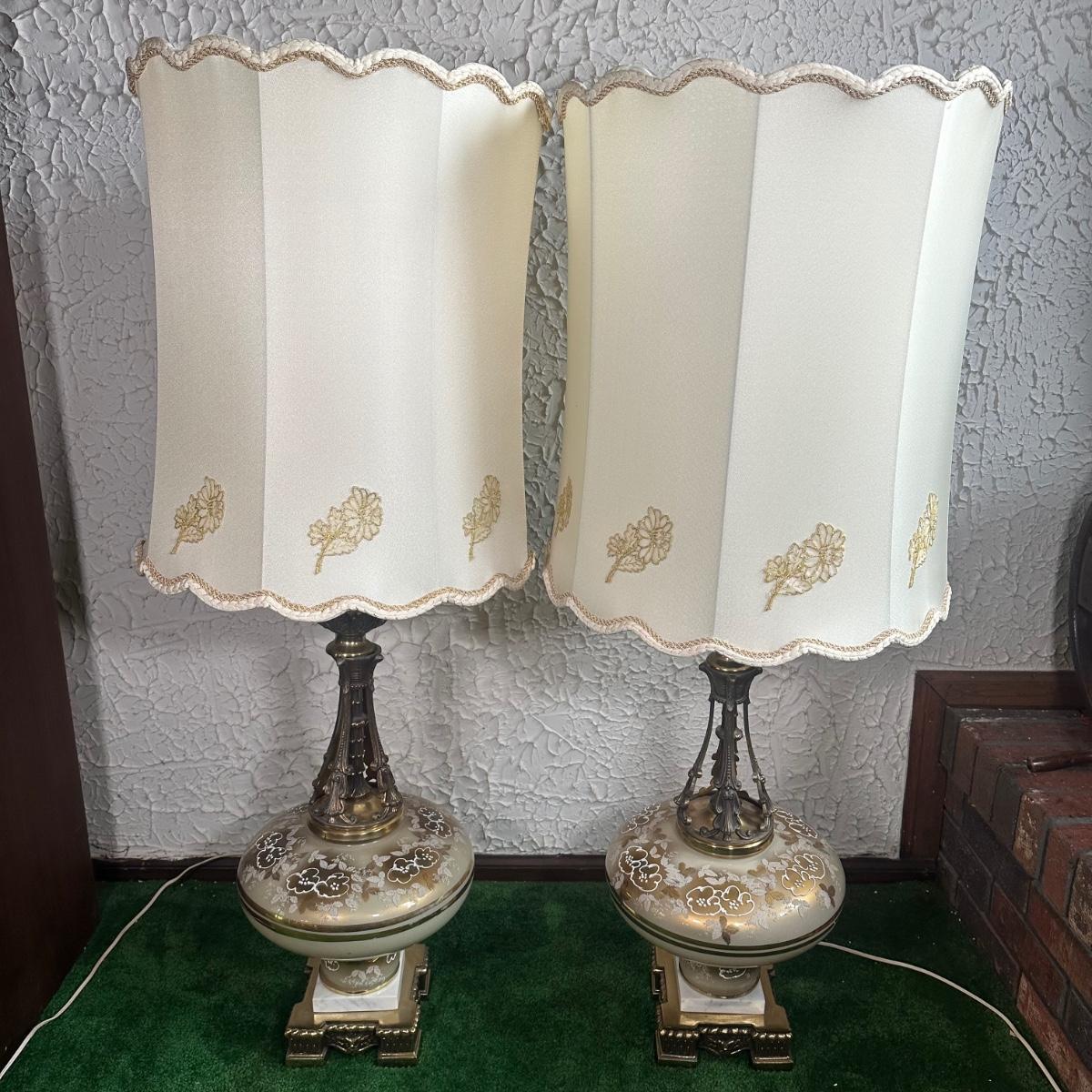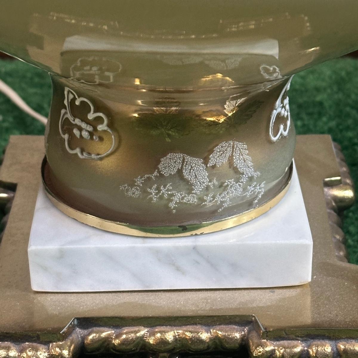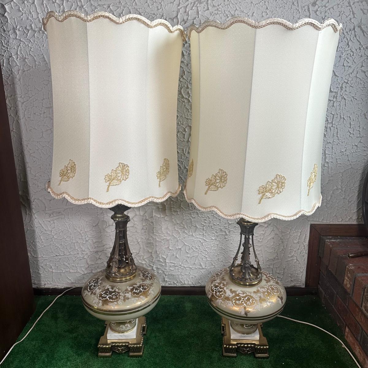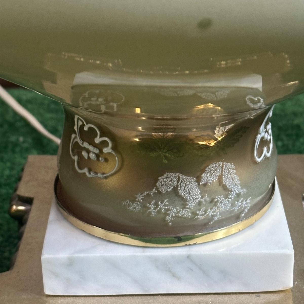 LOT 142F: Pair Of Stunning Vintage MCM Glass Brass & Marble Table Lamps with/ Shades