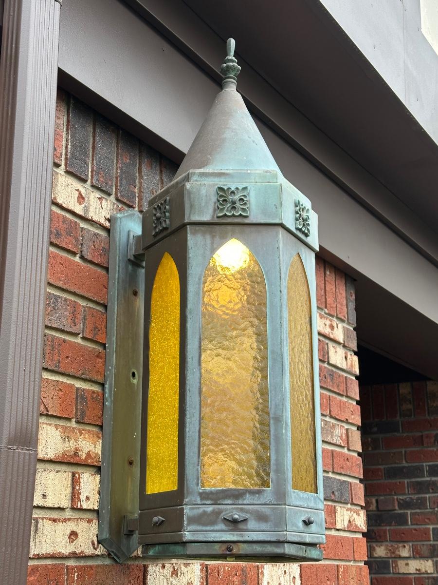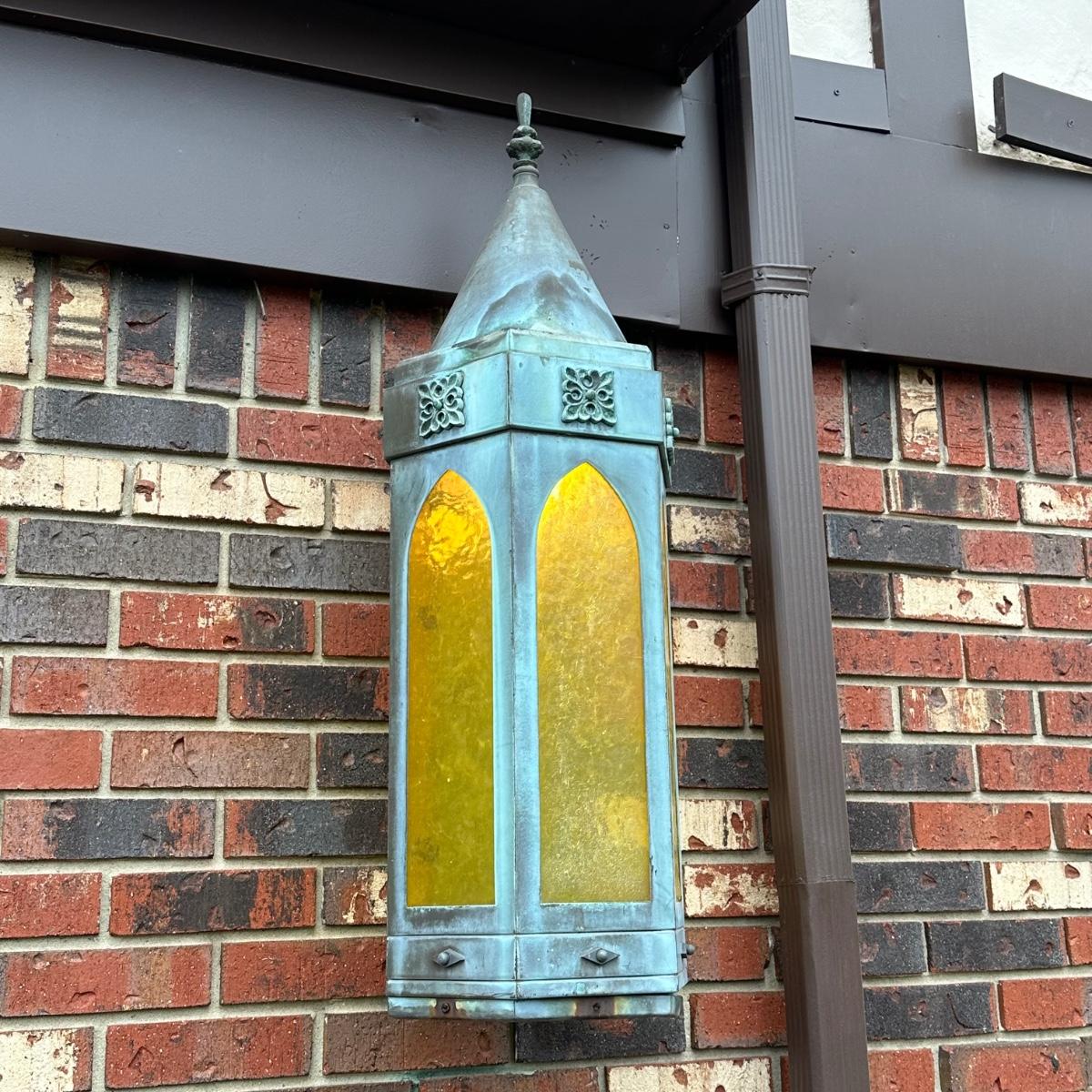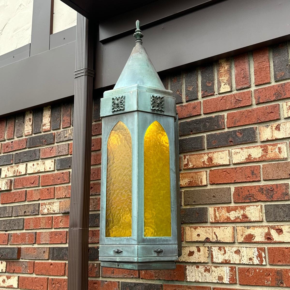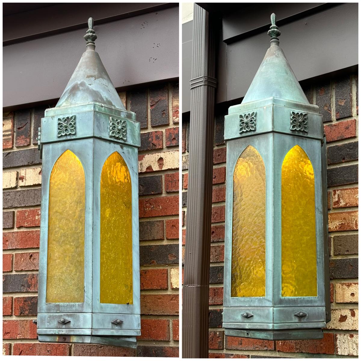LOT 154O: Pair Antique Gothic Cathedral Castle Style Stained Glass Lantern Outdoor Sconces