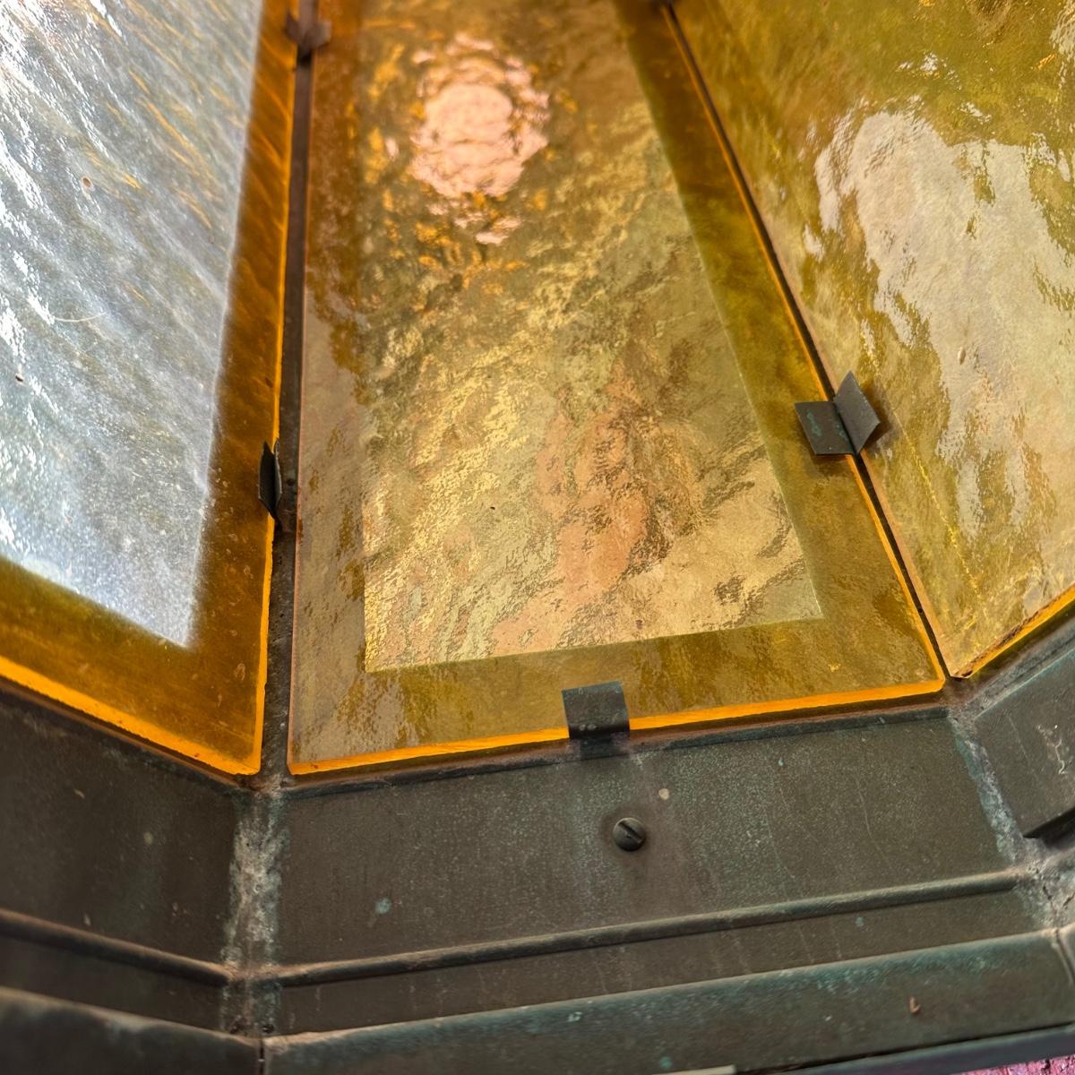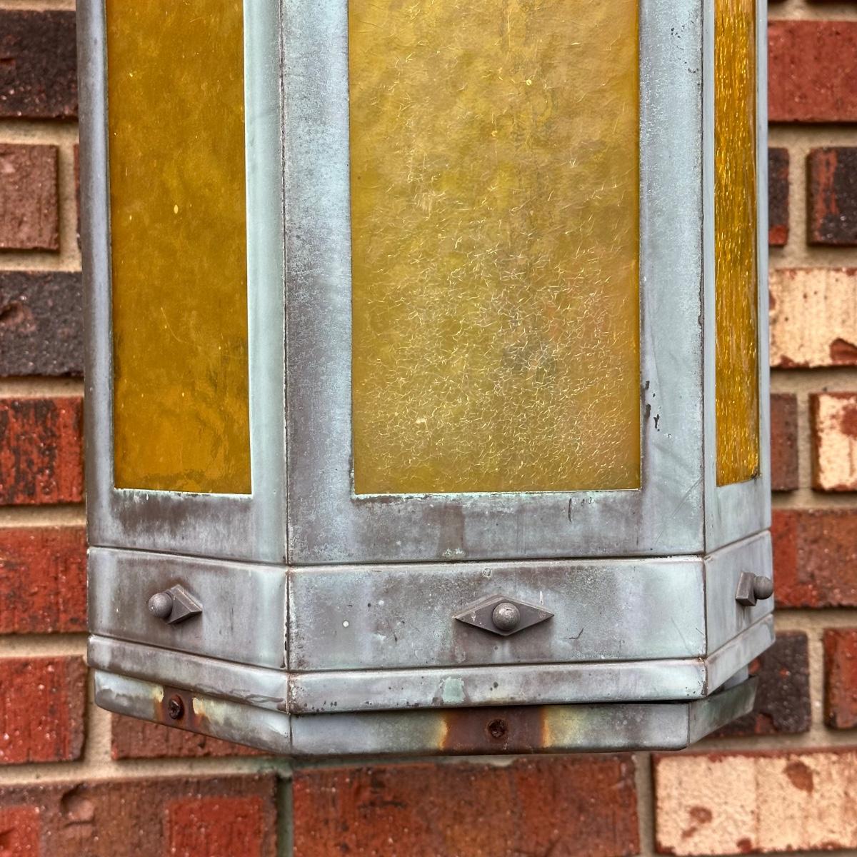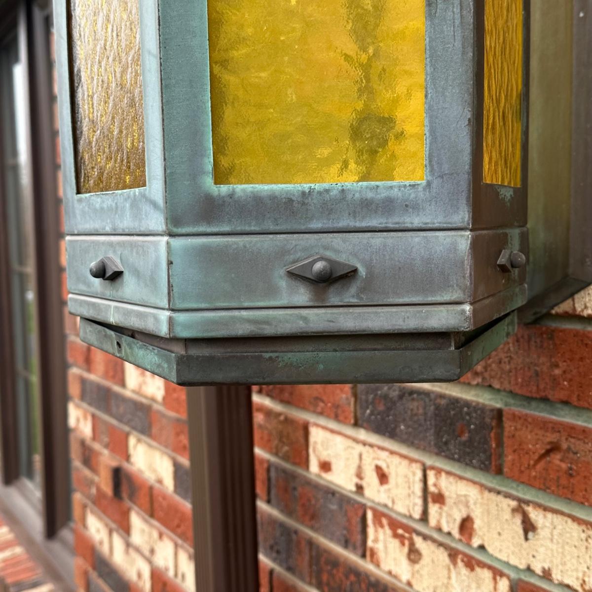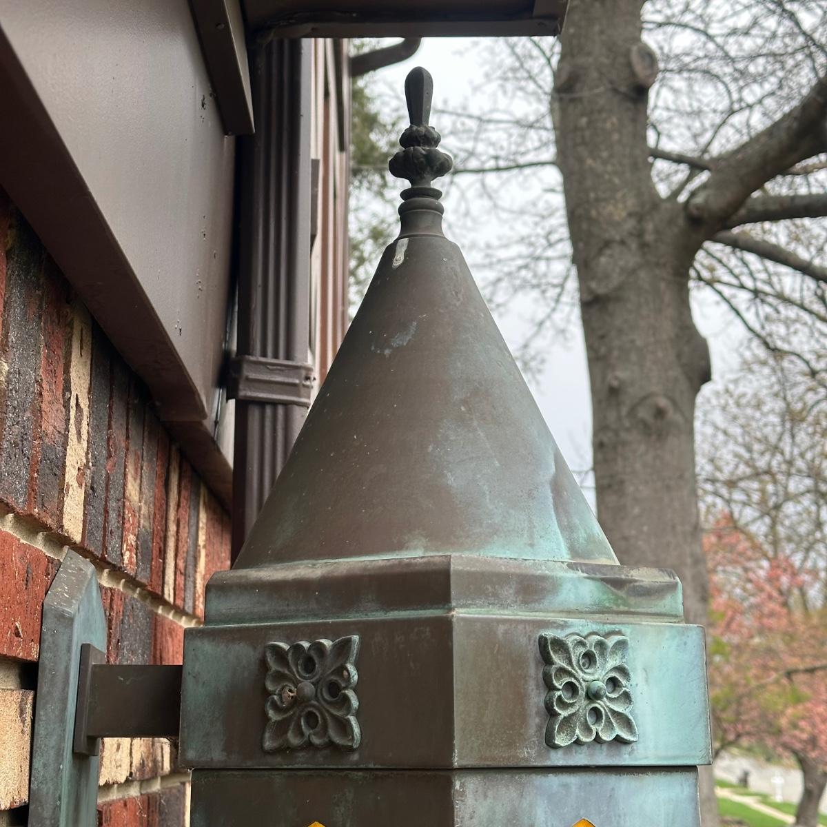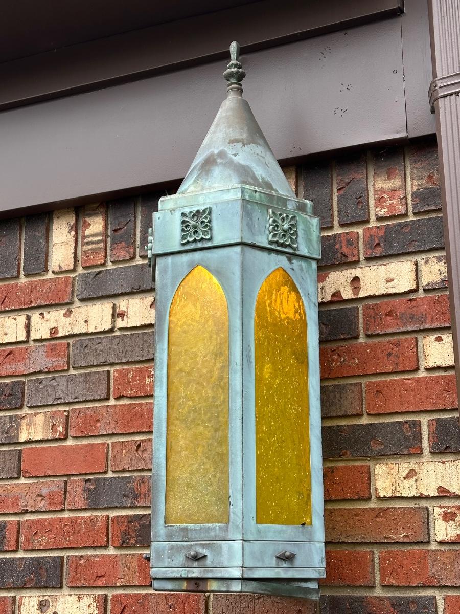 LOT 154O: Pair Antique Gothic Cathedral Castle Style Stained Glass Lantern Outdoor Sconces