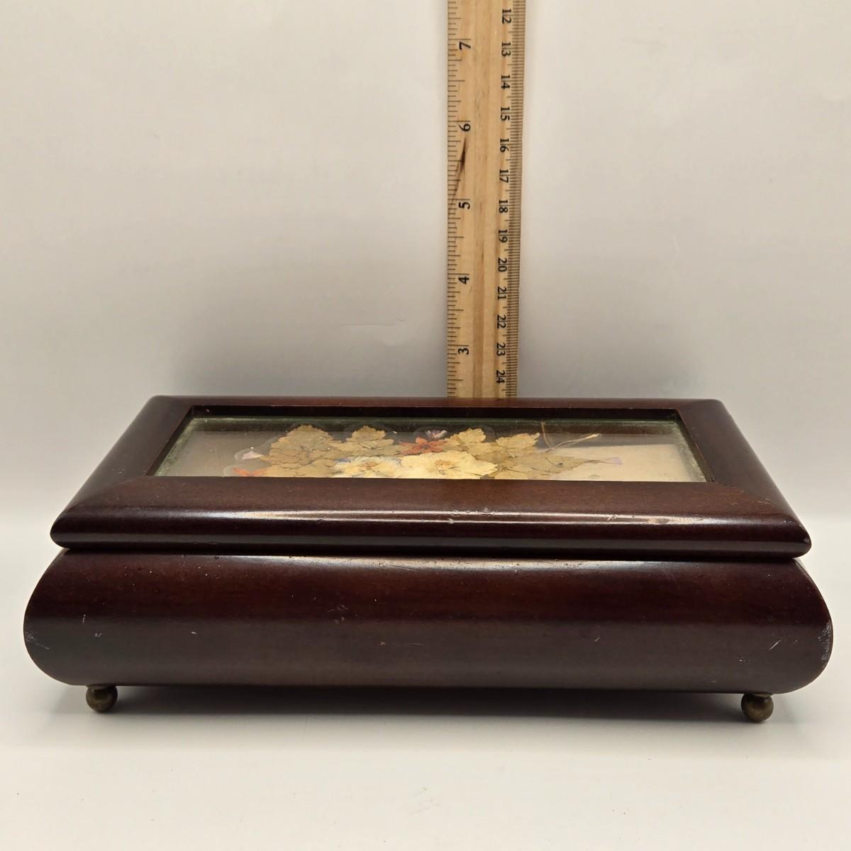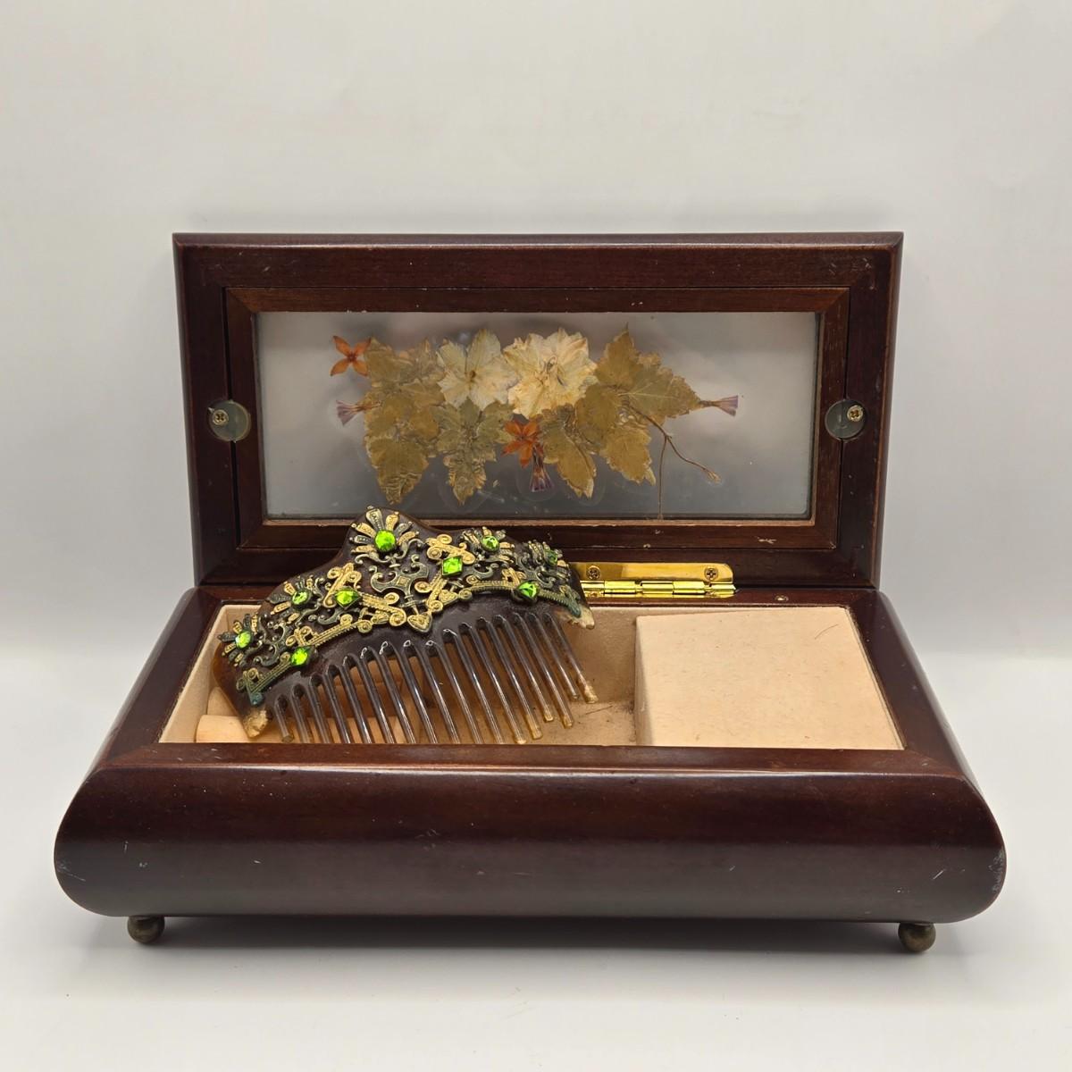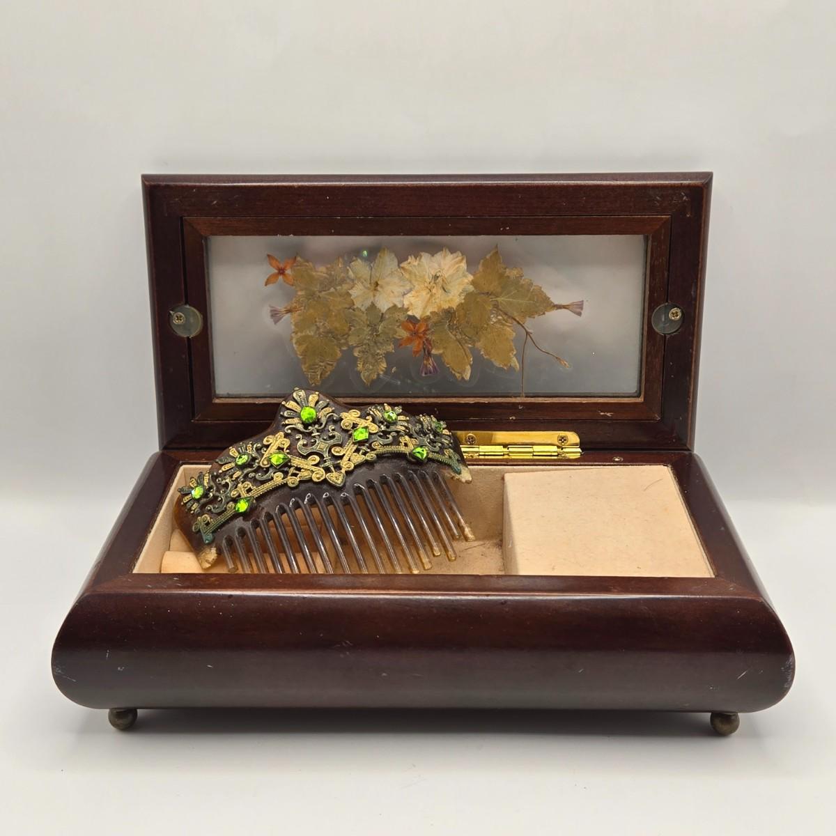 LOT 162K: Antique Victorian/Art Nouveau Era “Tortoise Shell” Brass Accented Hair Comb & Vintage Musical Jewelry Box w/ Pressed Dried Flowers in Glass Lid