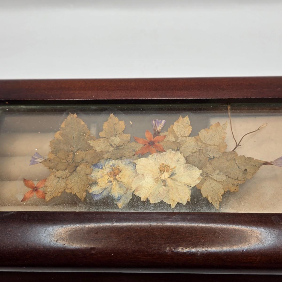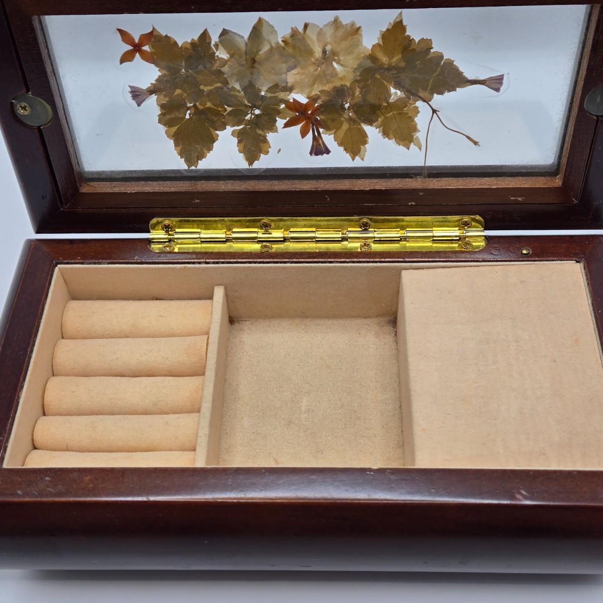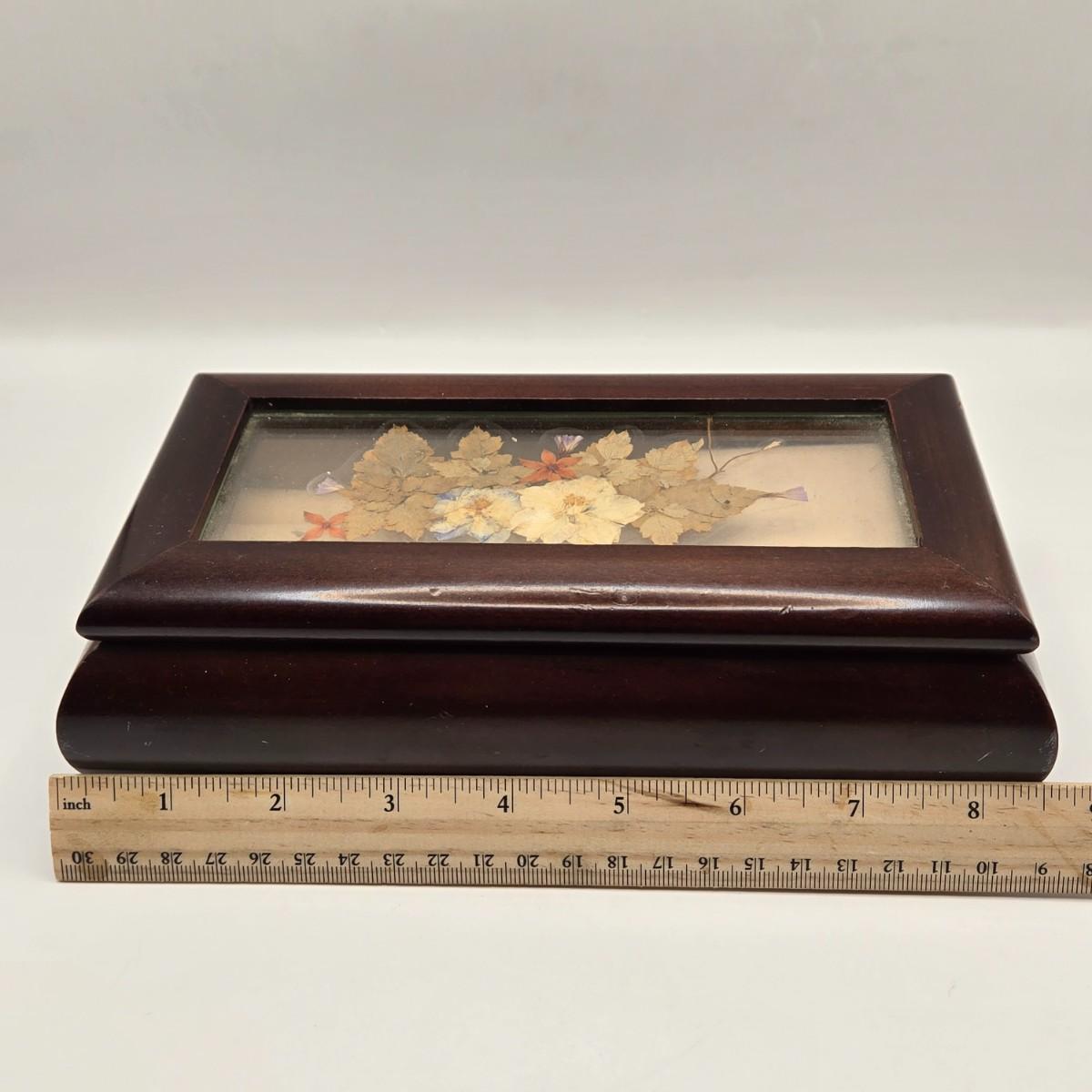 LOT 162K: Antique Victorian/Art Nouveau Era “Tortoise Shell” Brass Accented Hair Comb & Vintage Musical Jewelry Box w/ Pressed Dried Flowers in Glass Lid