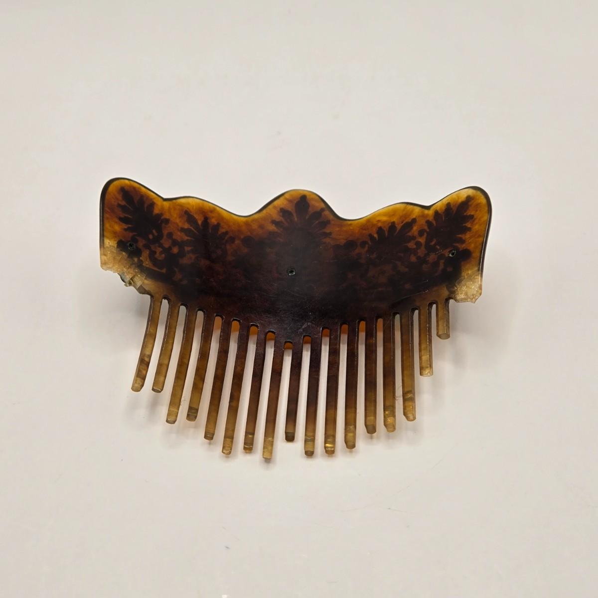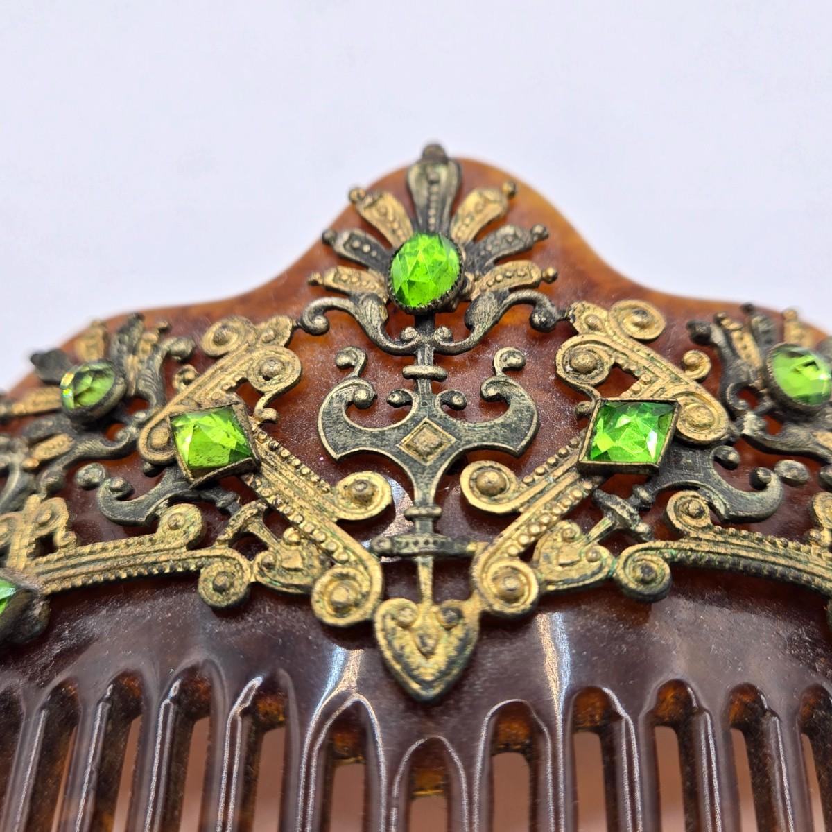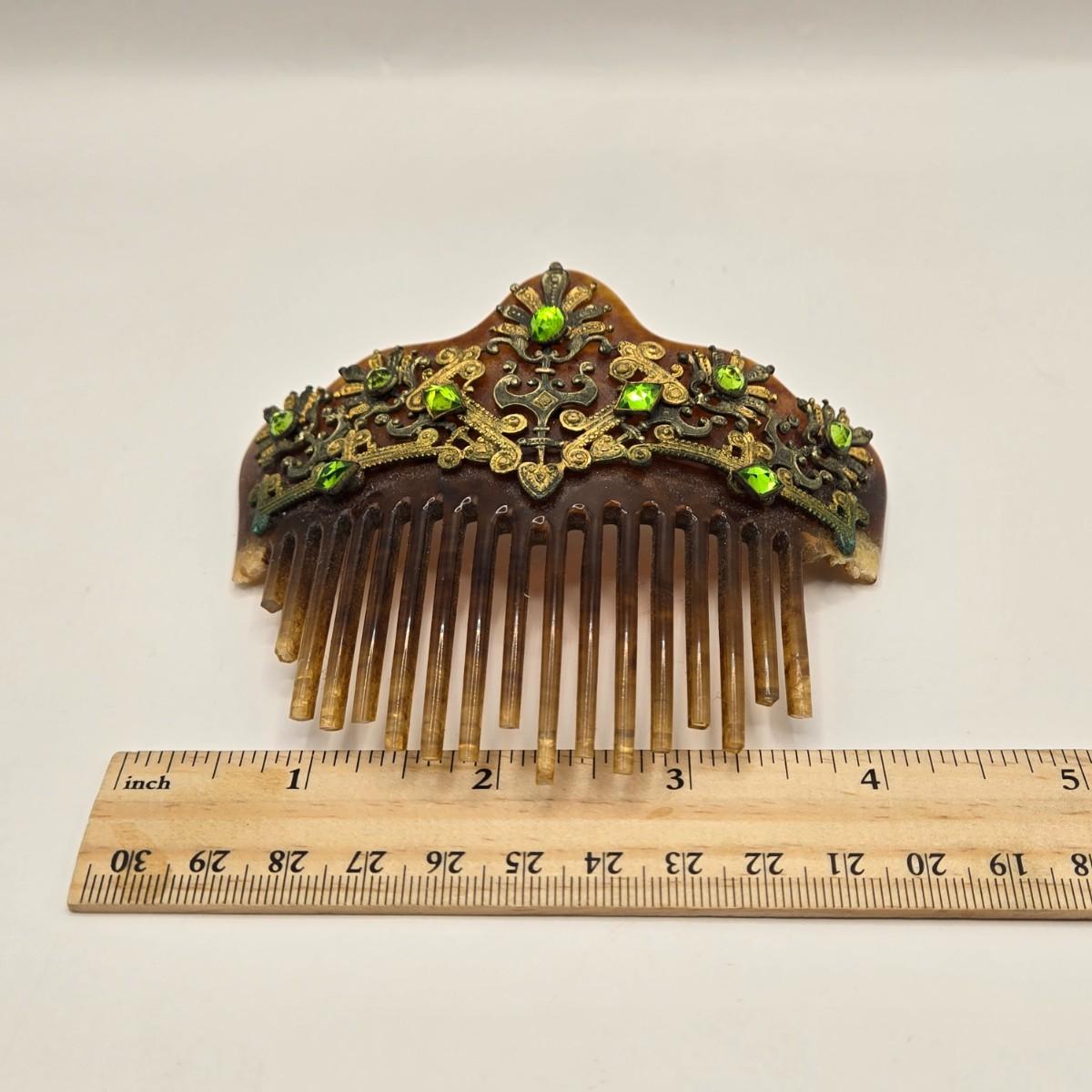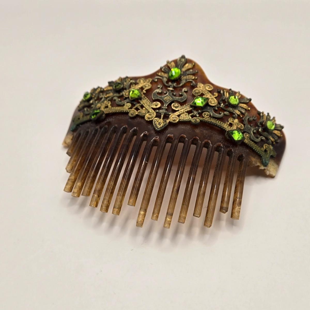 The comb is broken and likely from the late 19th century. It is embellished with brass lace accents & green stones, possibly adventurine.