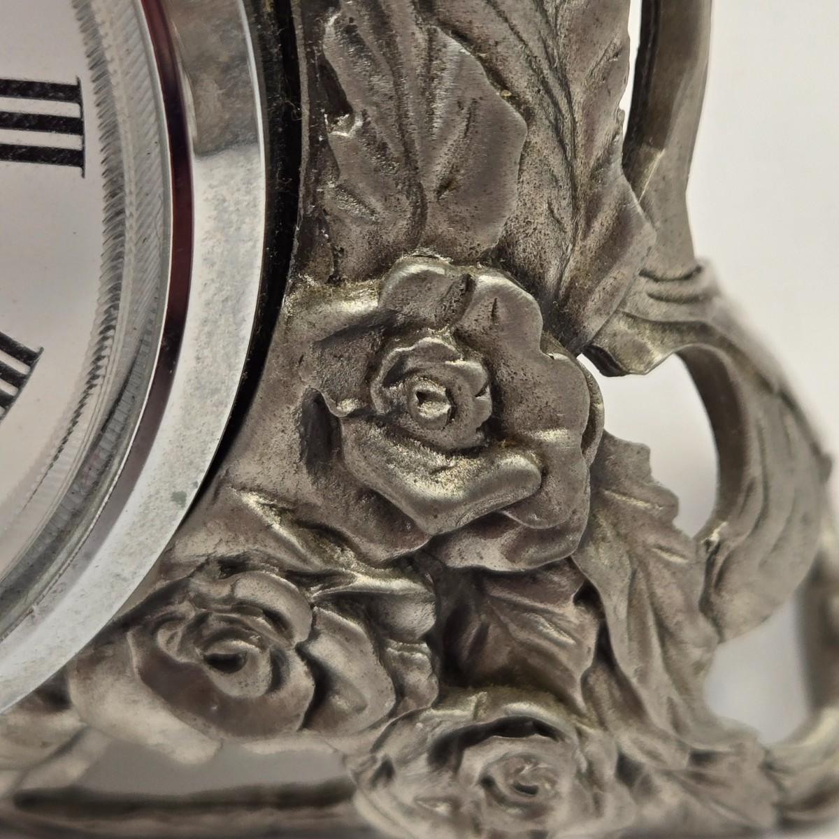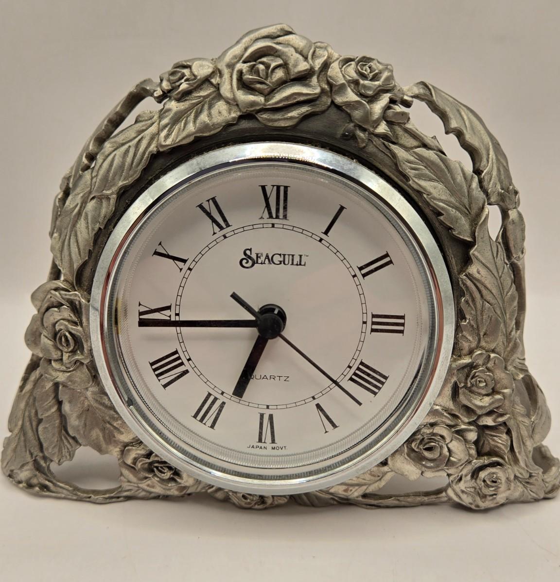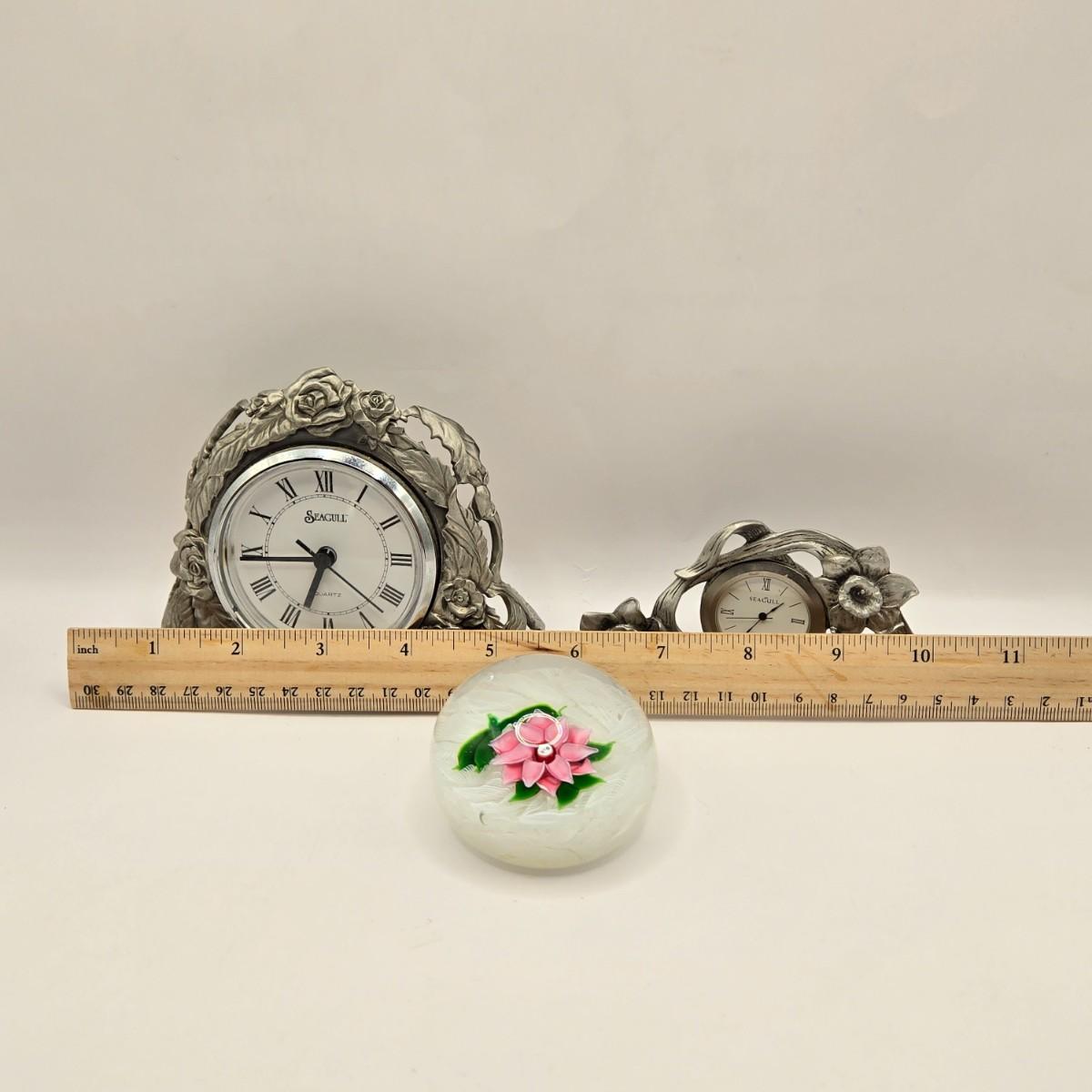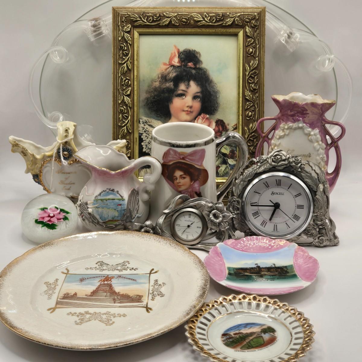 LOT 166F: Art Deco Glass Tray w/Lucite Handles, Sweeter Than the Rose Print in Ornate Frame, Porcelain & China Dishes & Bud Vases, 2 Pewter Clocks w/ Maker's Name, & Paperweight Made in Scotland