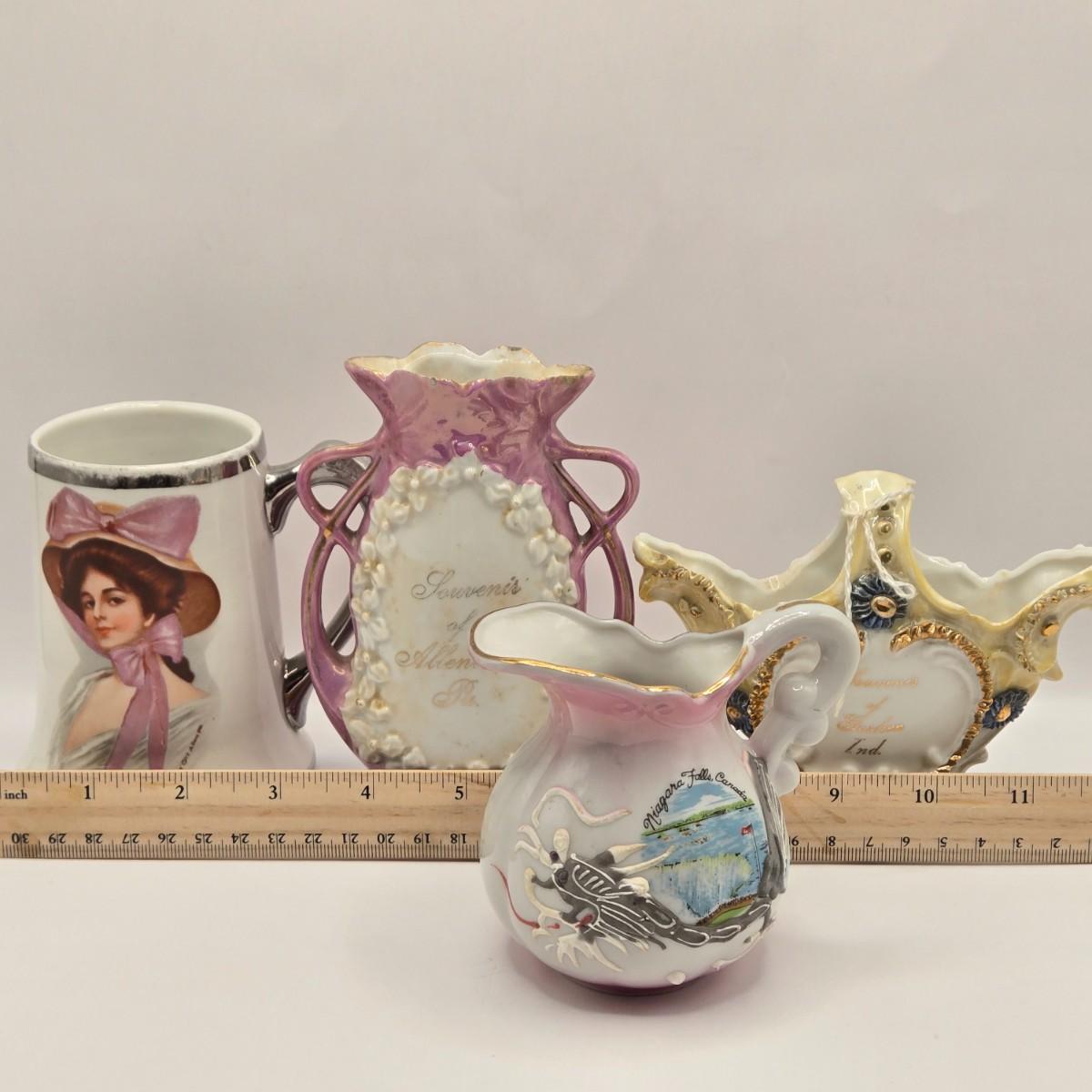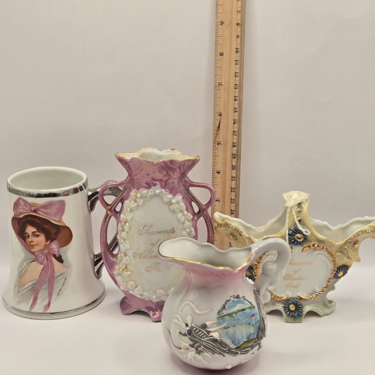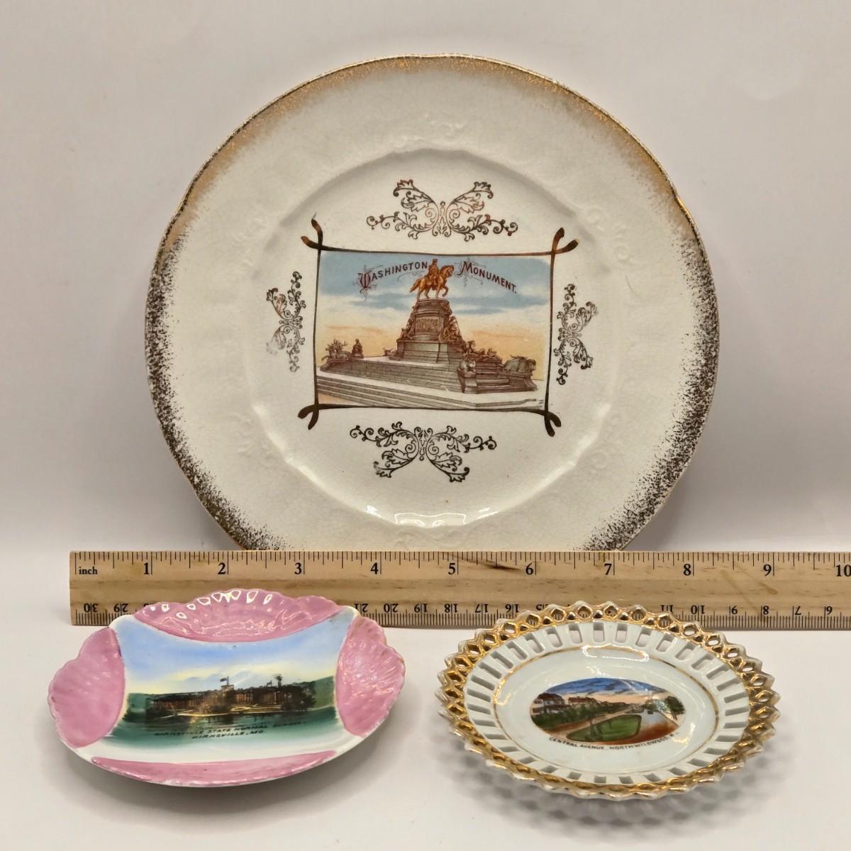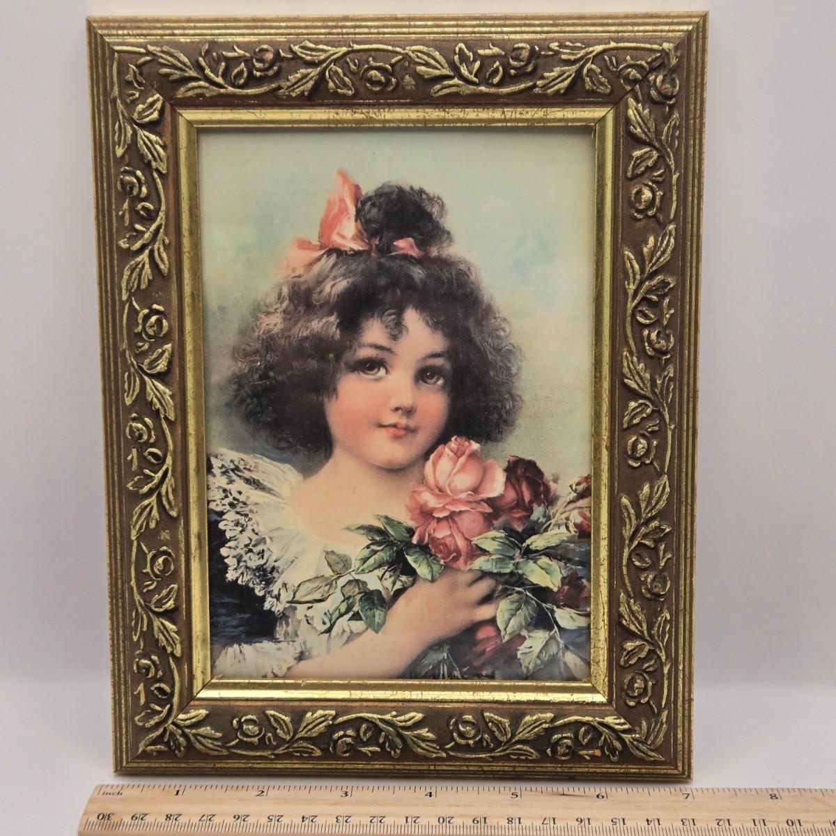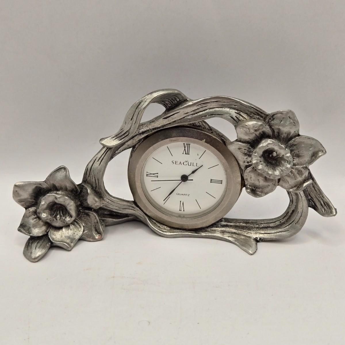 LOT 166F: Art Deco Glass Tray w/Lucite Handles, Sweeter Than the Rose Print in Ornate Frame, Porcelain & China Dishes & Bud Vases, 2 Pewter Clocks w/ Maker's Name, & Paperweight Made in Scotland