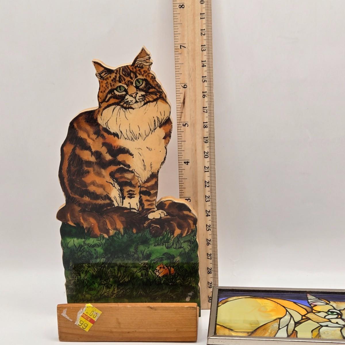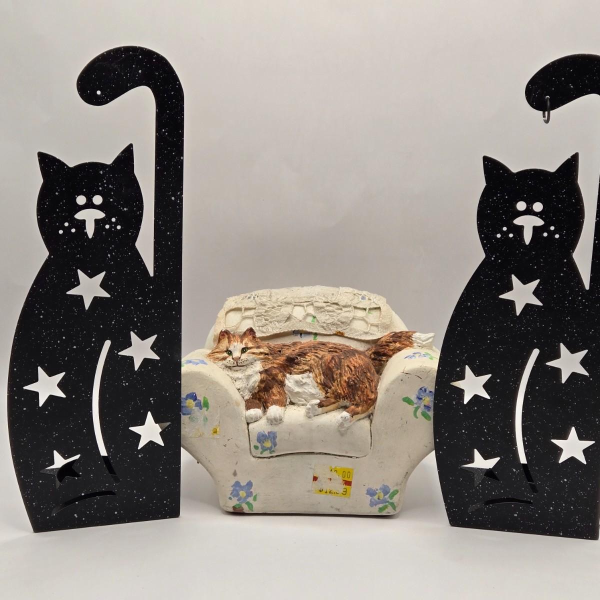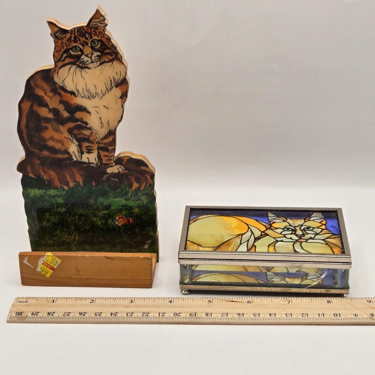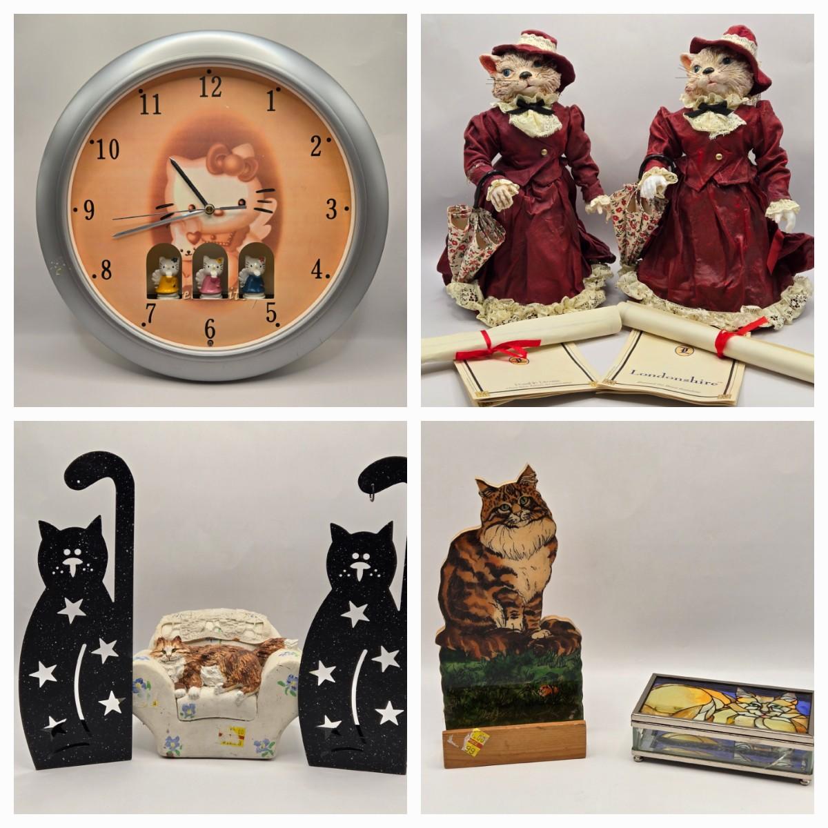 LOT 205D: Meow!! Hello Kitty Clock, 2 Vintage Possible Dreams Lady Ashley Cats, Lauren Marems Figurine, 2 Metal Tea Lite Candle Holders,Joan Baker Glass Box, & MB Design Eyeglass Holder