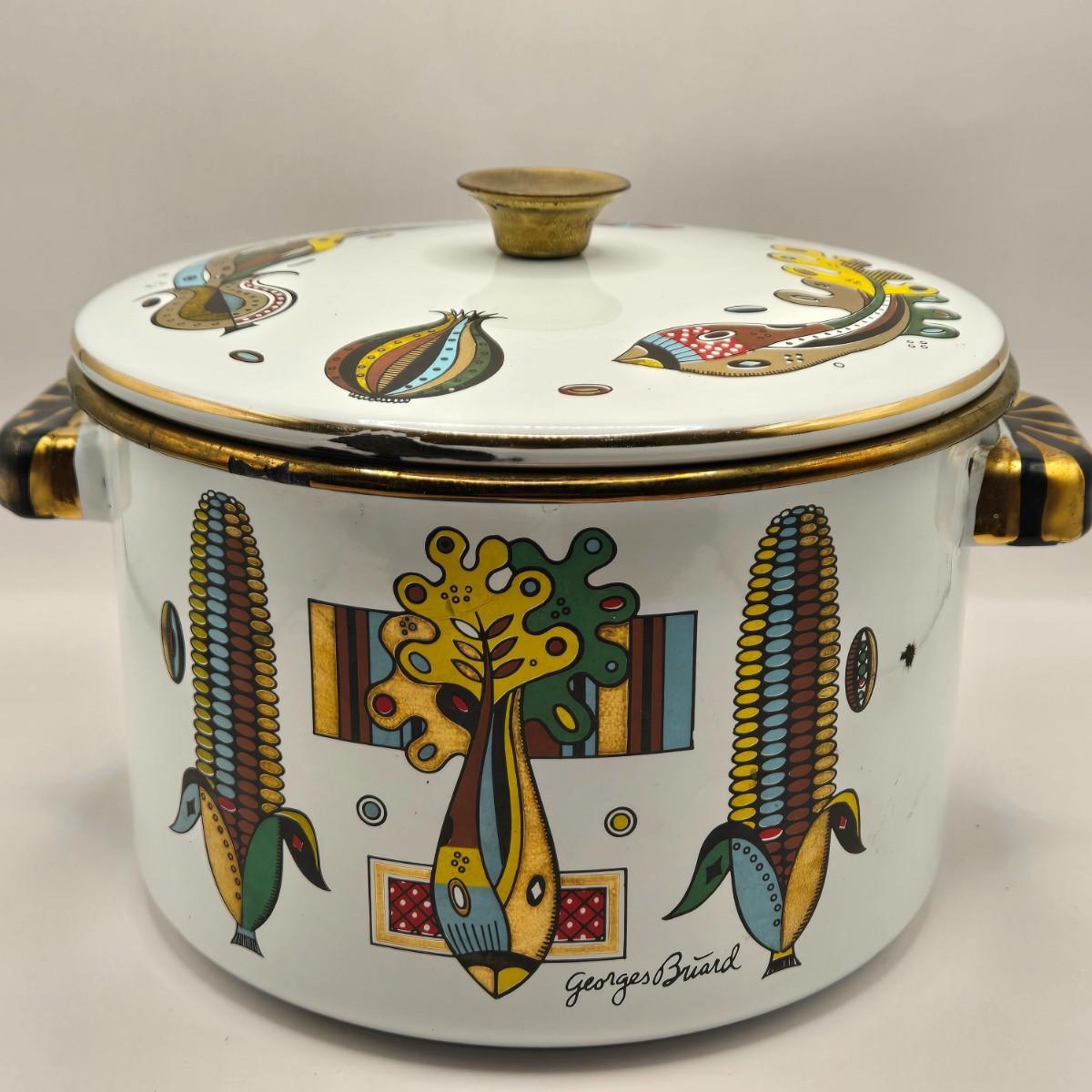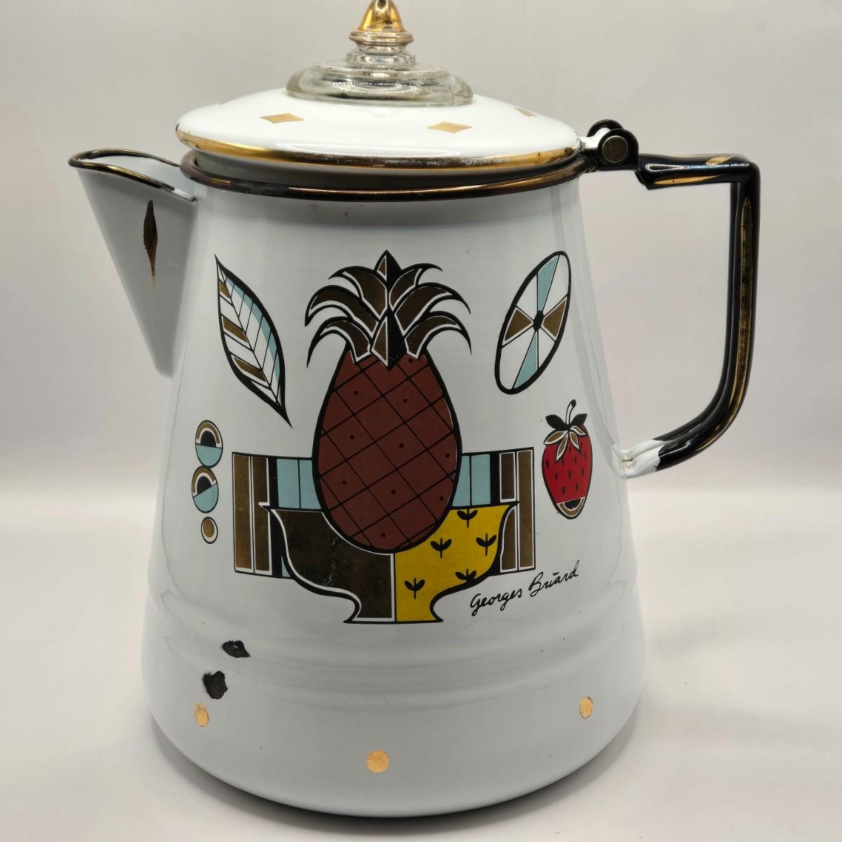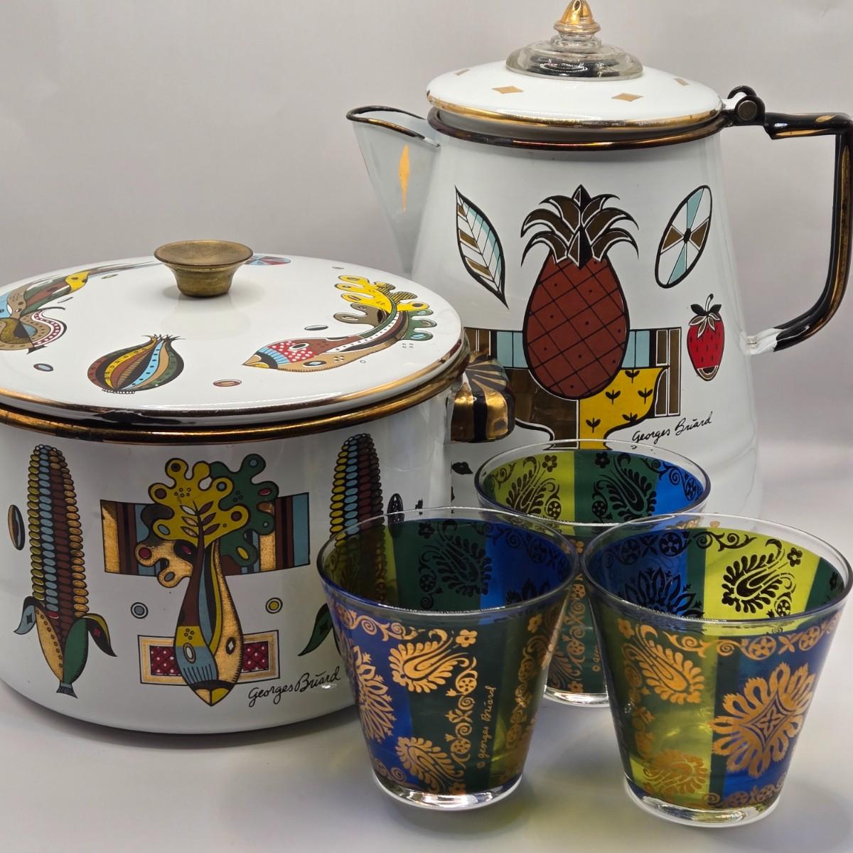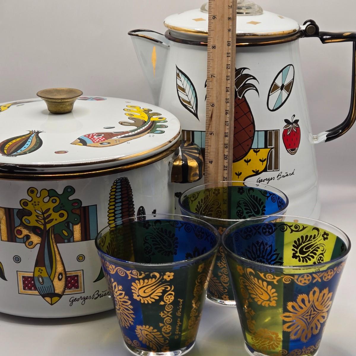 LOT 211K: MCM 1950s Georges Briard Enamel Coffee Pot &Cooking Pot and 3 Low Ball Glasses