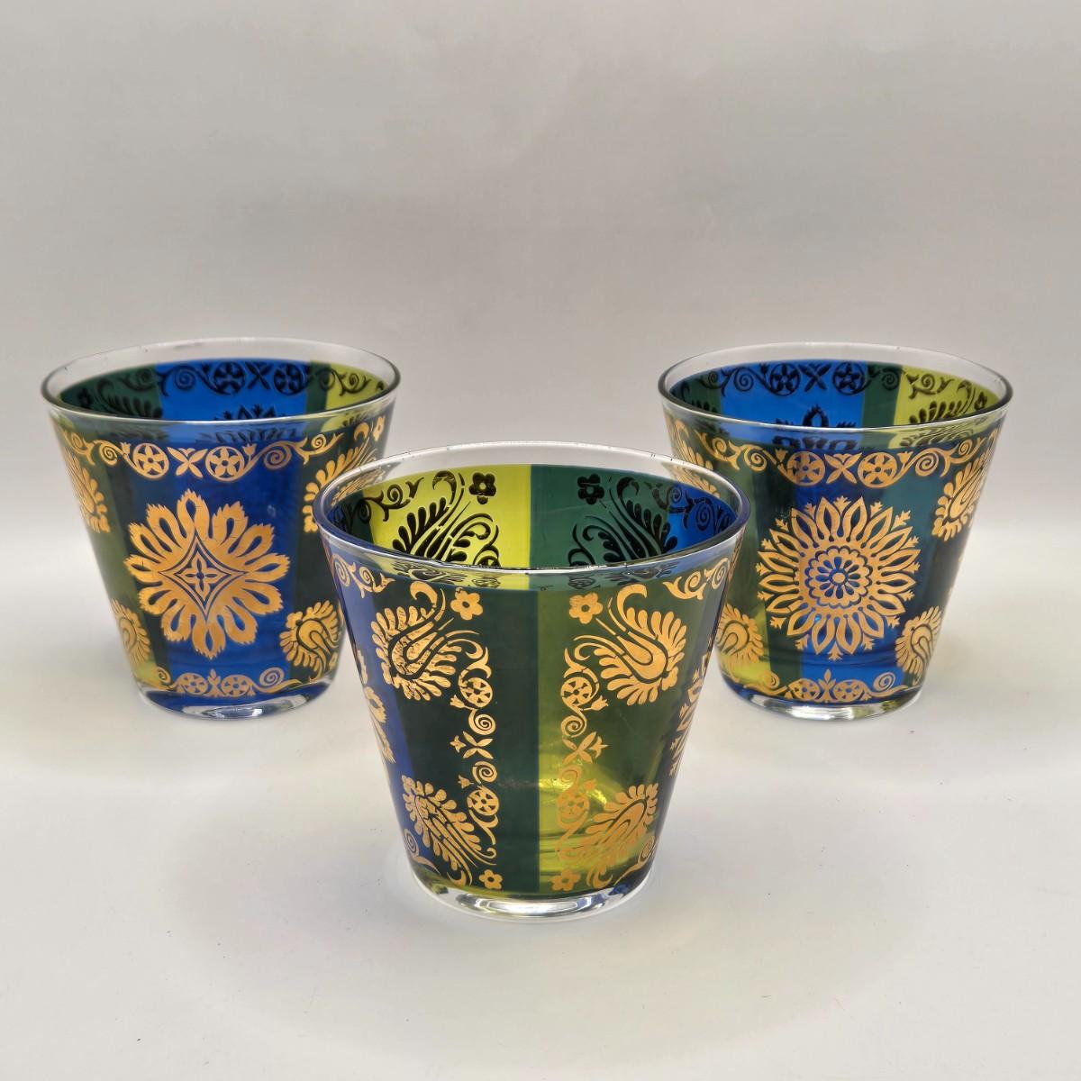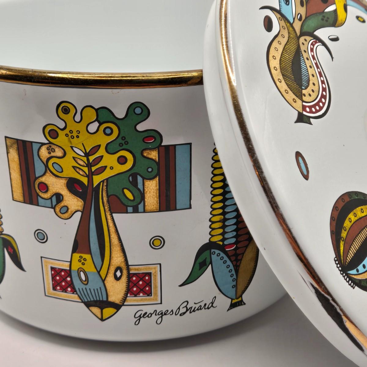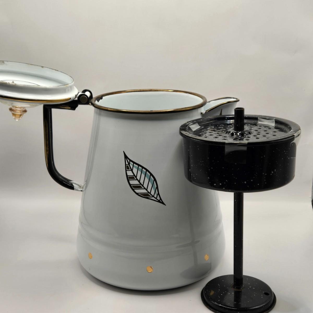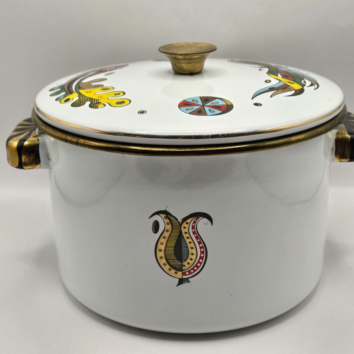LOT 211K: MCM 1950s Georges Briard Enamel Coffee Pot &Cooking Pot and 3 Low Ball Glasses