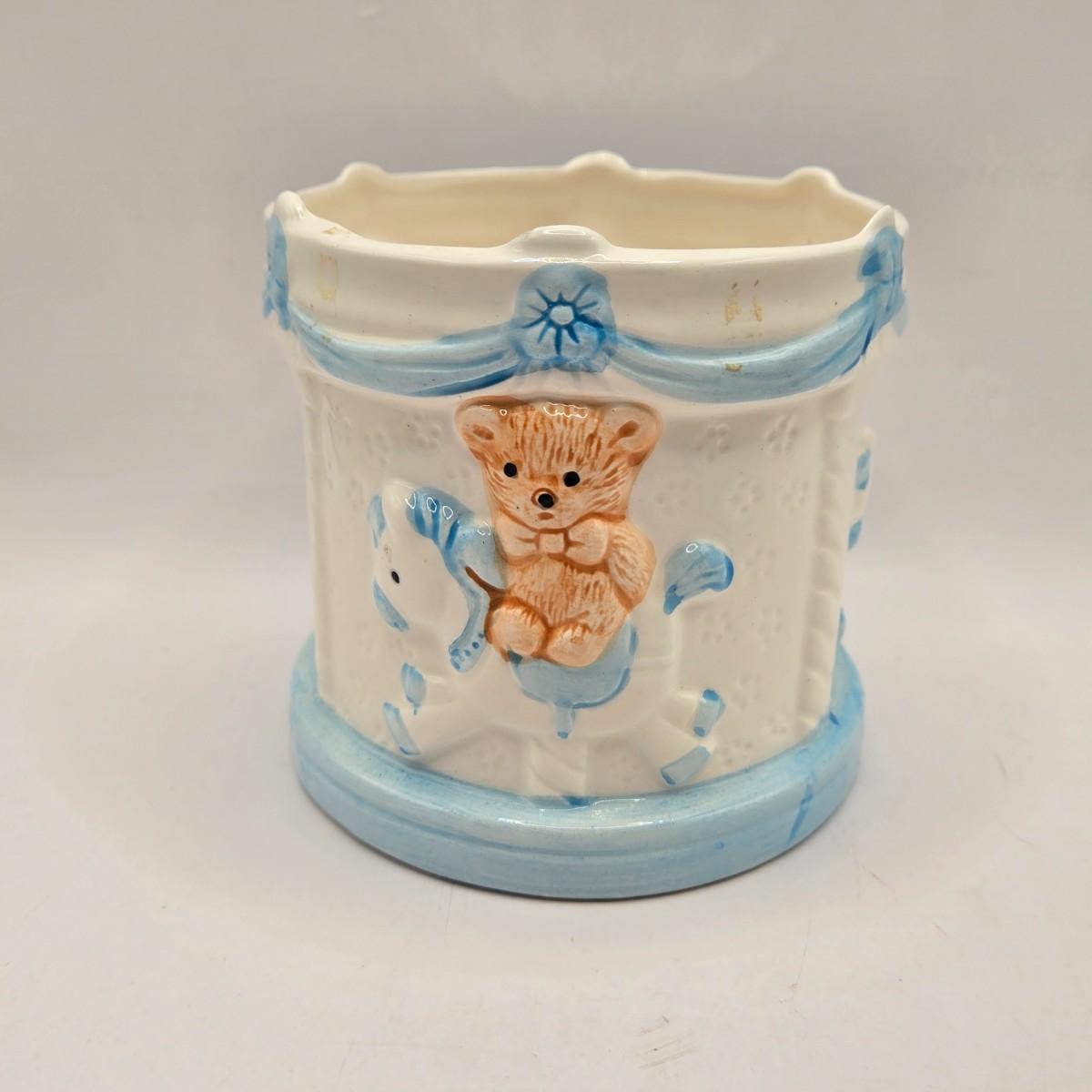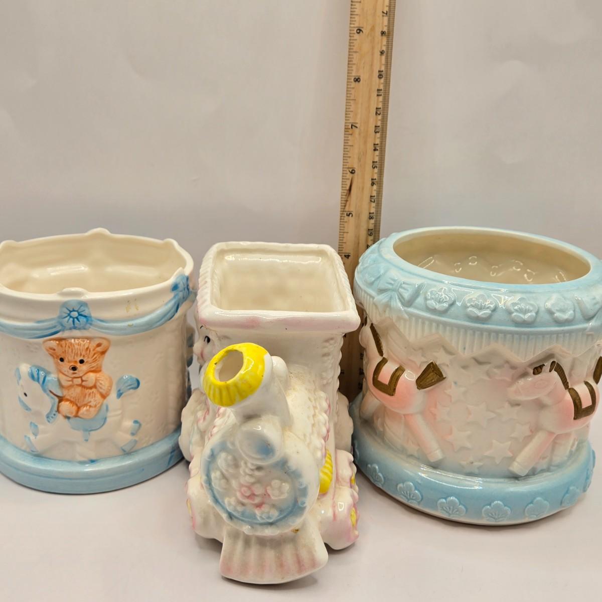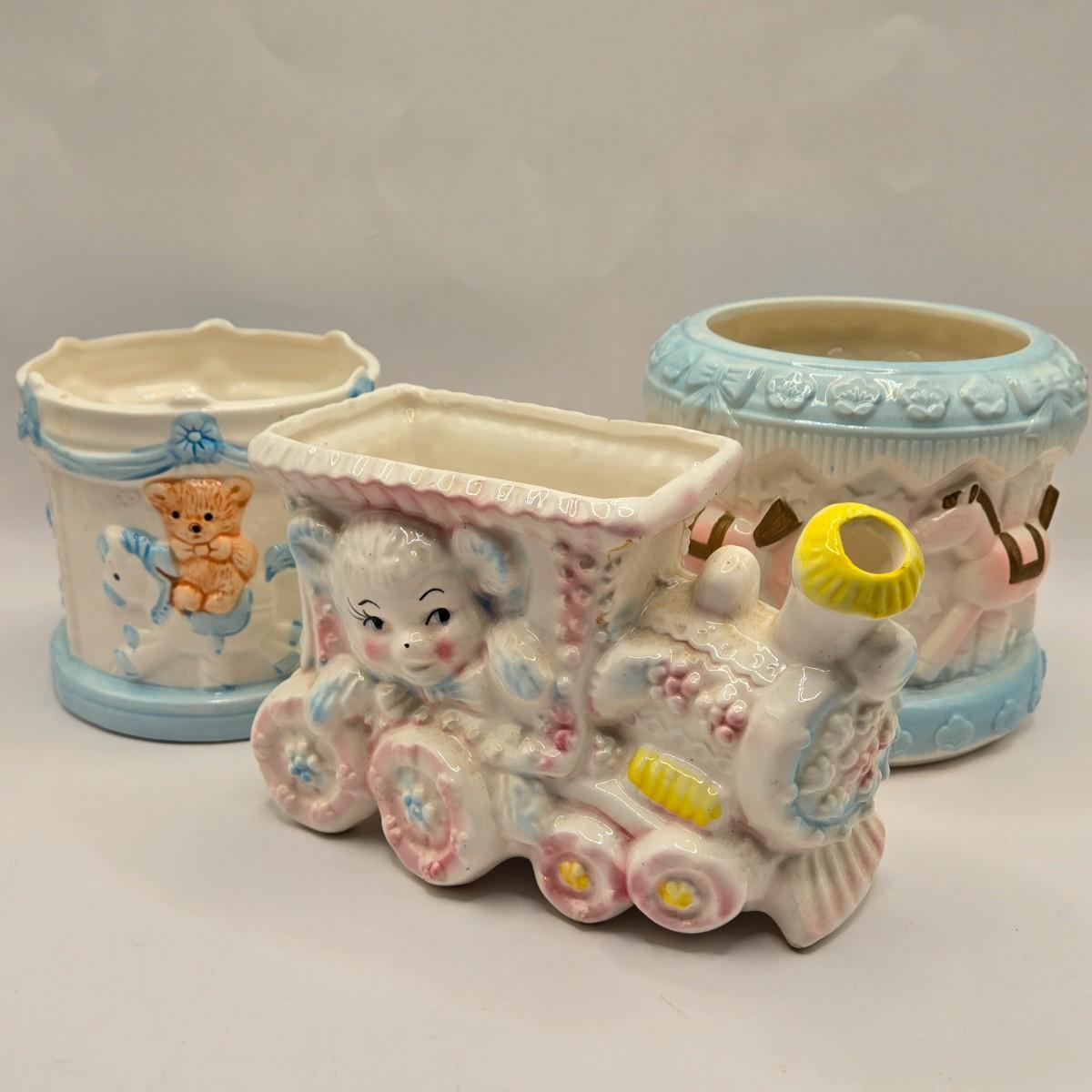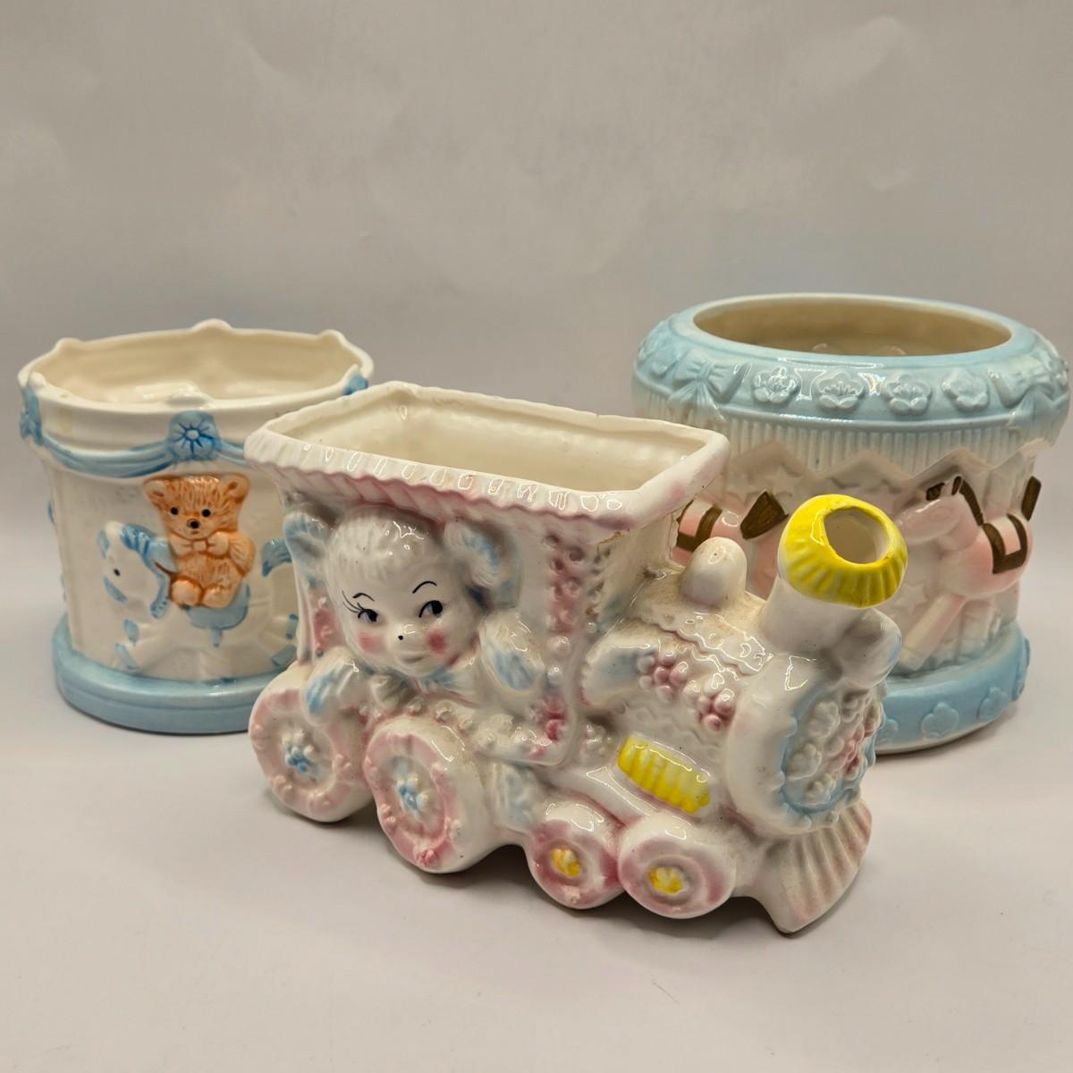 LOT 219D: Vintage 1950s Ceramic Train Nursery Planter, Carousel Nursery Planter, and Bear Nursery Planter