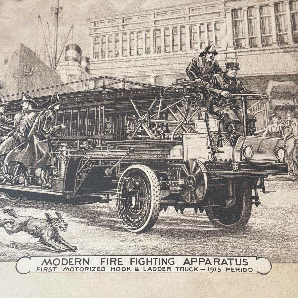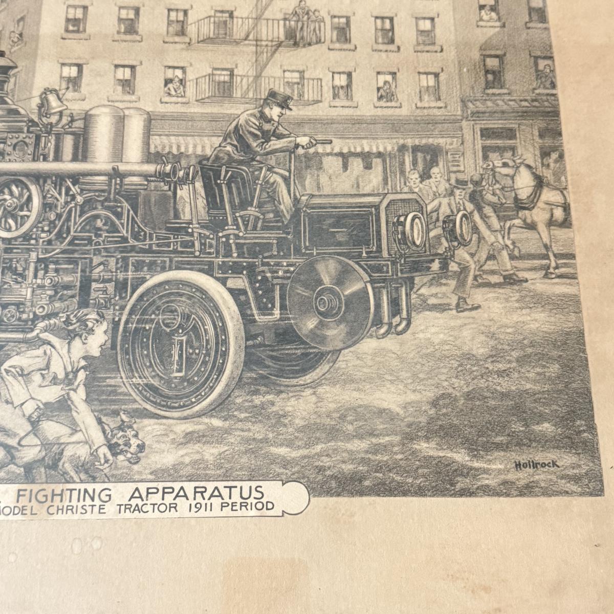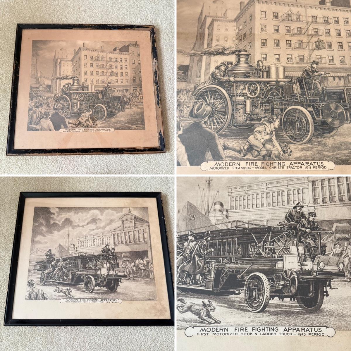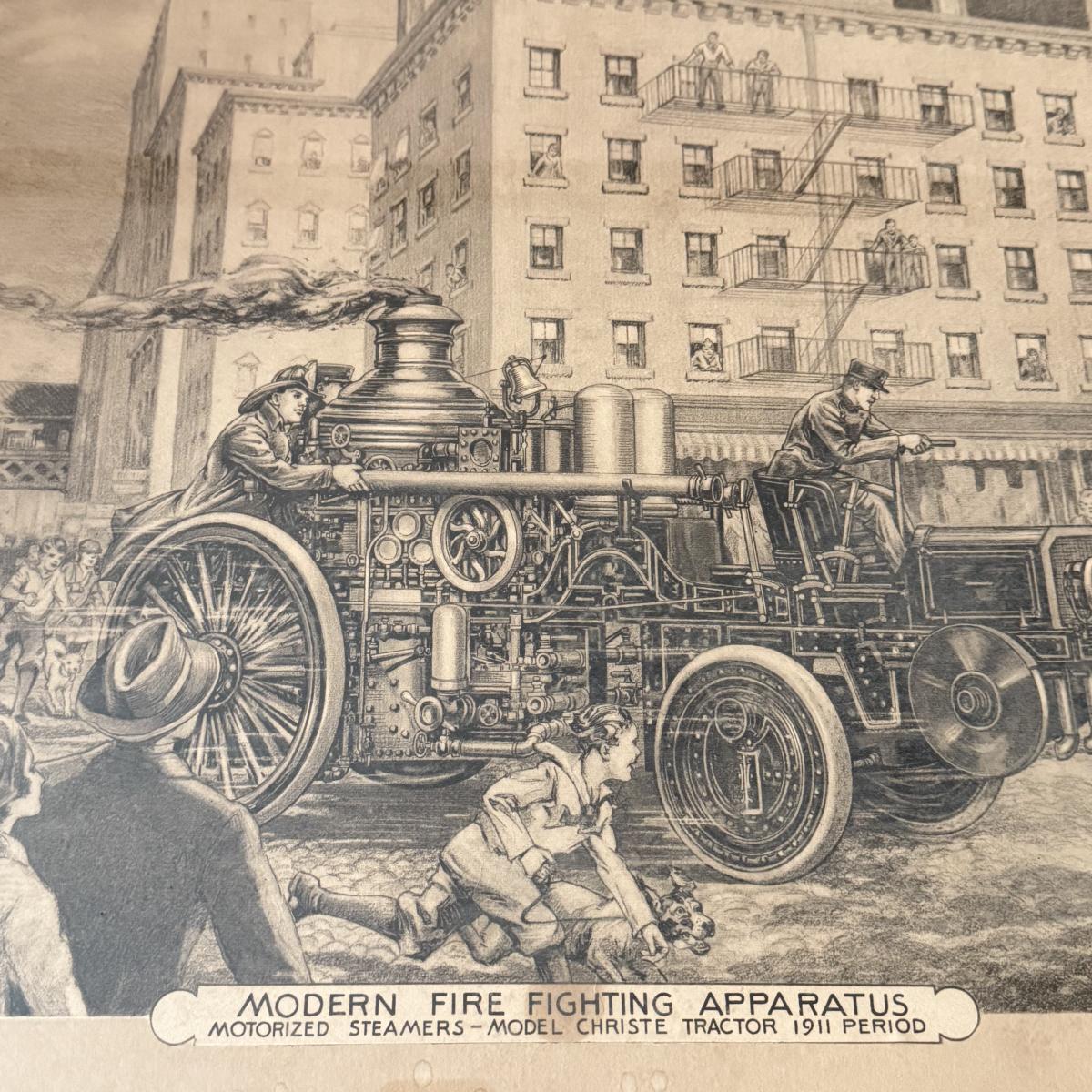 LOT 221L: Antique Modern Firefighting Apparatus Etching Prints circa 1910s-1920s: "Motorized Steeamers - Model Christie Tractor 1911 Period" & "First Motorized Hook & Ladder Truck 1915 Period"