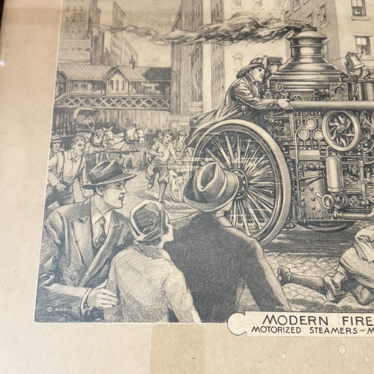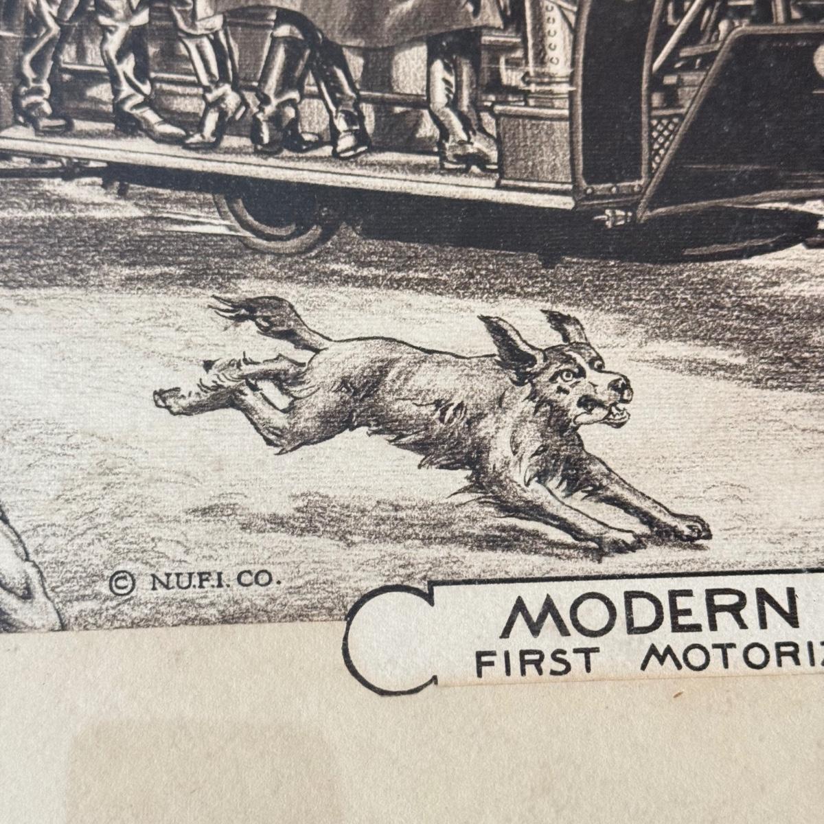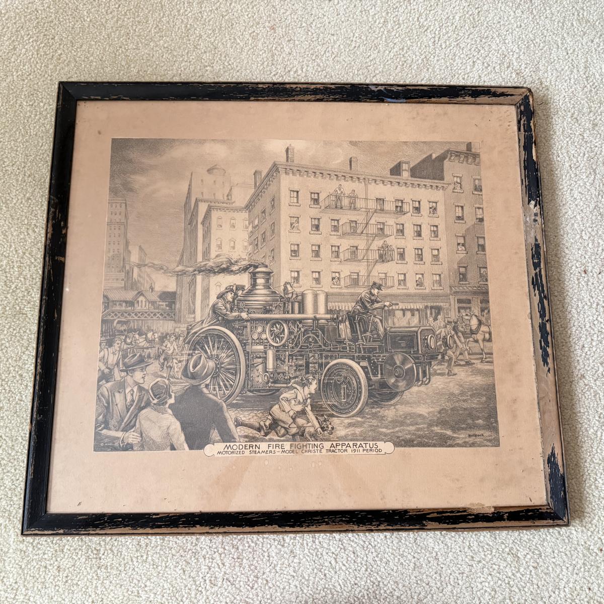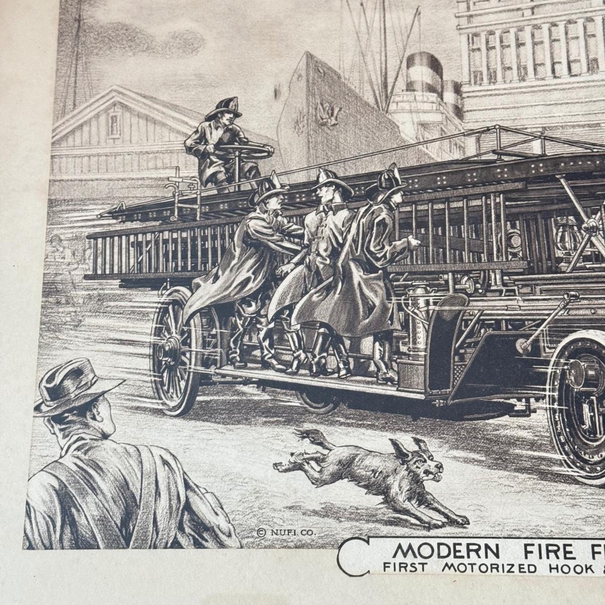 LOT 221L: Antique Modern Firefighting Apparatus Etching Prints circa 1910s-1920s: "Motorized Steeamers - Model Christie Tractor 1911 Period" & "First Motorized Hook & Ladder Truck 1915 Period"