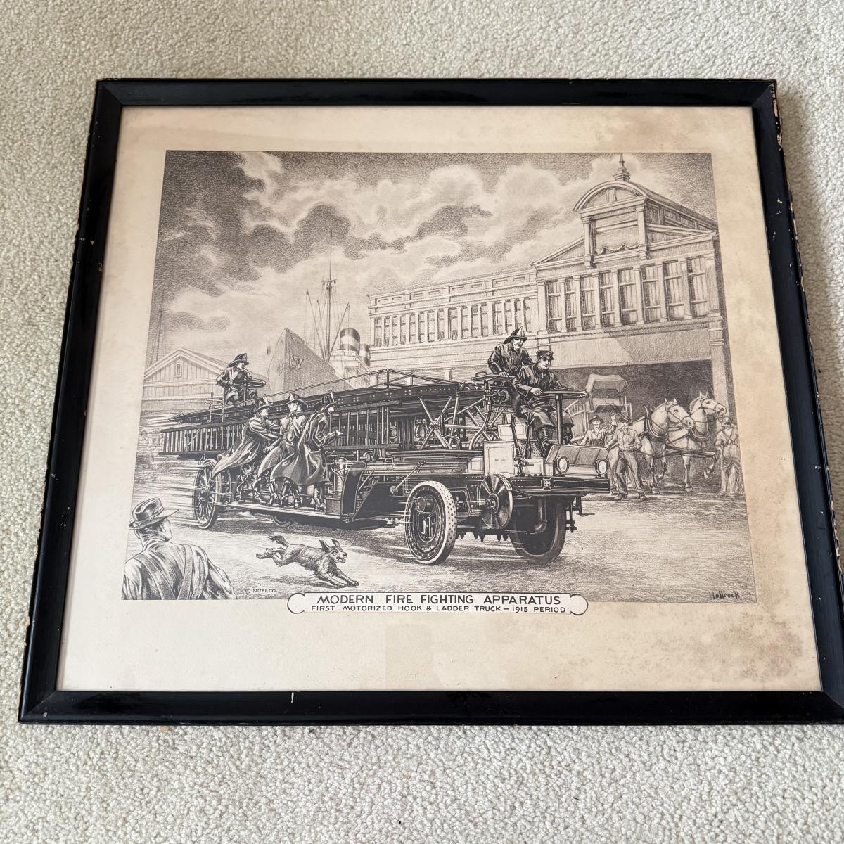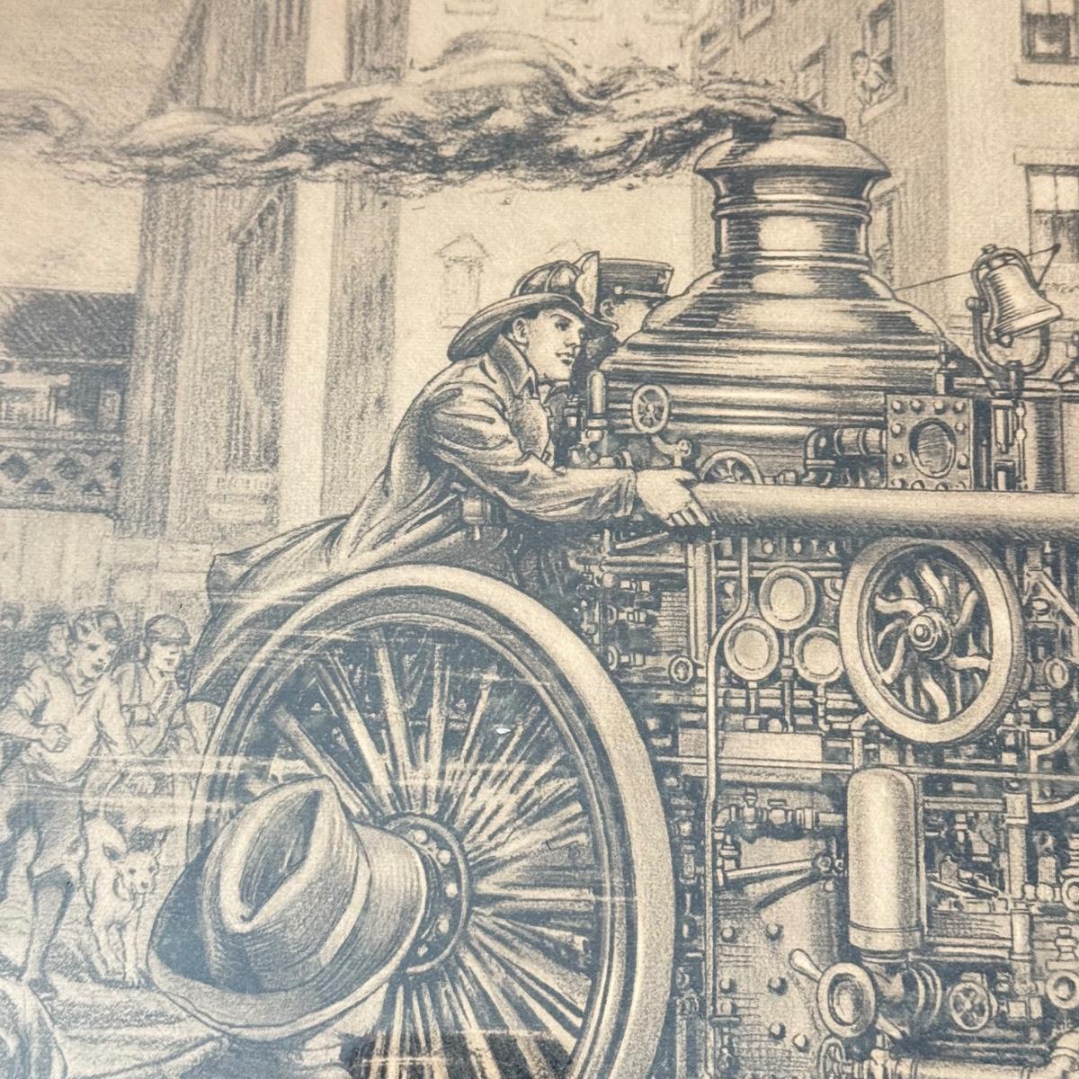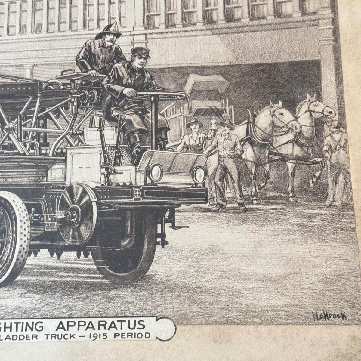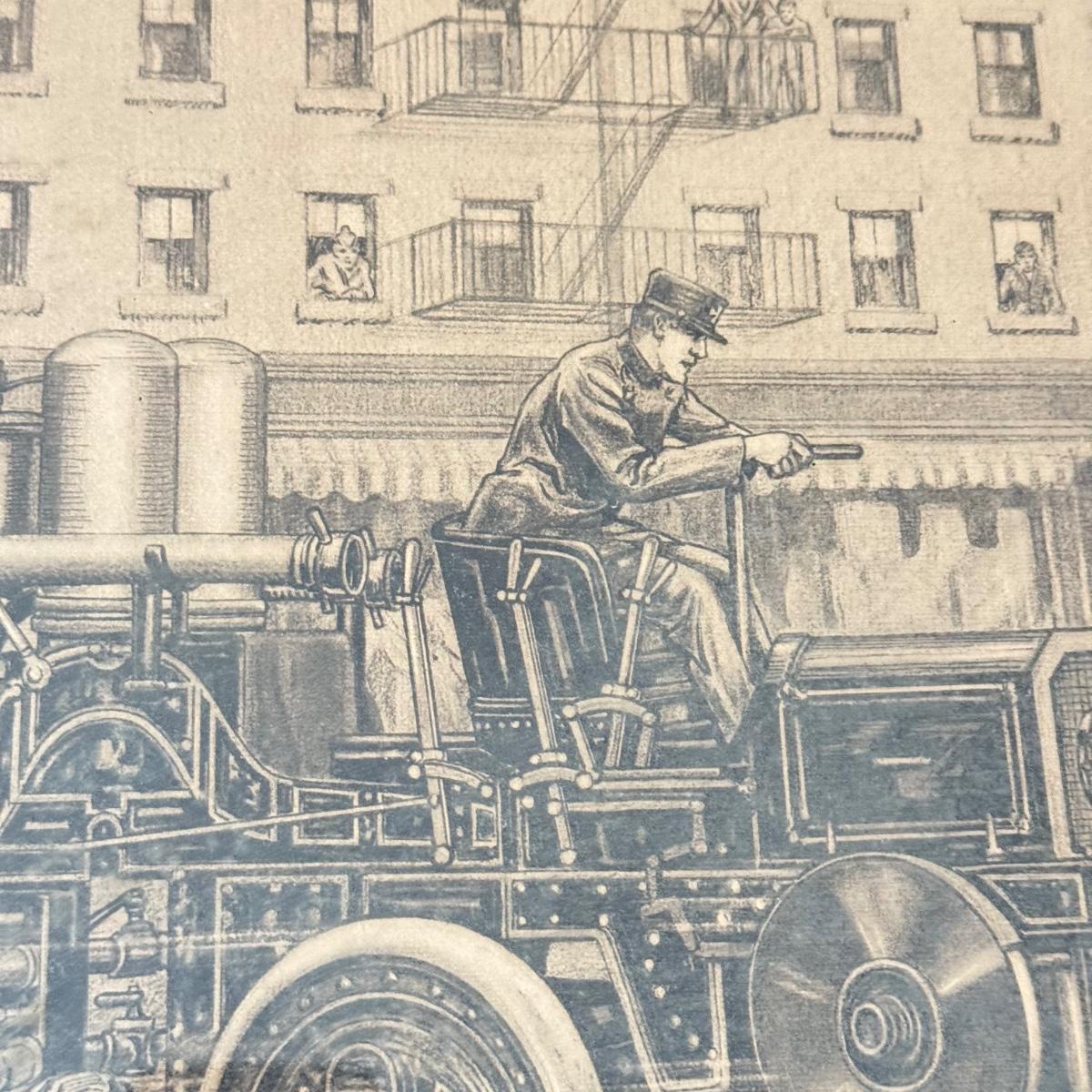 LOT 221L: Antique Modern Firefighting Apparatus Etching Prints circa 1910s-1920s: "Motorized Steeamers - Model Christie Tractor 1911 Period" & "First Motorized Hook & Ladder Truck 1915 Period"