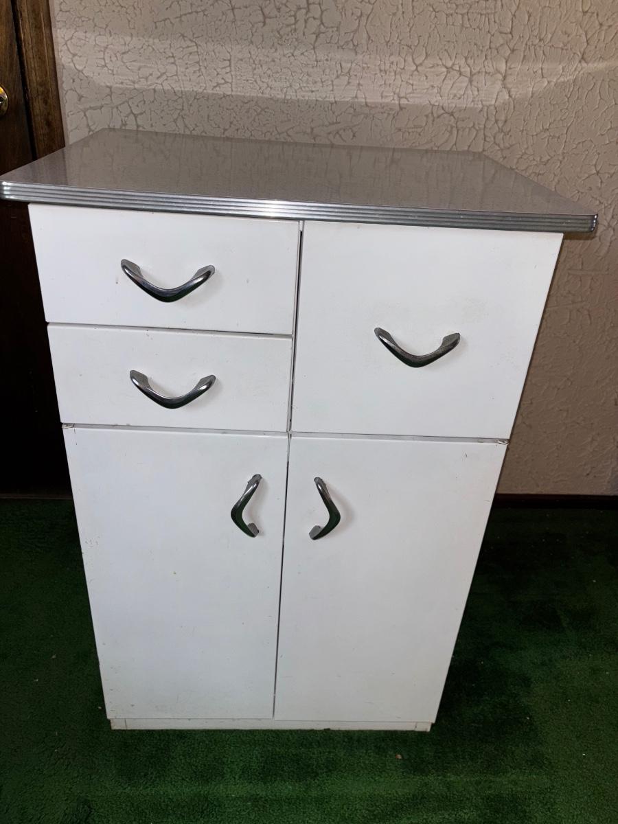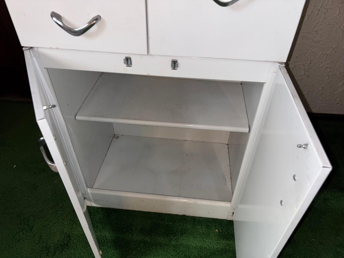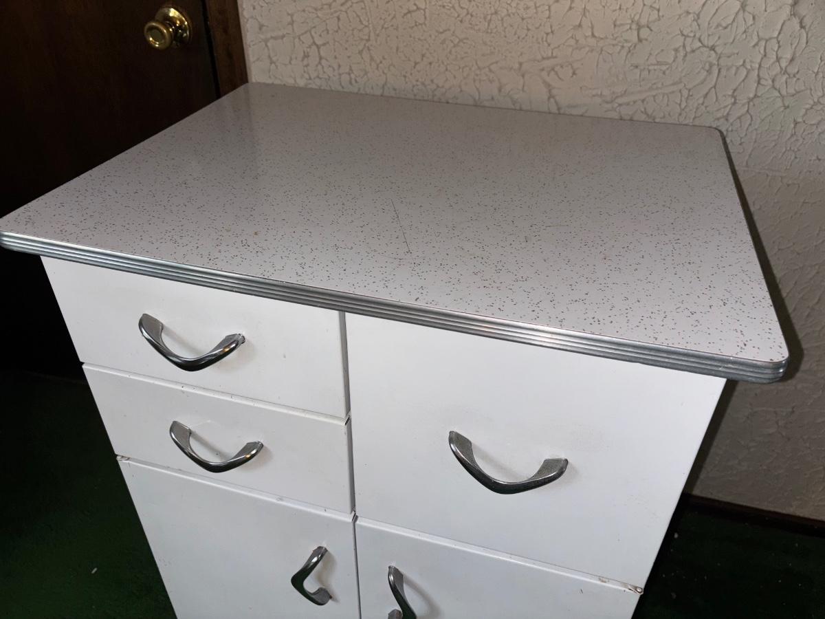 LOT 925Den: Vintage metal white speckled top utility cabinet