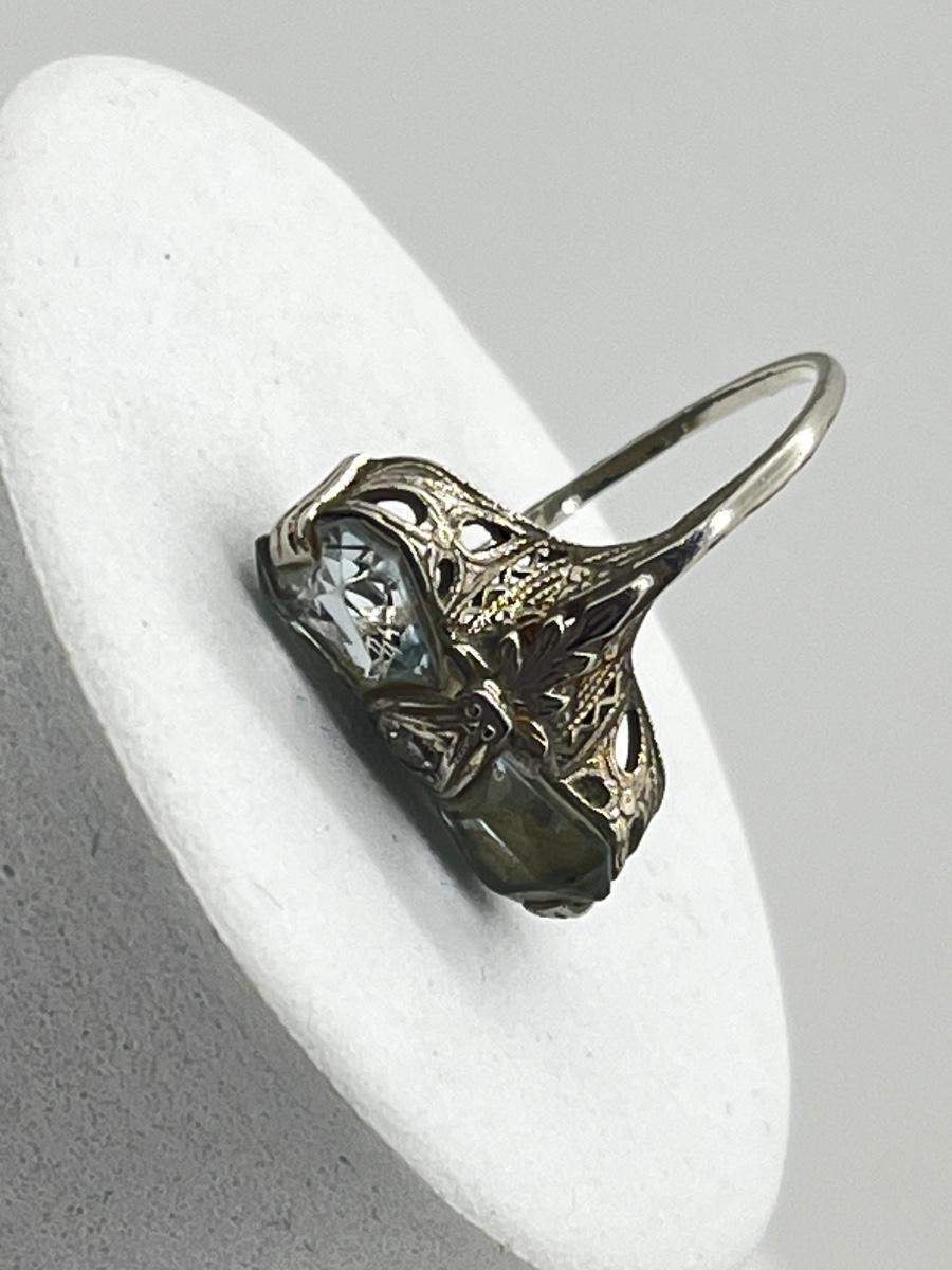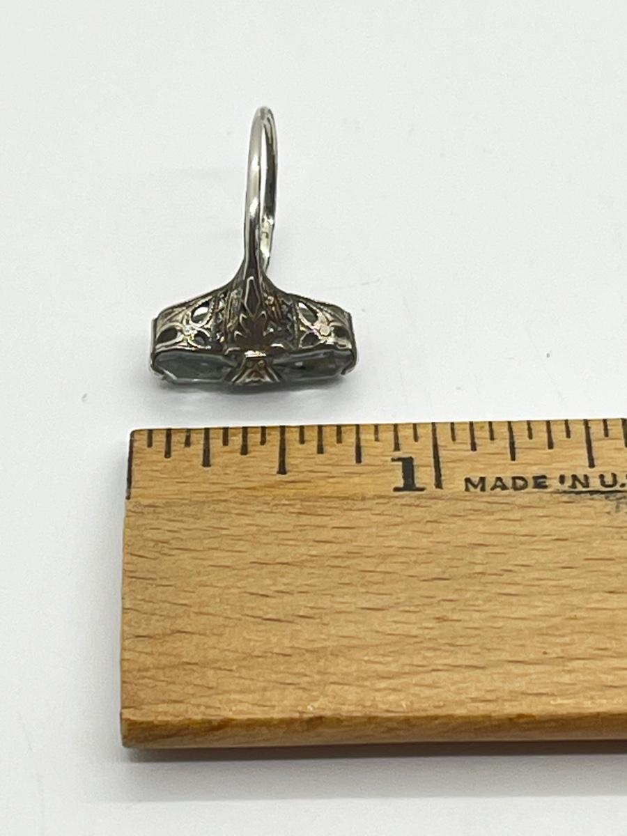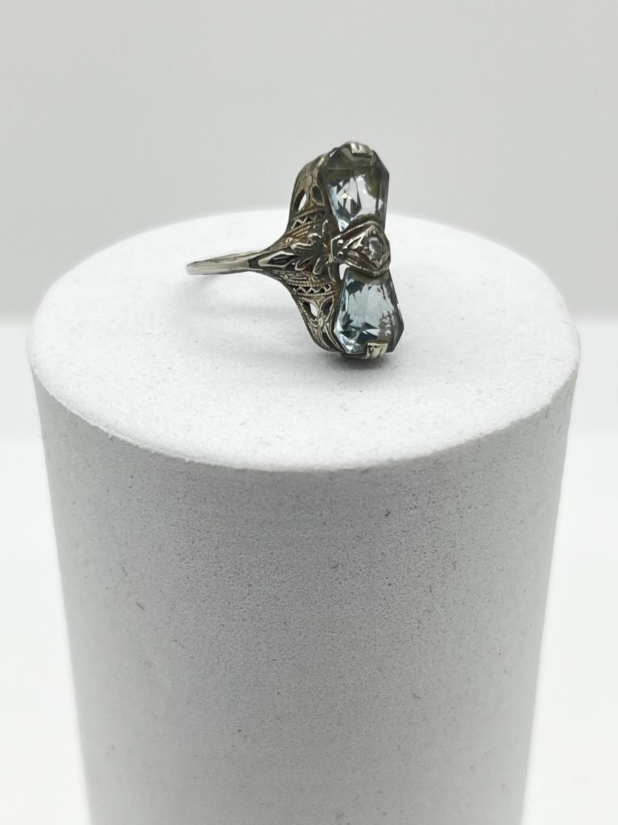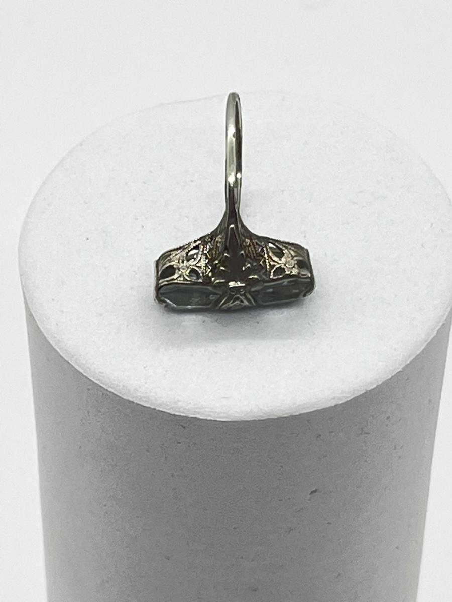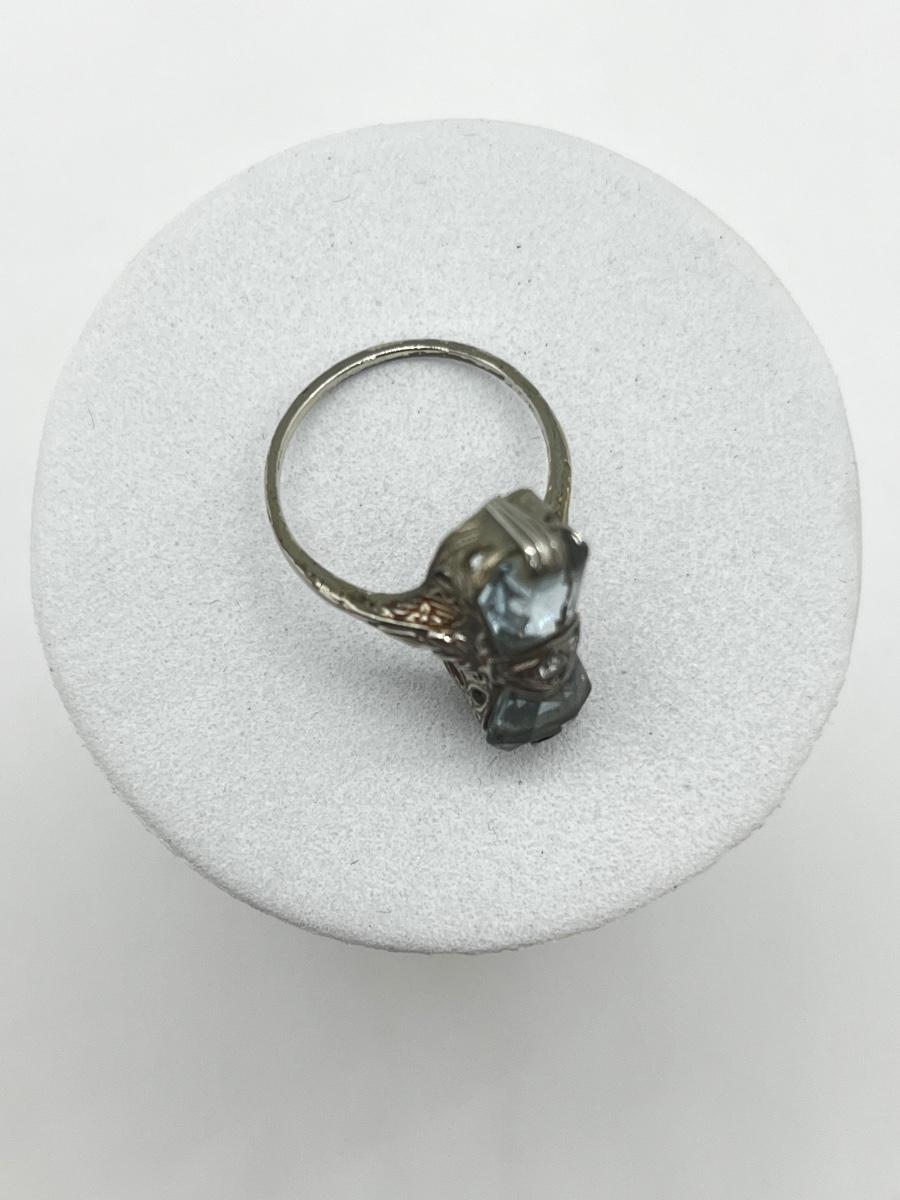 LOT 3: 14K White Gold, Aquamarine and Diamond Art Deco Filigree Ring - Size 5