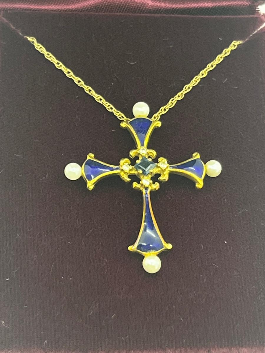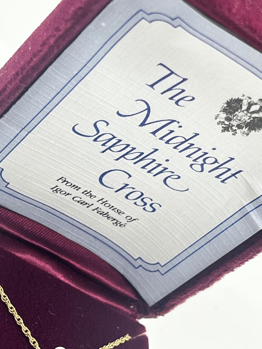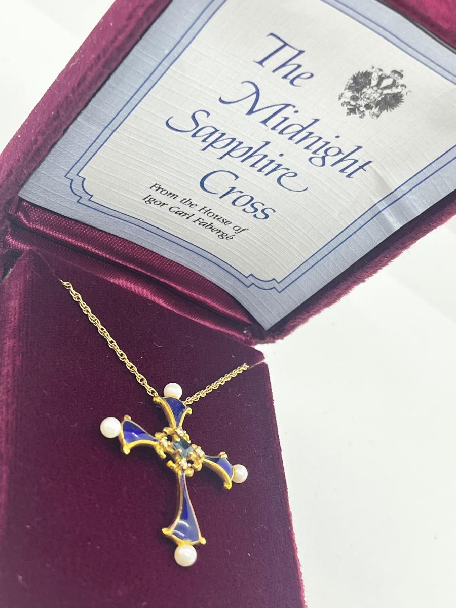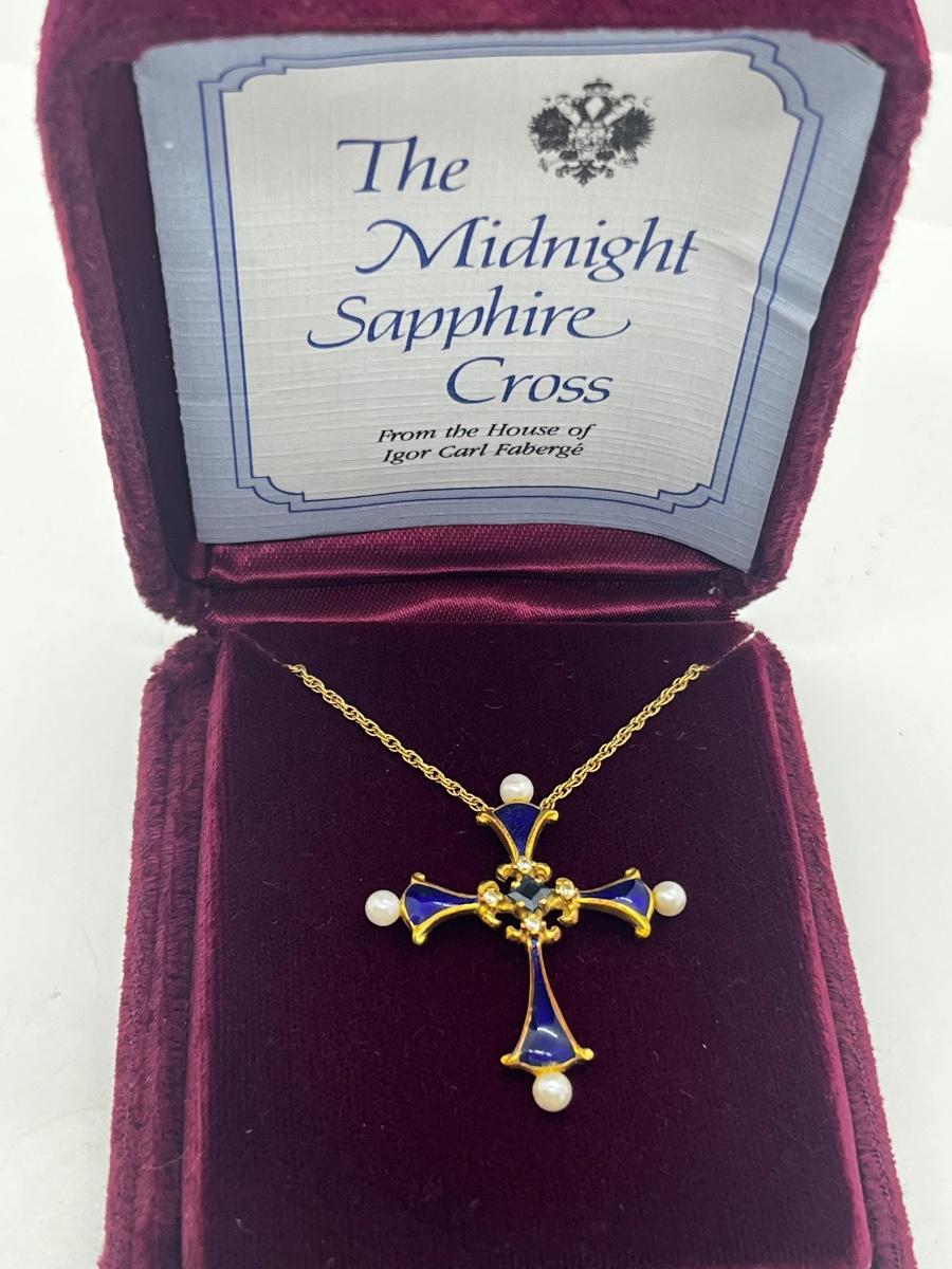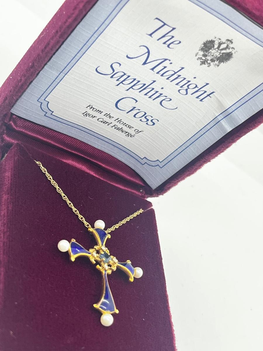 LOT 11: "The Midnight Sapphire" - 14K Yellow Gold, Diamond, Sapphire and Pearl Enameled Cross from the House of Igor Carol Faberge