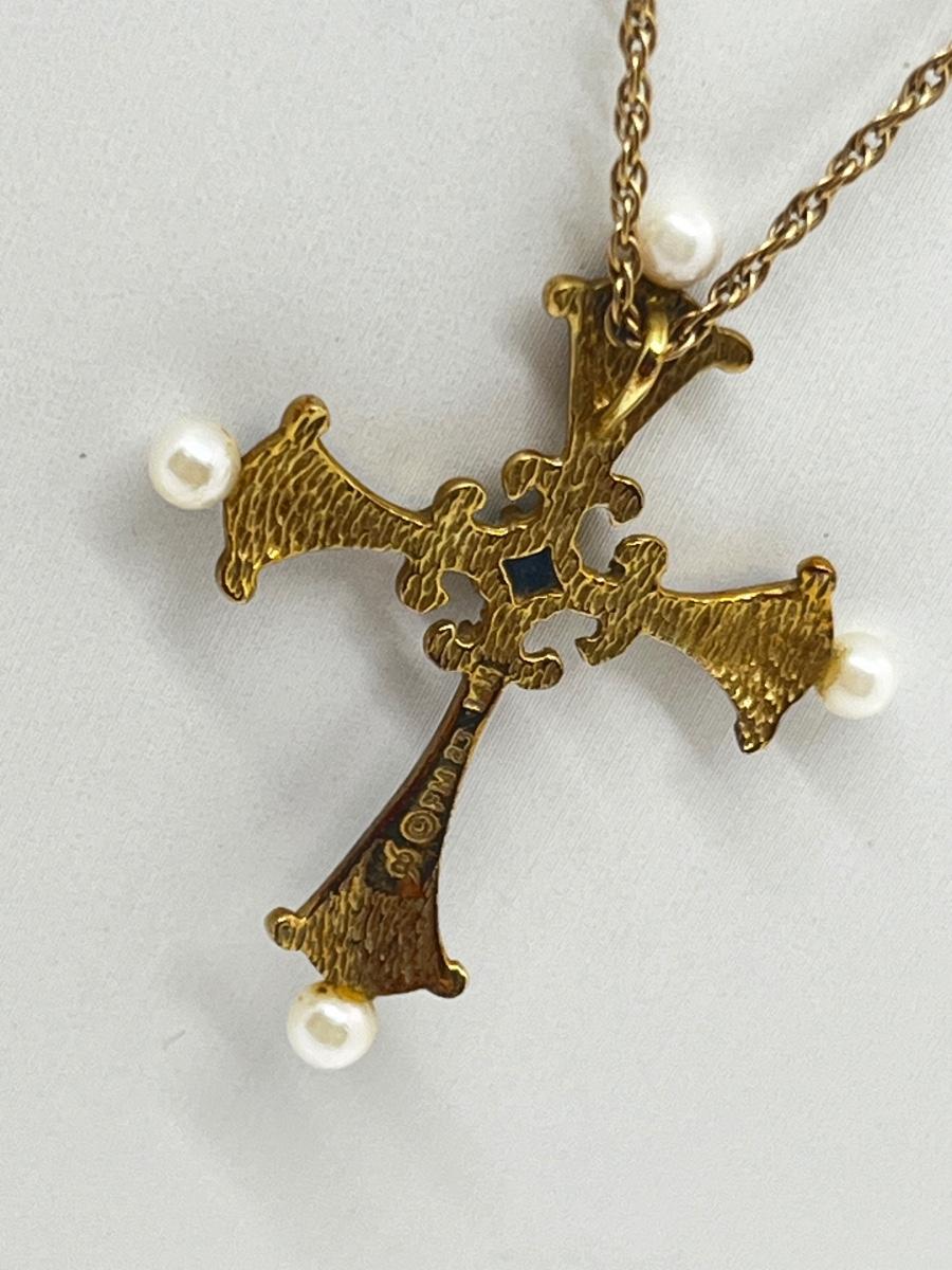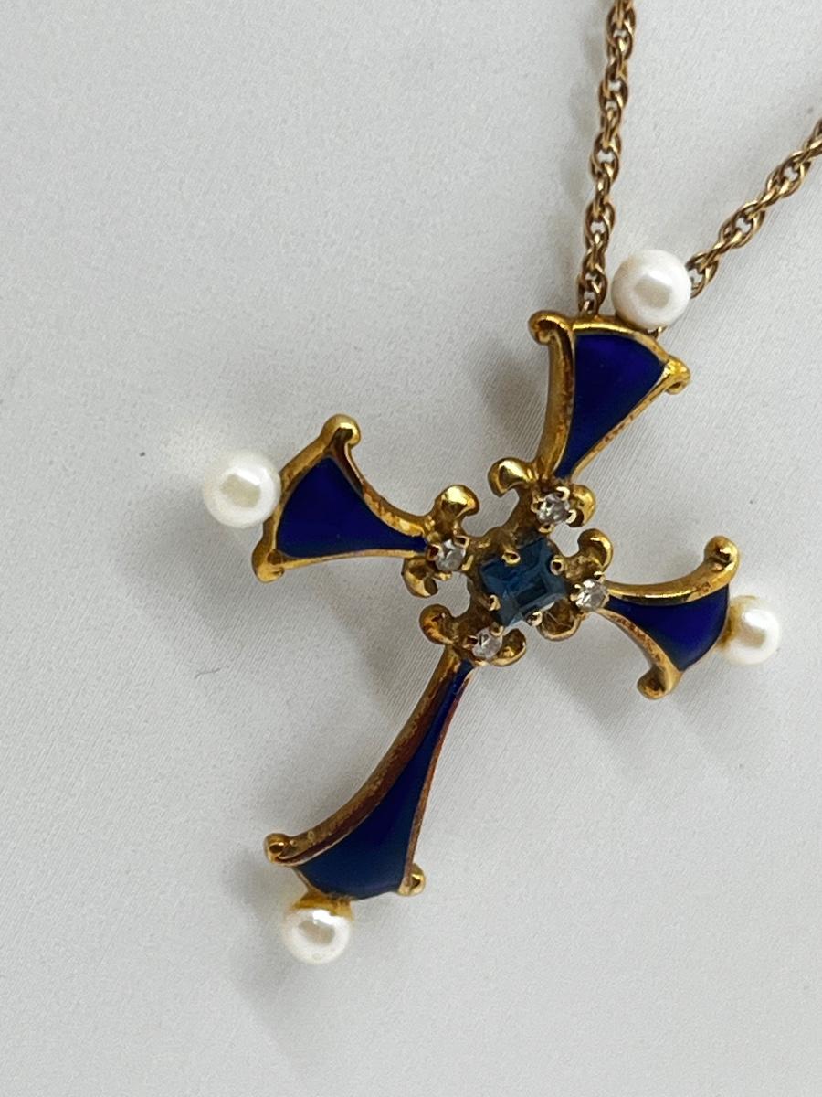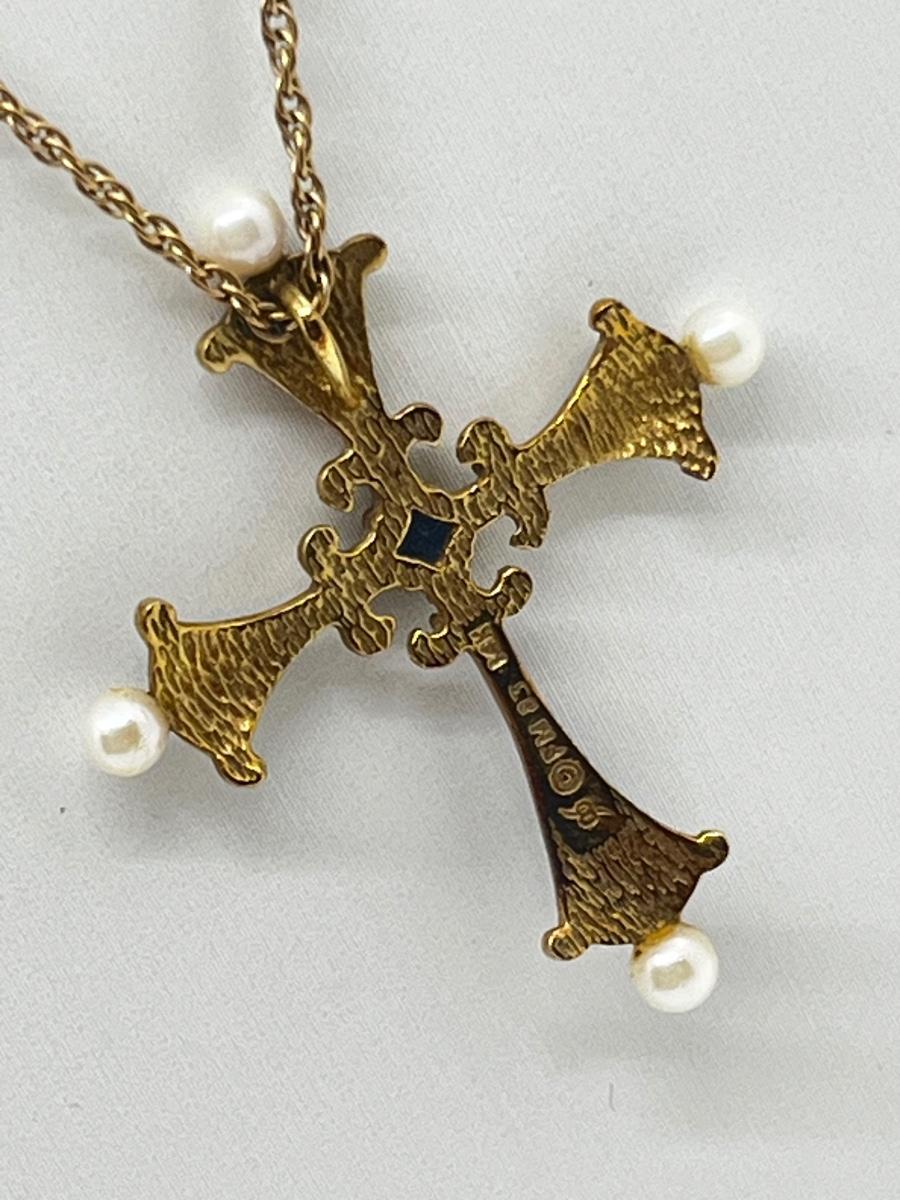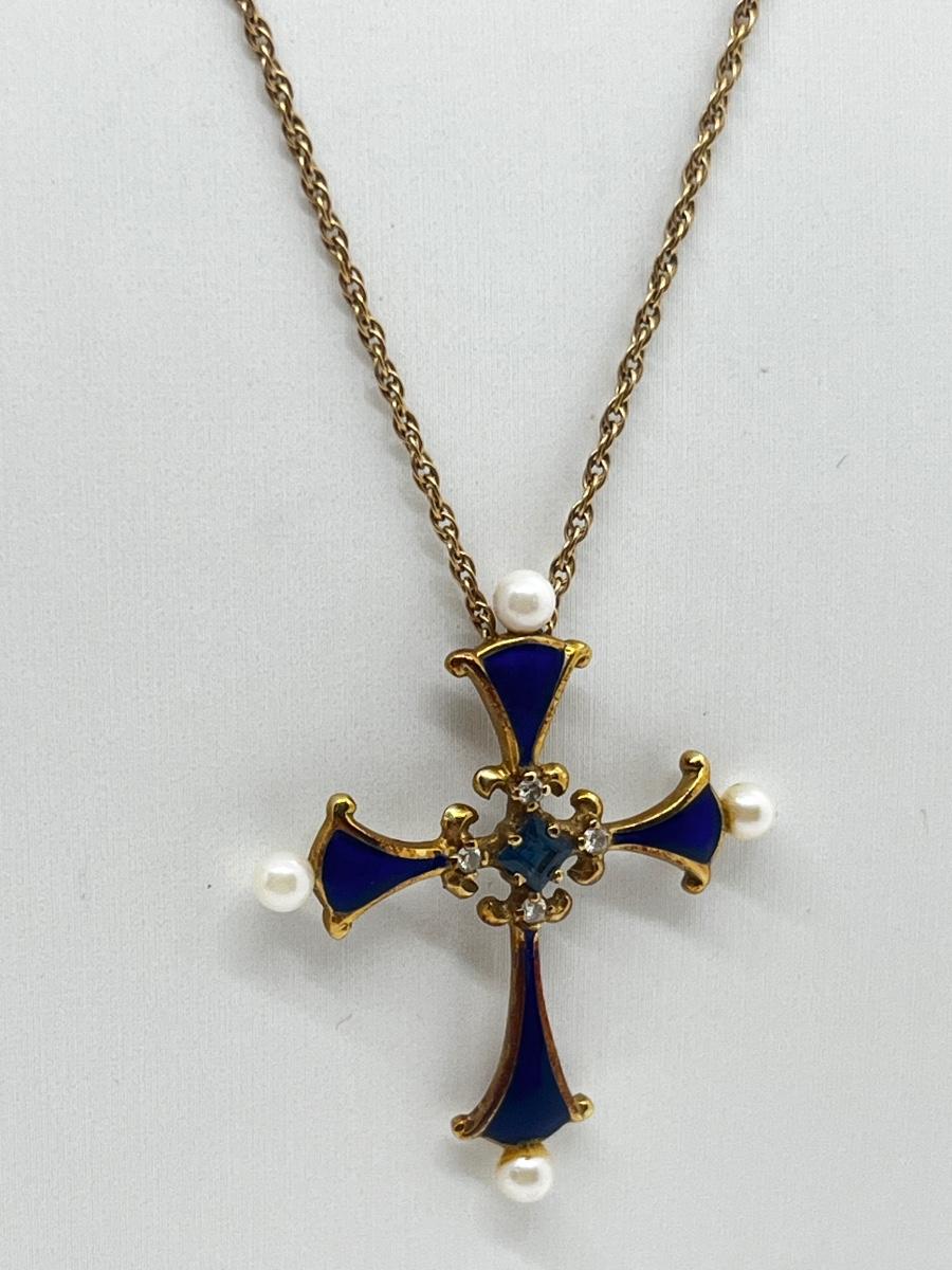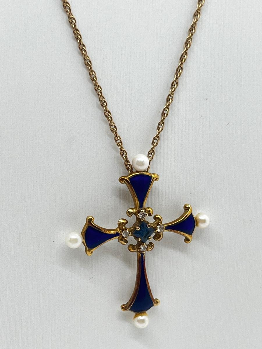 LOT 11: "The Midnight Sapphire" - 14K Yellow Gold, Diamond, Sapphire and Pearl Enameled Cross from the House of Igor Carol Faberge