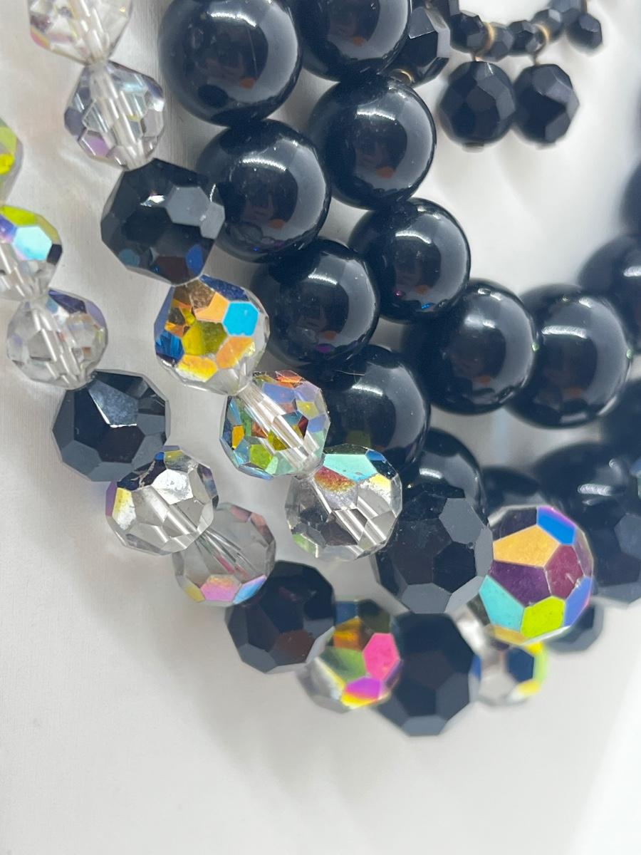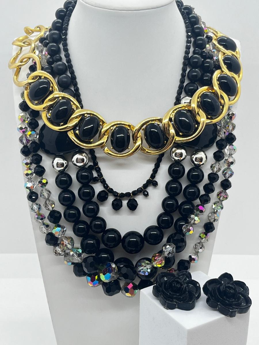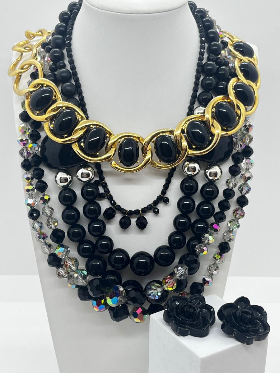 LOT 17: Goldtone and Black Beaded Necklace Collection With Floral Clip on Earrings, Aurora Borealis Beads and More!