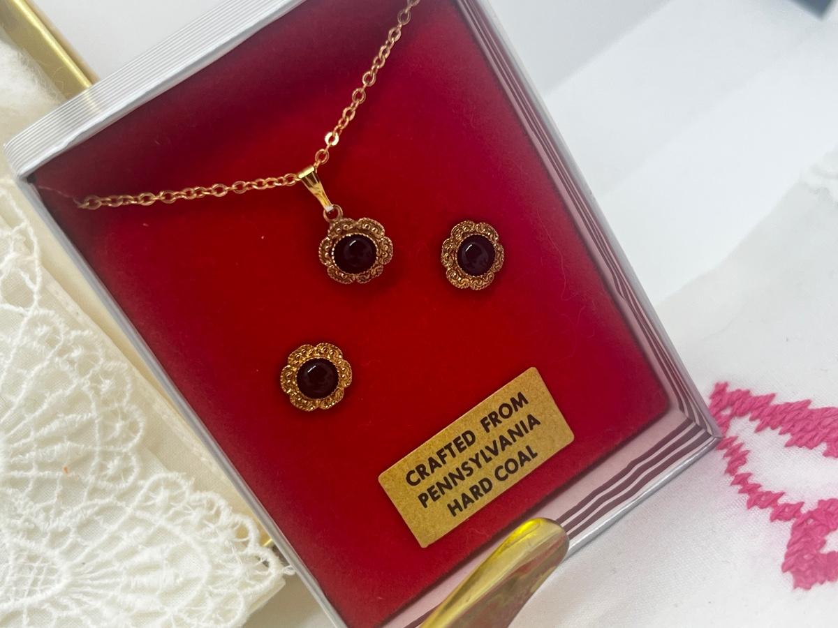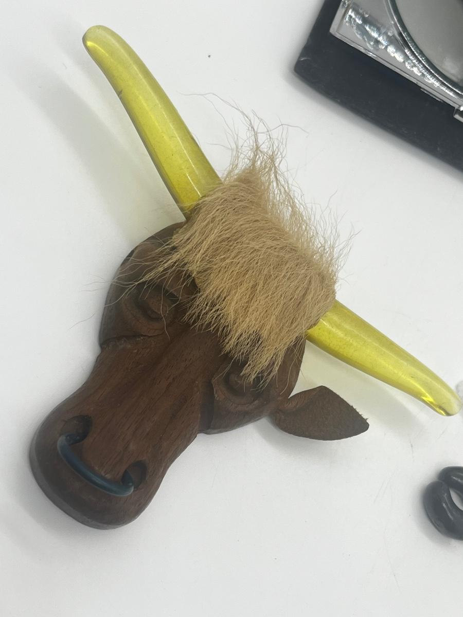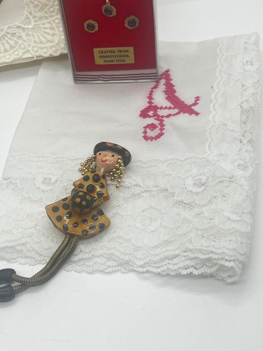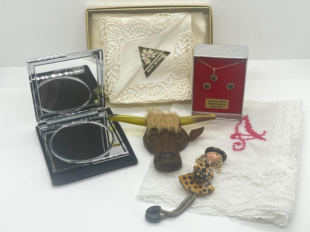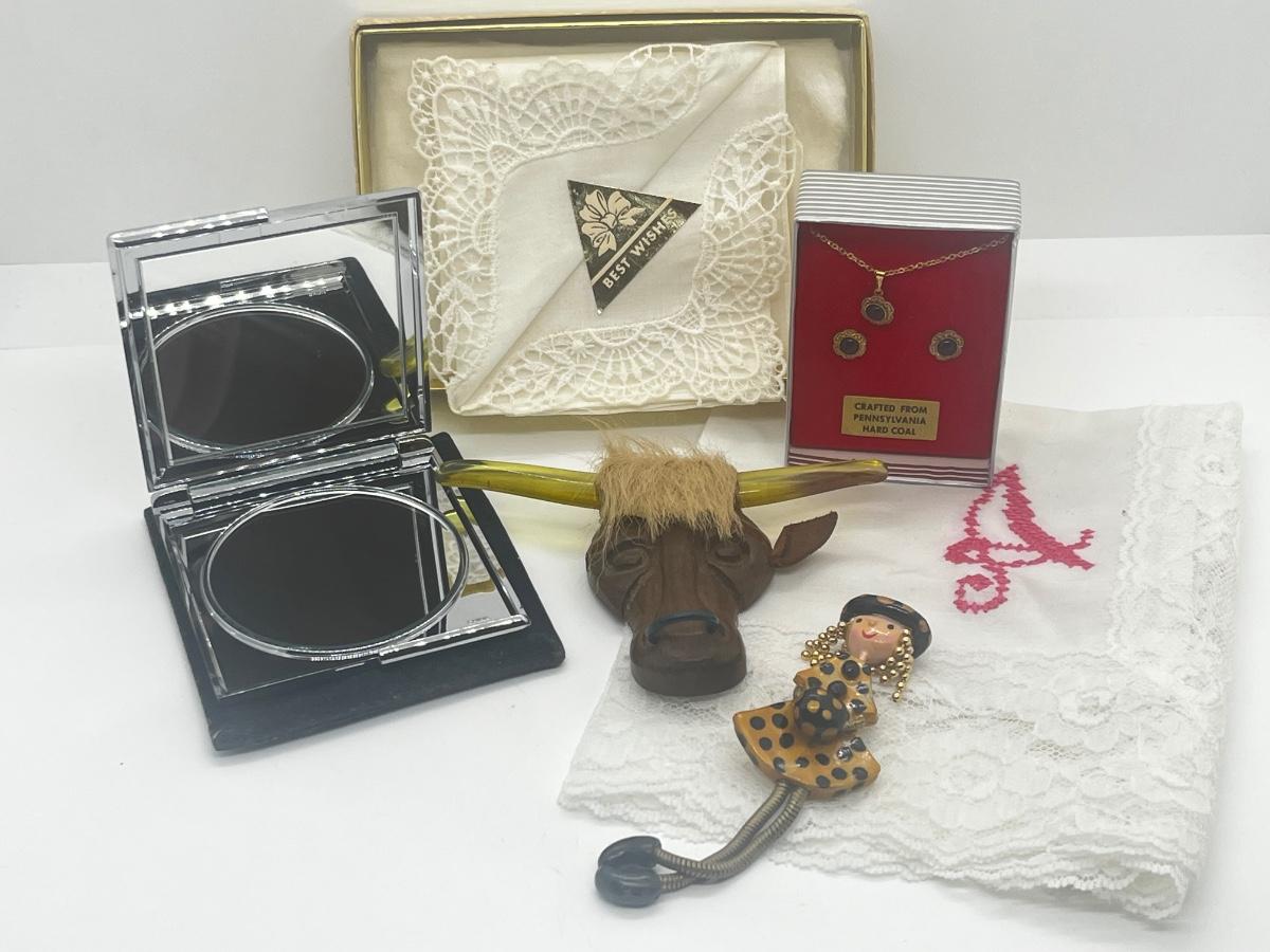 LOT 45: Eclectic Collection - Hankies, PA Hard Coal Necklace and Earring Set, Funky Bull with Lucite Horns and More!
