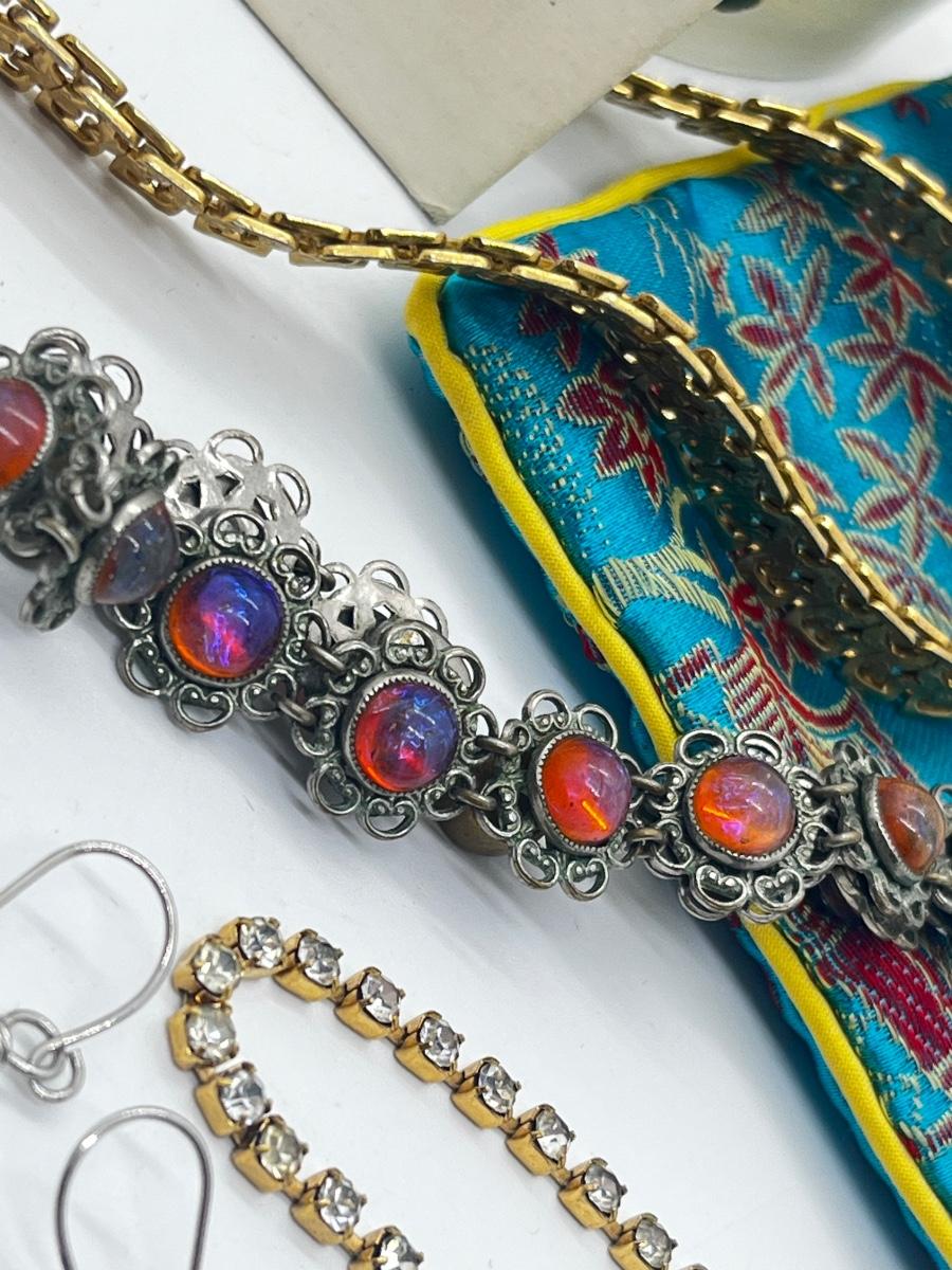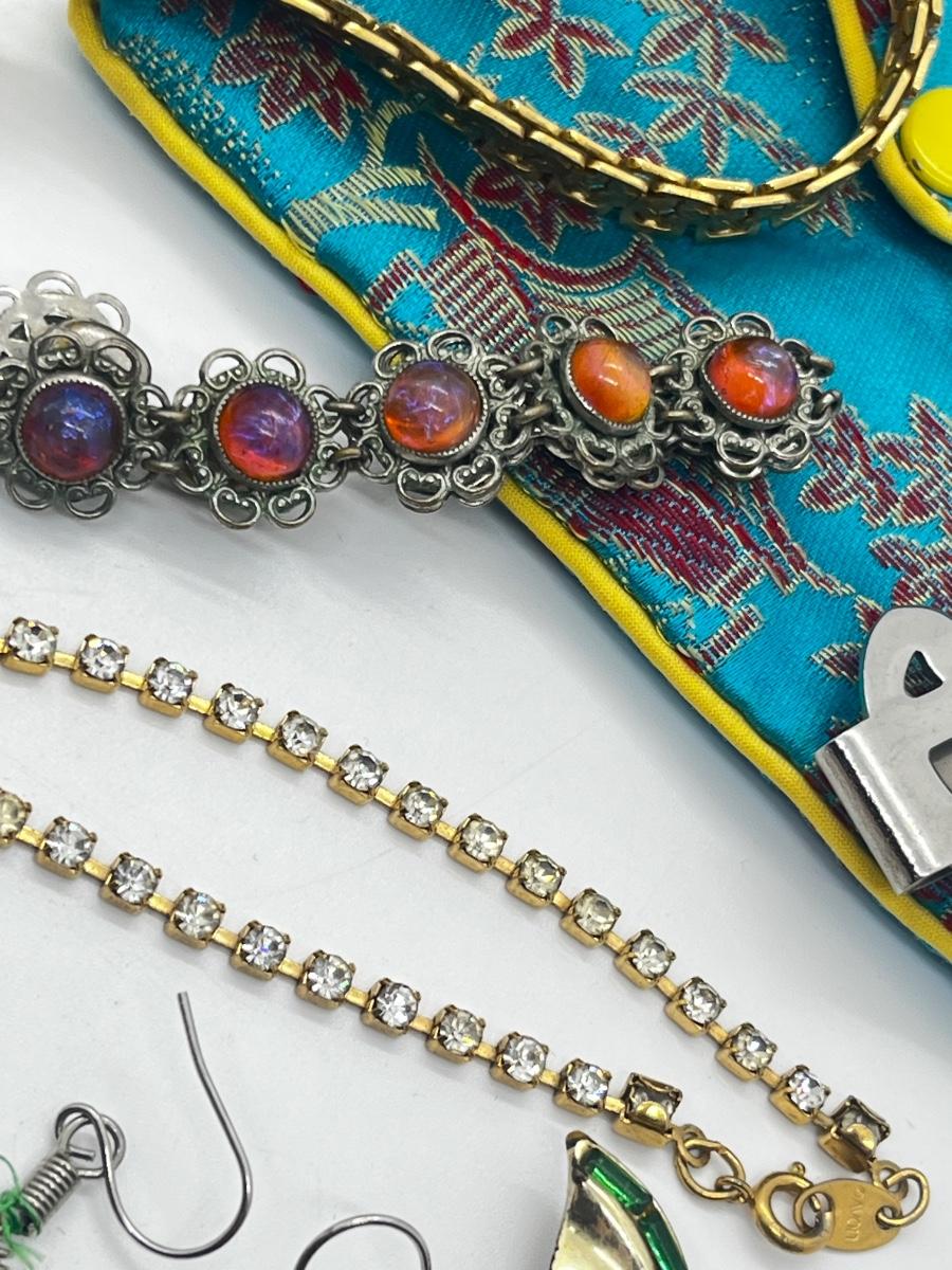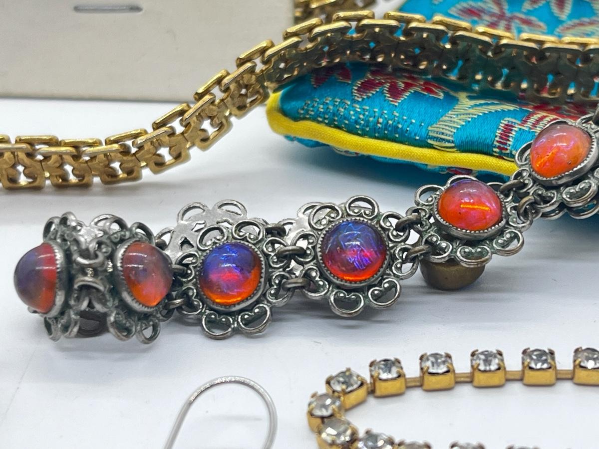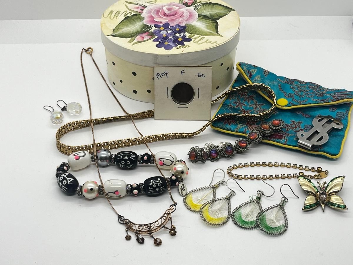 LOT 59: Assorted Treasures: Czech Art Glass "Dragon's Breath" Bracelet, Handpainted Wooden Box, 1904 Penny and Much More!