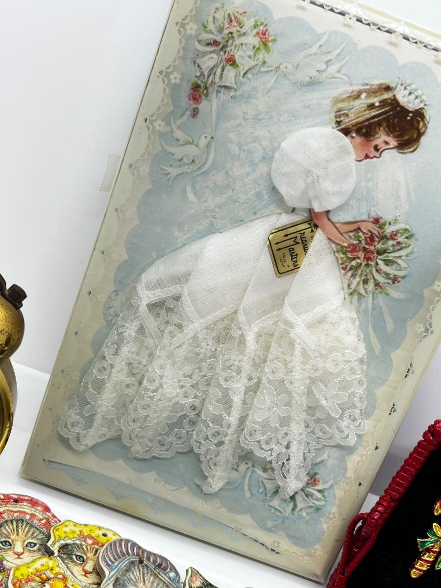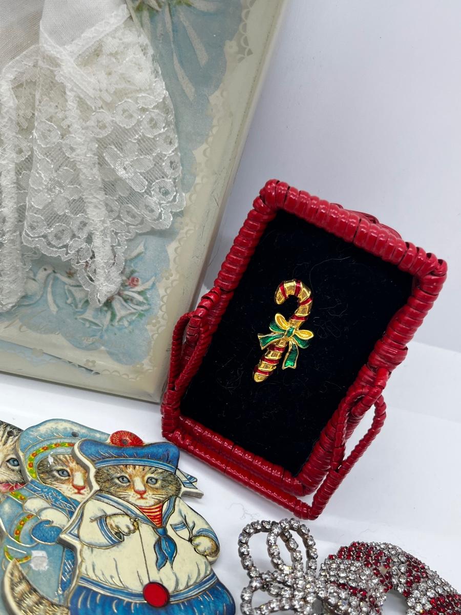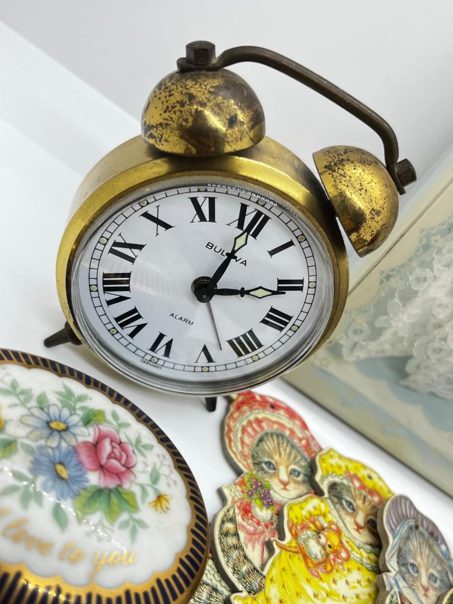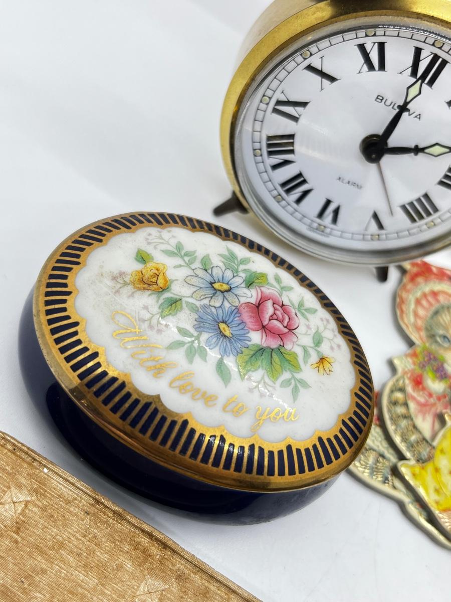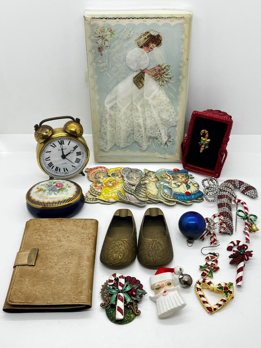 LOT 82: Eclectic Mix of Unique Items and Pretty Floral Box: Mini Vintage Alarm Clock, Holiday Pins and More!