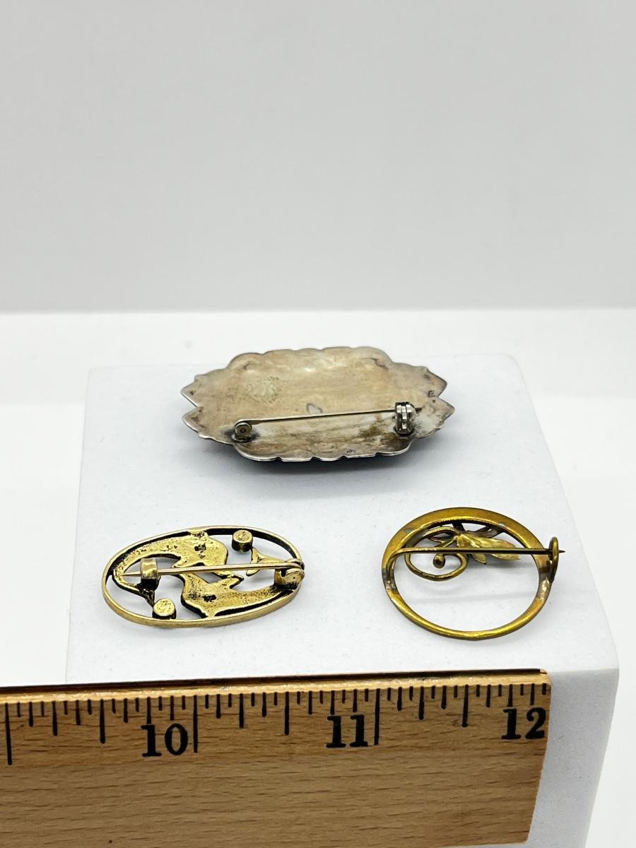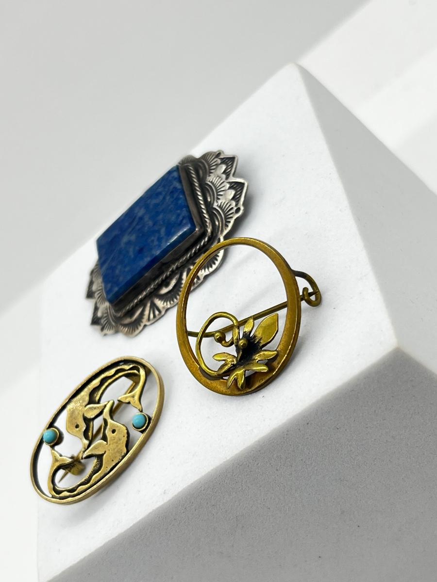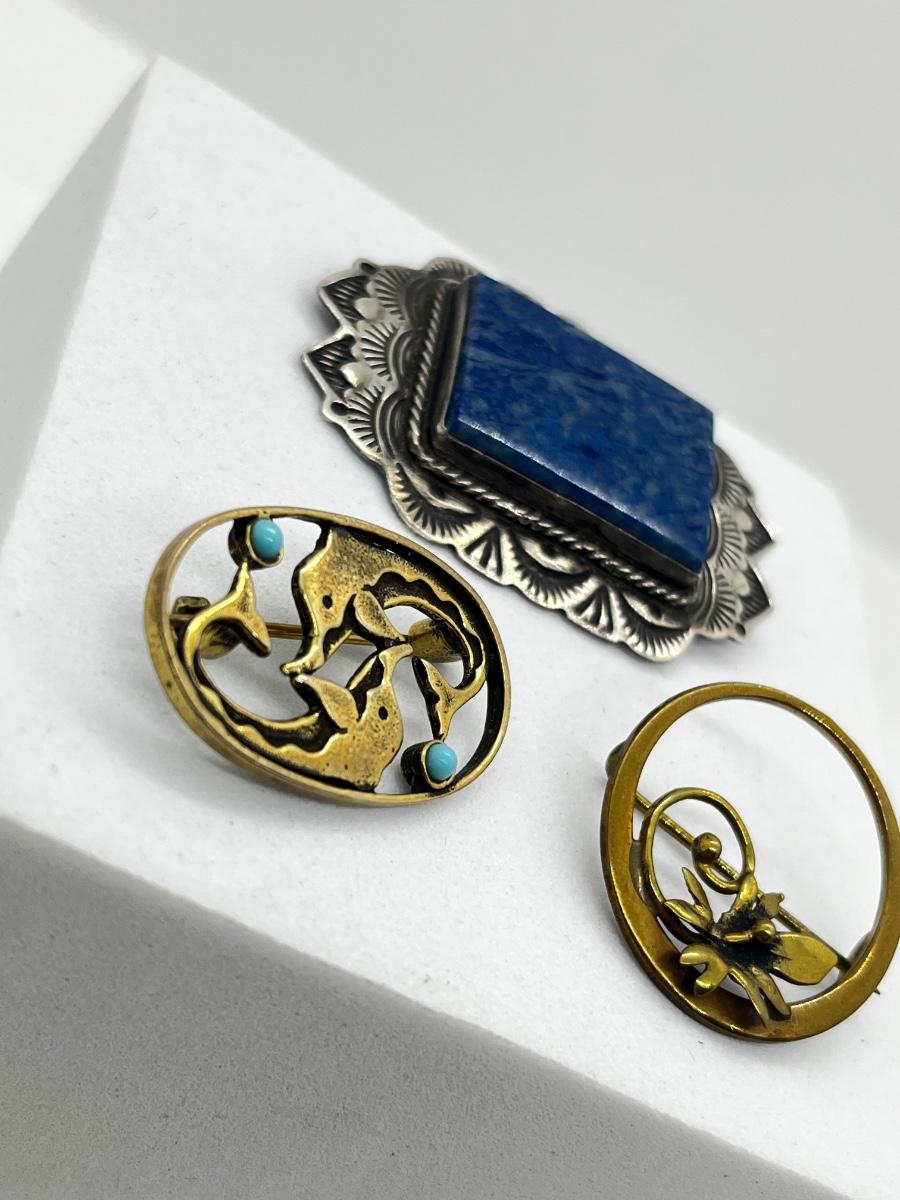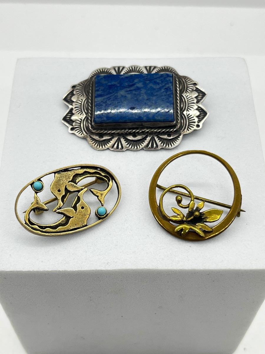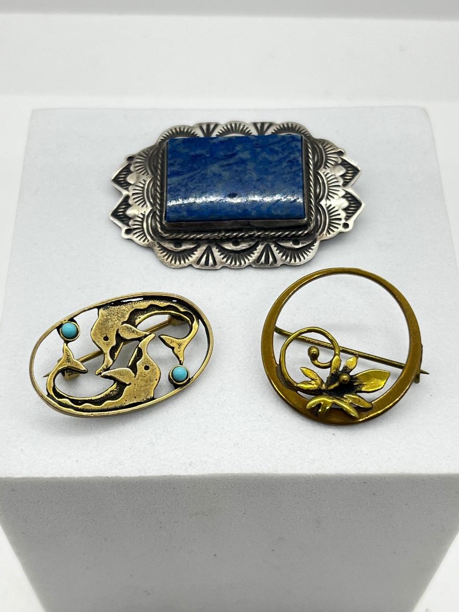 LOT 118: Vintage Silverplate and Blue Brooch Plus Two Antique Brass Pins