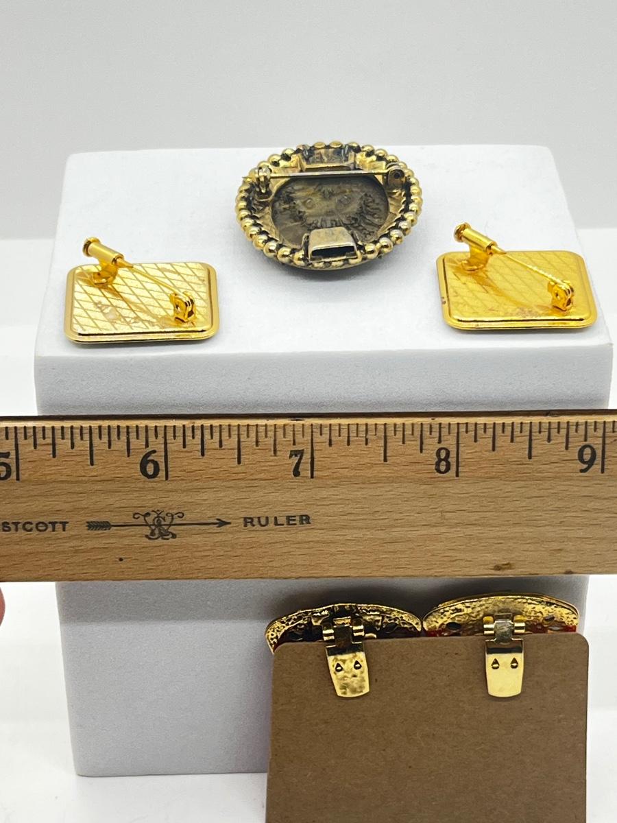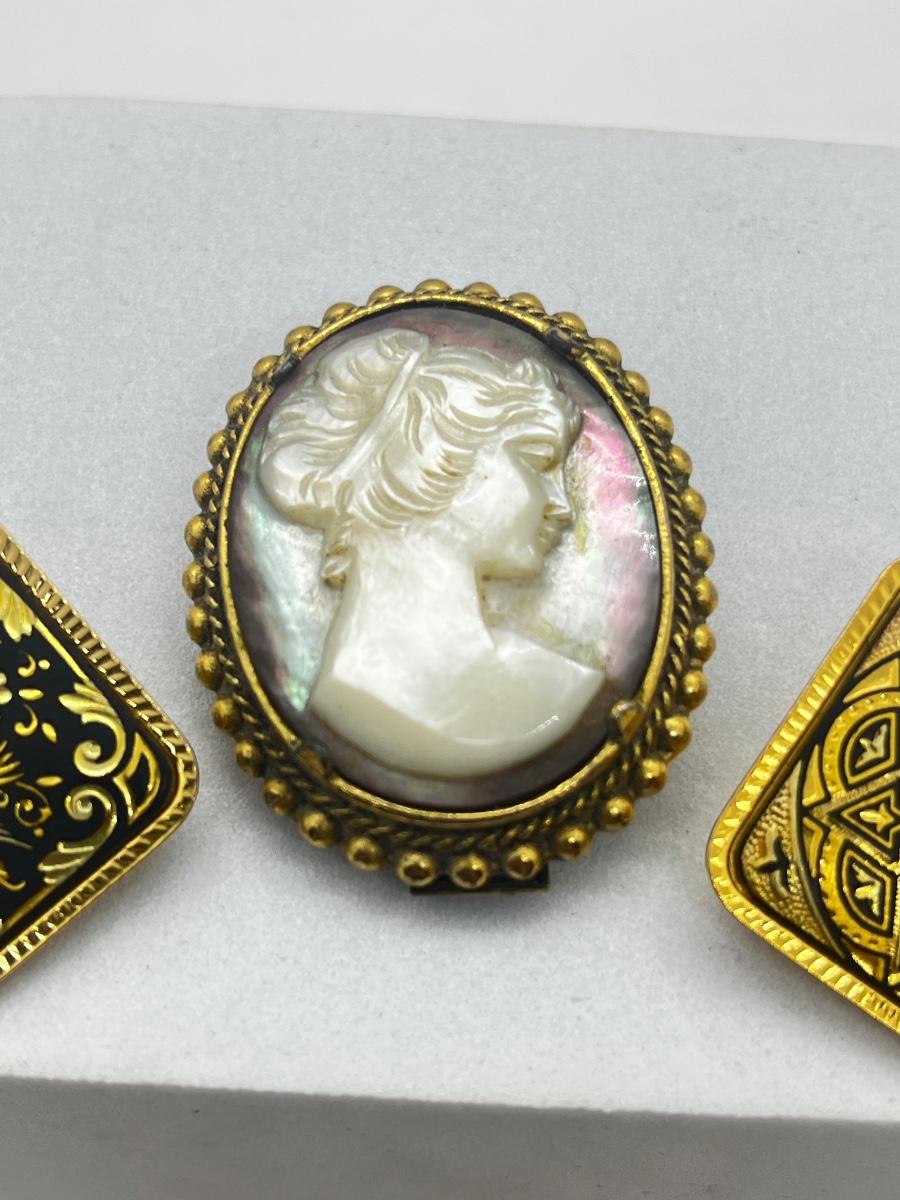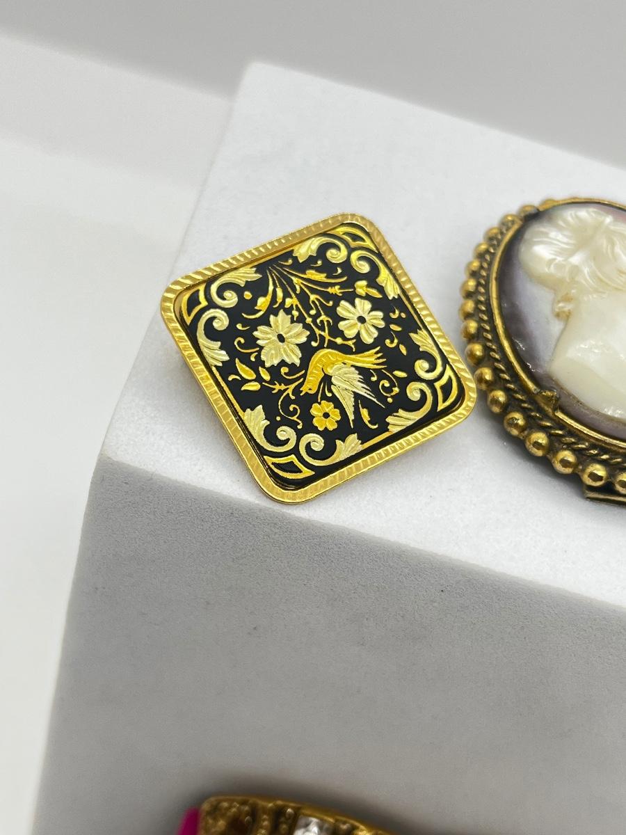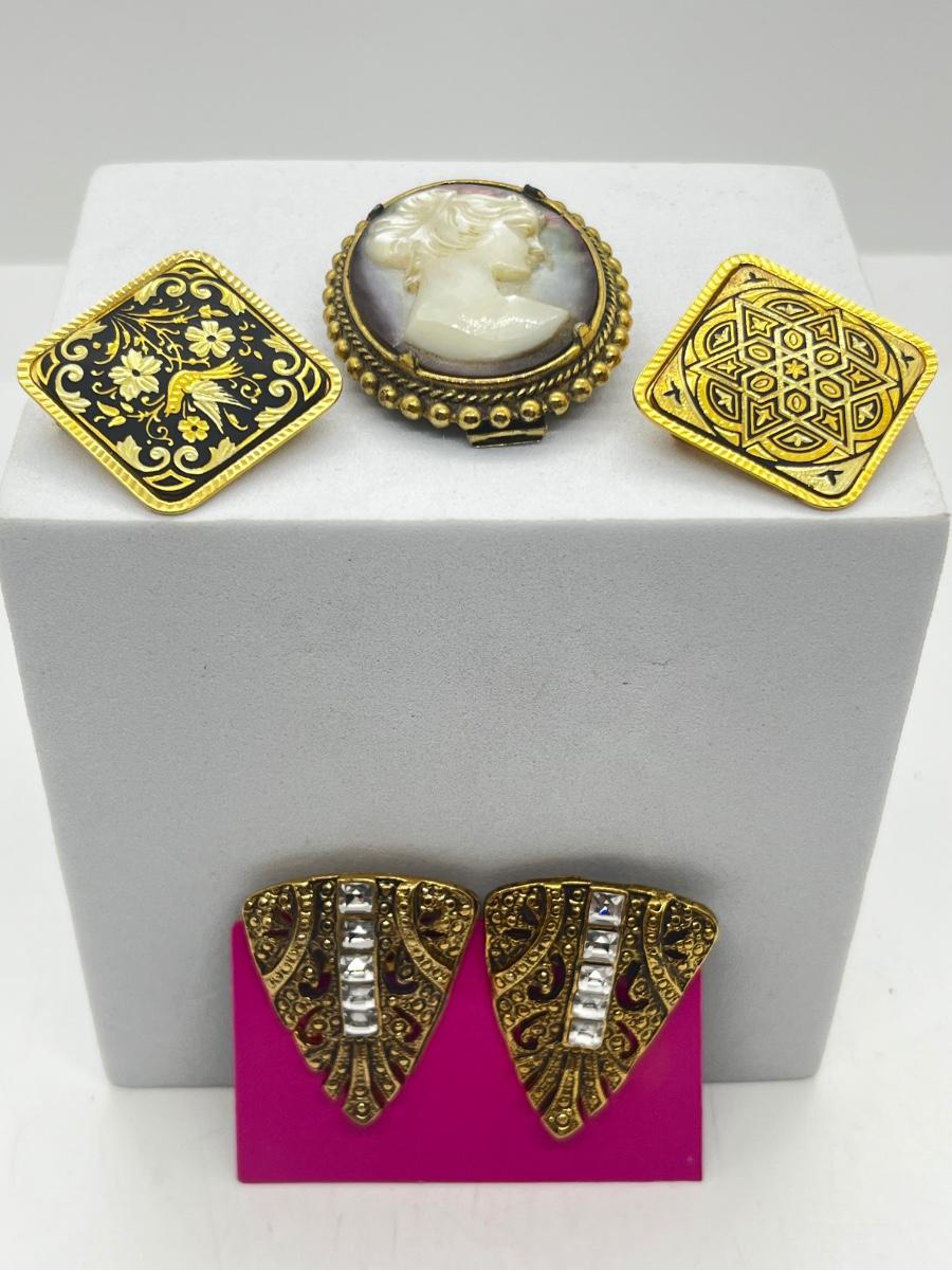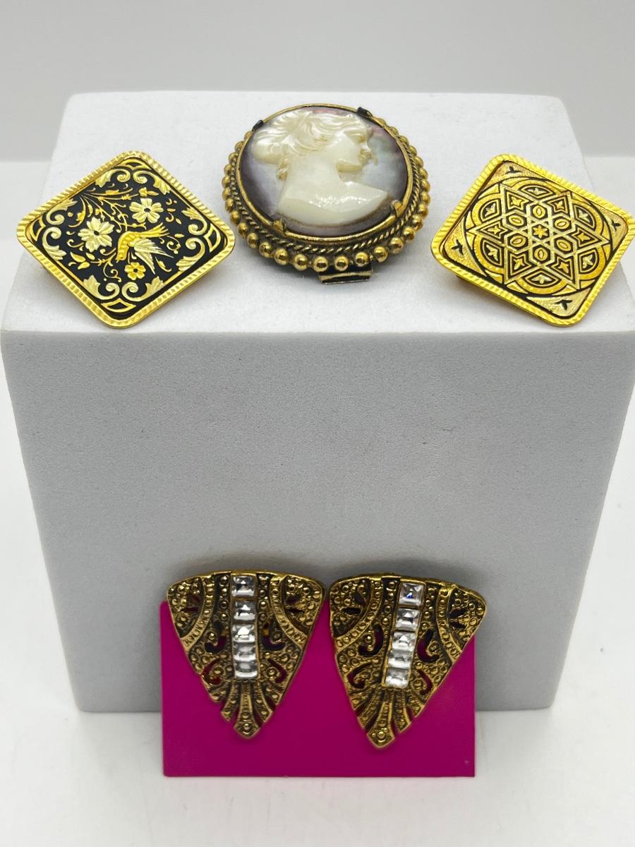 LOT 131: Two Damascene Square Brooches/Pins With Trombone Clasps, Cameo Brooch/Pin, and "Blue He" Shoe Clips
