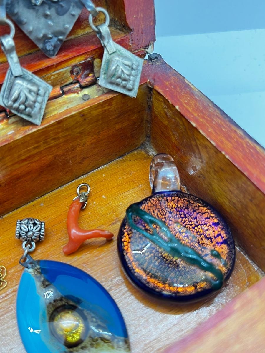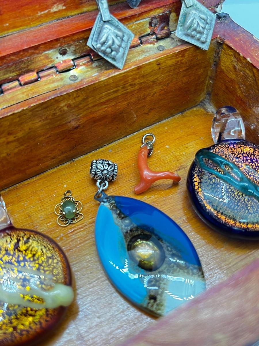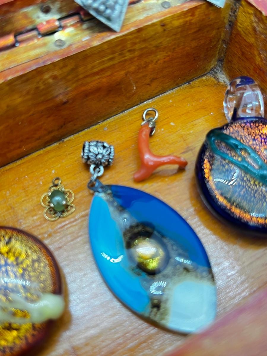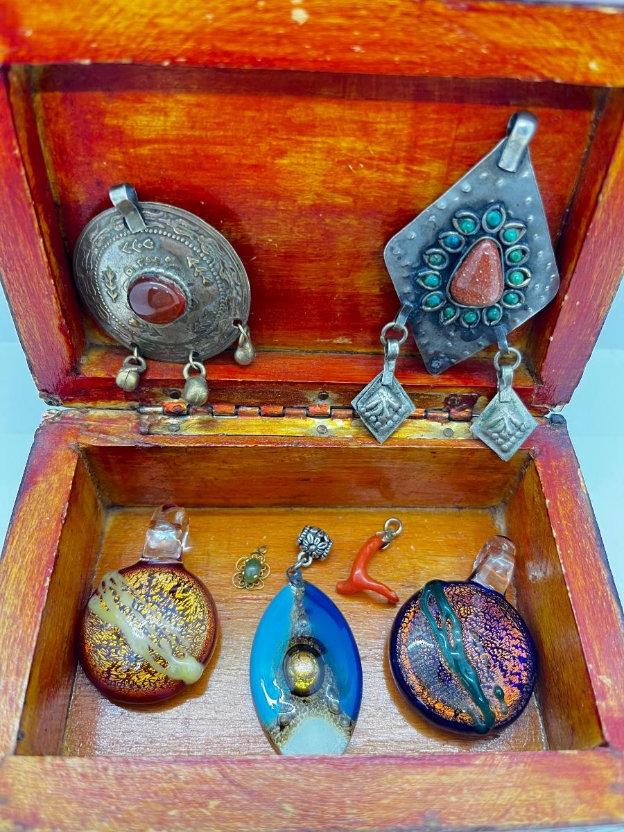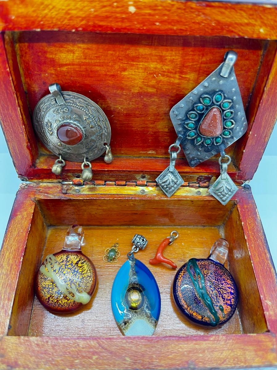 LOT 146: Three Art Glass Pendants, Tiny Jade Pendant, Branch Coral Pendant, Cinnabar Round Pendant and More!