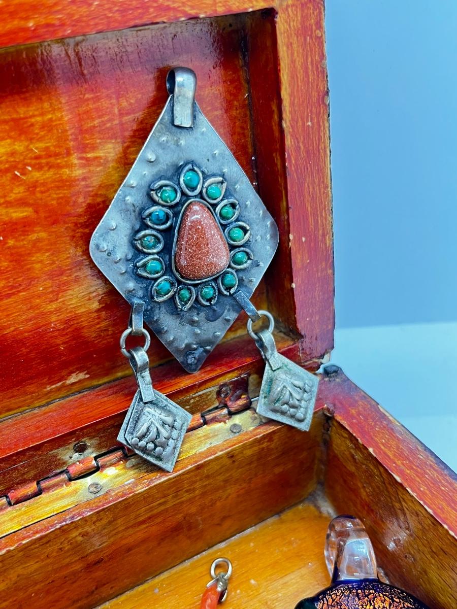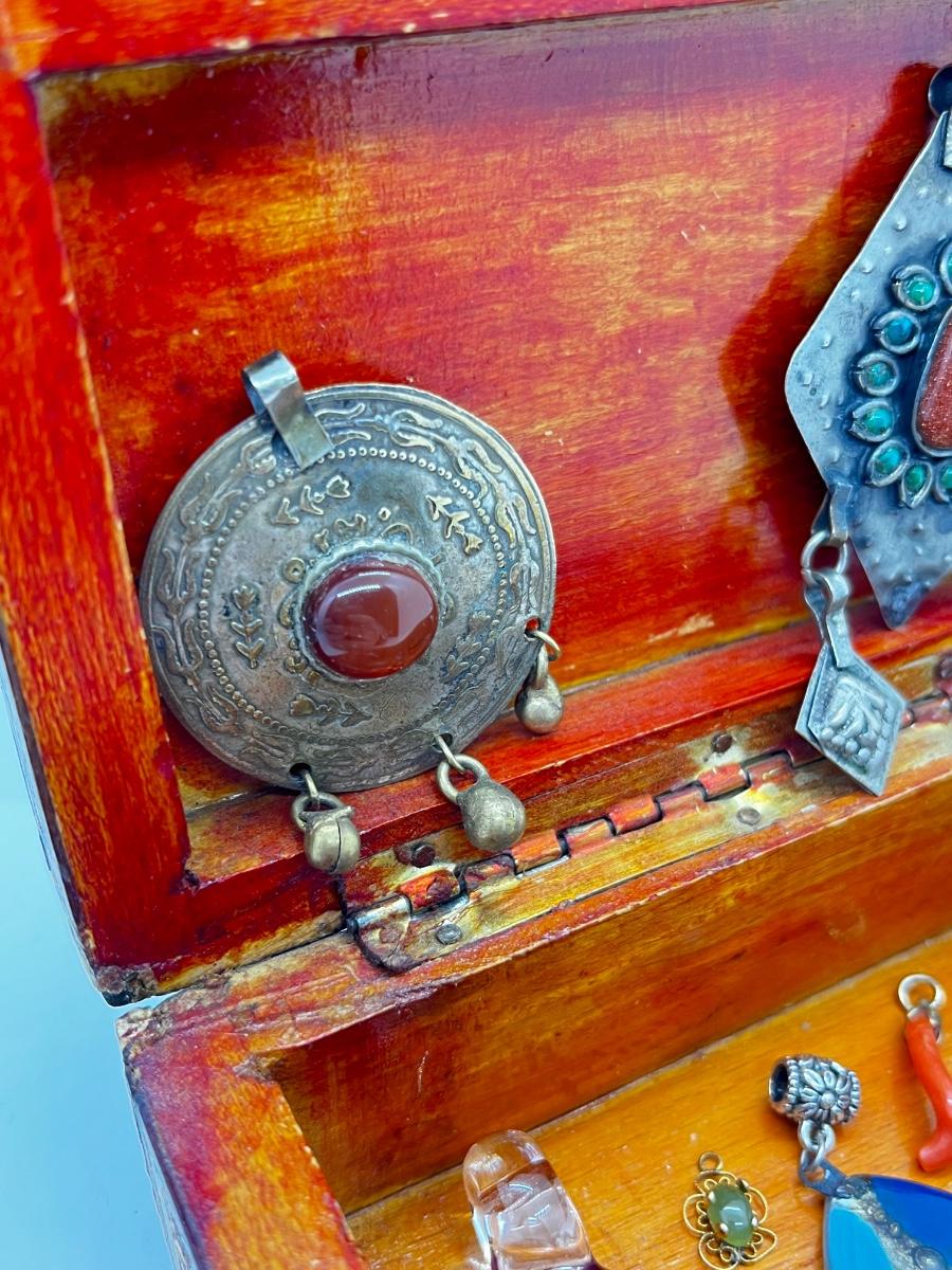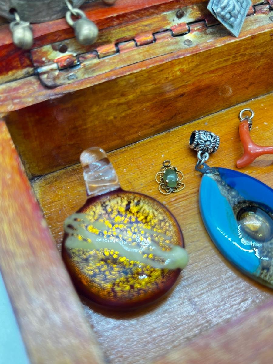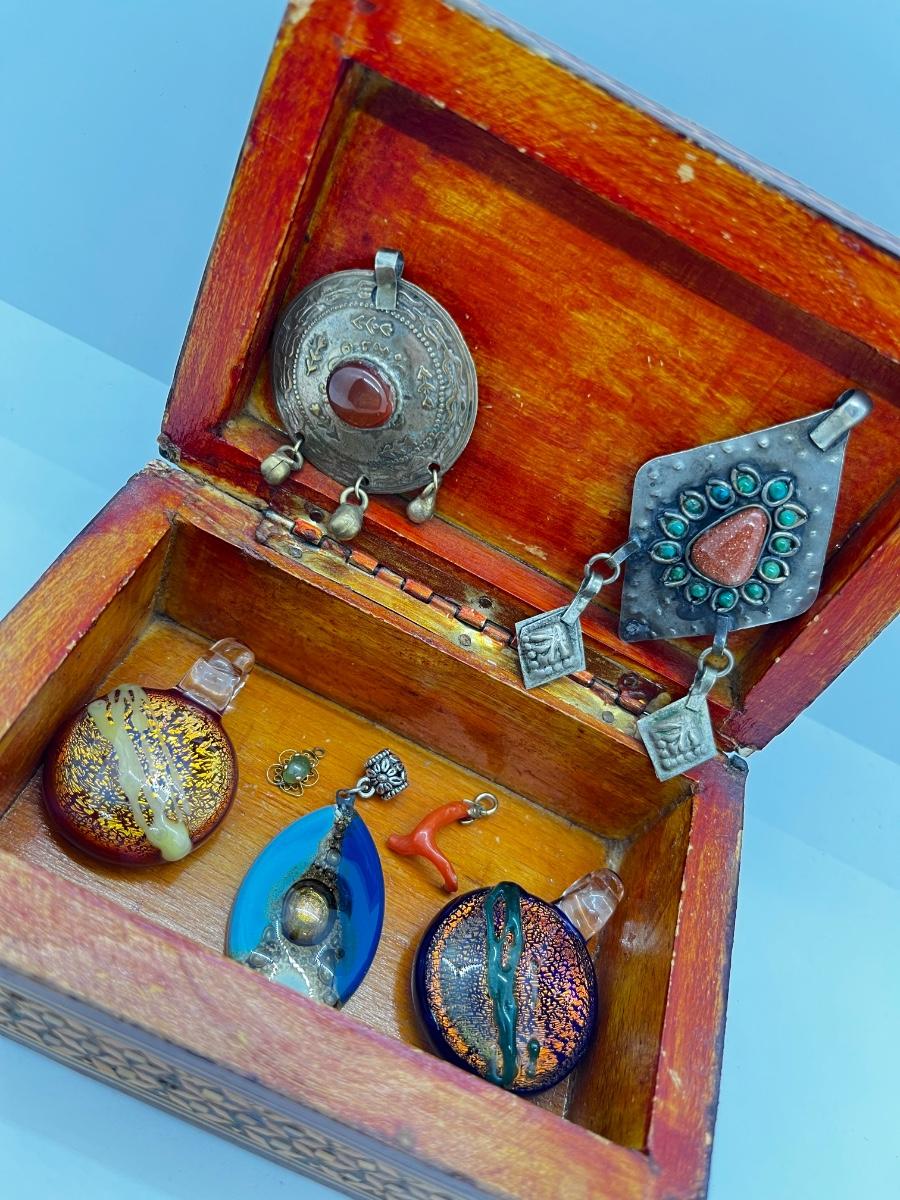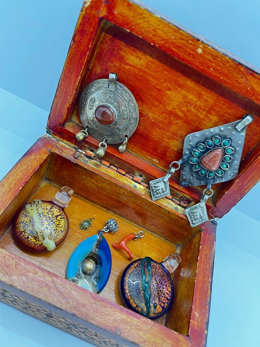 LOT 146: Three Art Glass Pendants, Tiny Jade Pendant, Branch Coral Pendant, Cinnabar Round Pendant and More!